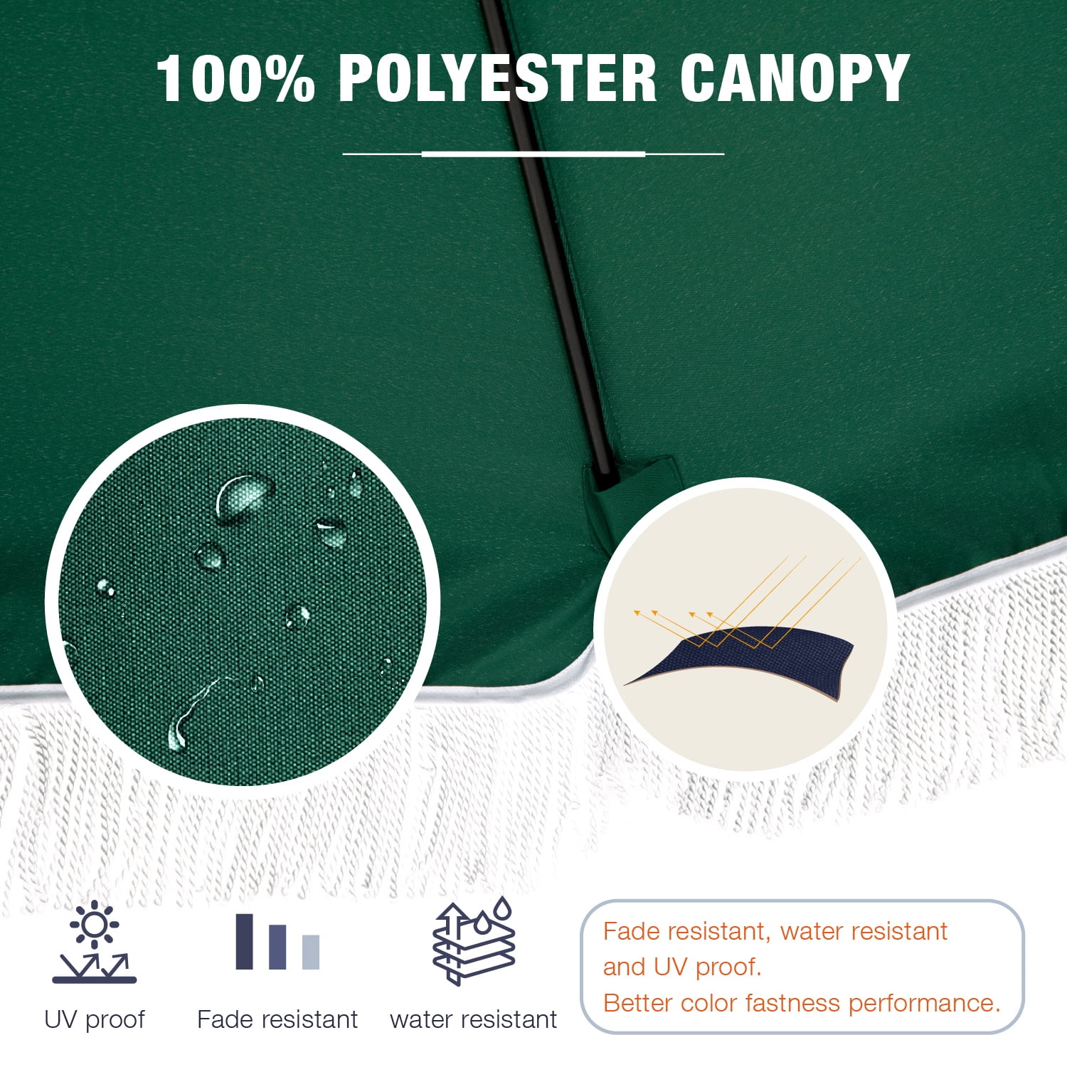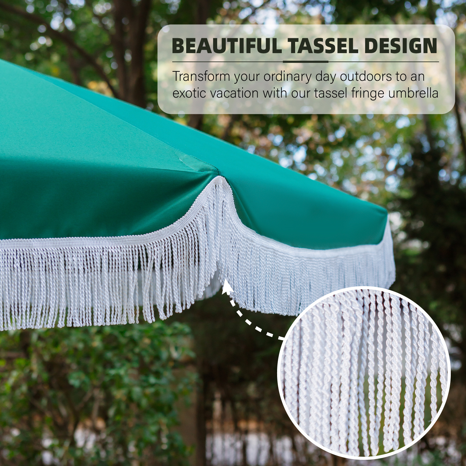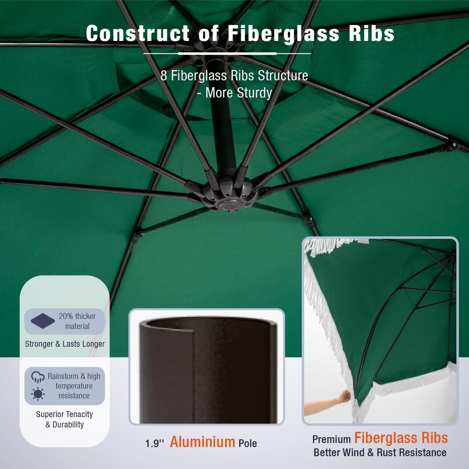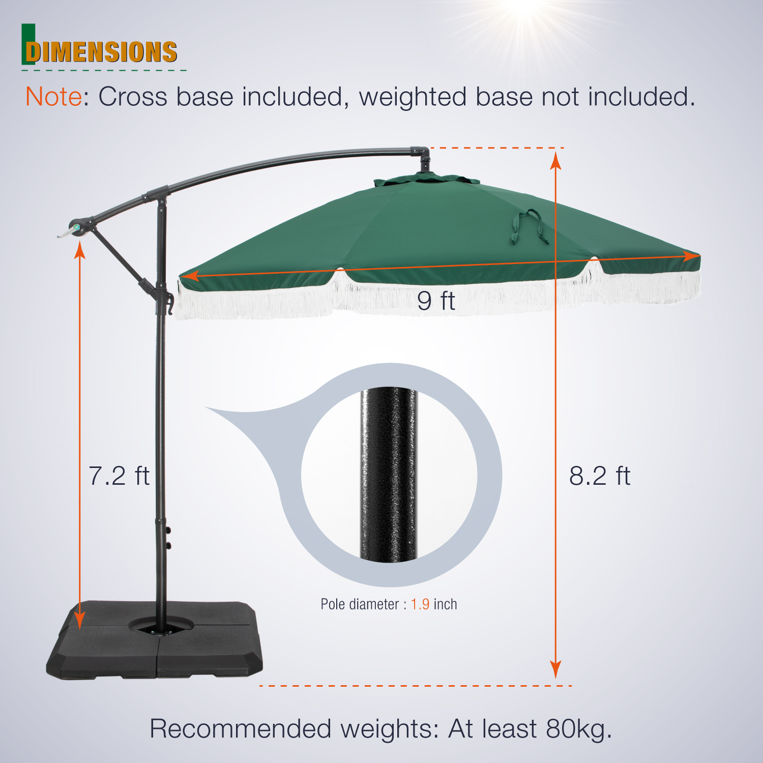 Enhance your outdoor aesthetic with our brand new tassel designed offset cantilever patio Umbrella. With 8 reliable sturdy fiberglass ribs and powder coated aluminum pole, this hanging patio umbrella is rust-resistant, can provide strong and durable support for the umbrella canopy. Wind vent at the top to allow air and heat flow, reduce wind pressure to enhance stability and create cool experience. 100% polyester fabric canopy, water-repellent, UV resistant and fade-resistant. A smooth-turning crank make you easy to open or close the umbrella. Moreover, beautiful tassel edge umbrella will add a fresh look and unique appearance to your patio or outdoor space. Ideal for the backyard, lawn, and garden. Transform your ordinary day outdoor to an exotic vacation with our tassel fringe umbrella. Specifications: Color: Beige/Baby Blue/Navy Blue/Green Material: Aluminum pole, fiberglass ribs, 100% polyester fabric Opening Mechanism: Crank handle design Coverage Area: 64 sqft coverage Pole: Aluminum, 1.9″ Dia (48mm) Rib: 8 pcs fiberglass ribs Cross Base Included: Yes Dimension: 9 x 9 x 8.2 ft Package Include: 1 x 9ft Patio Offset Umbrella with cross base 1 x Instruction Summit Living 9FT Offset Patio Umbrella with Tassel Aluminum frame with Fiberglass Ribs Green