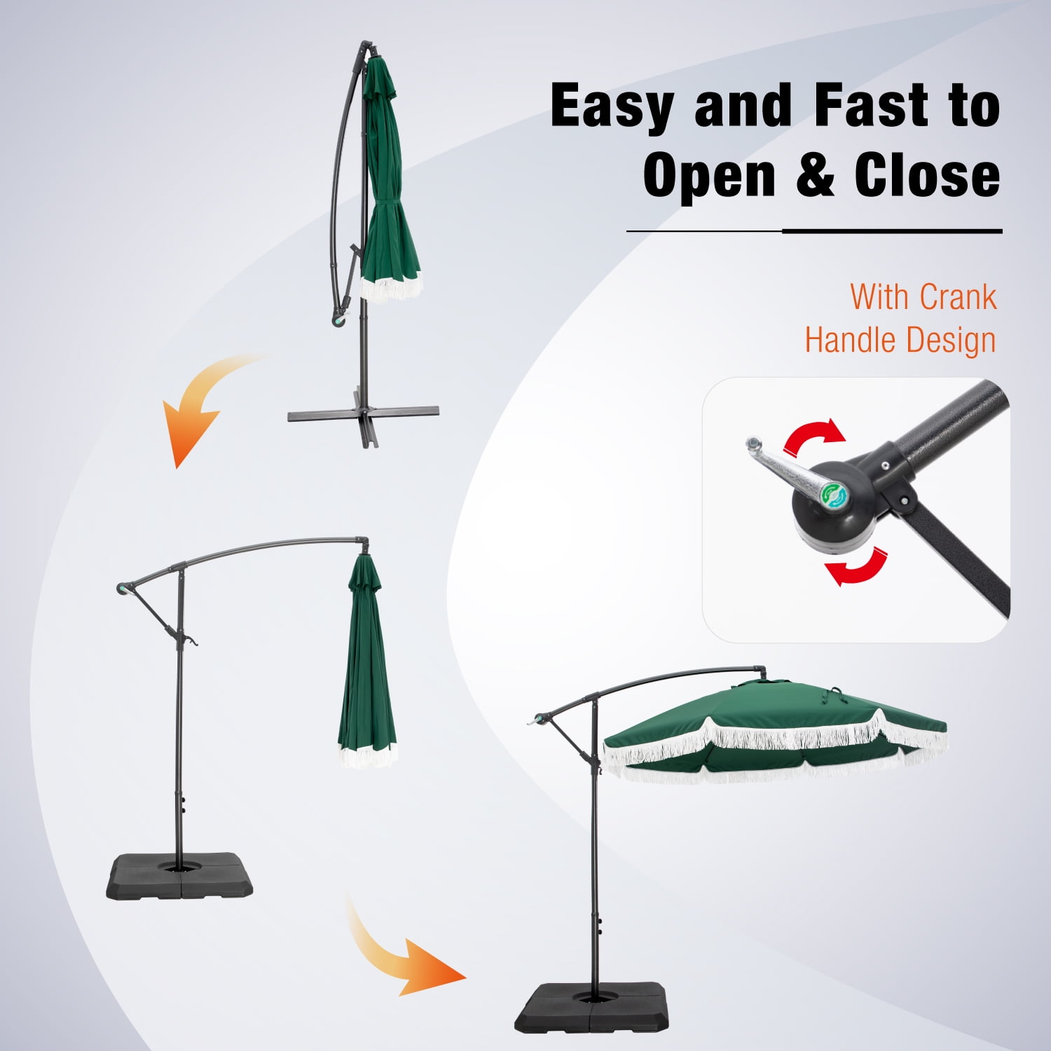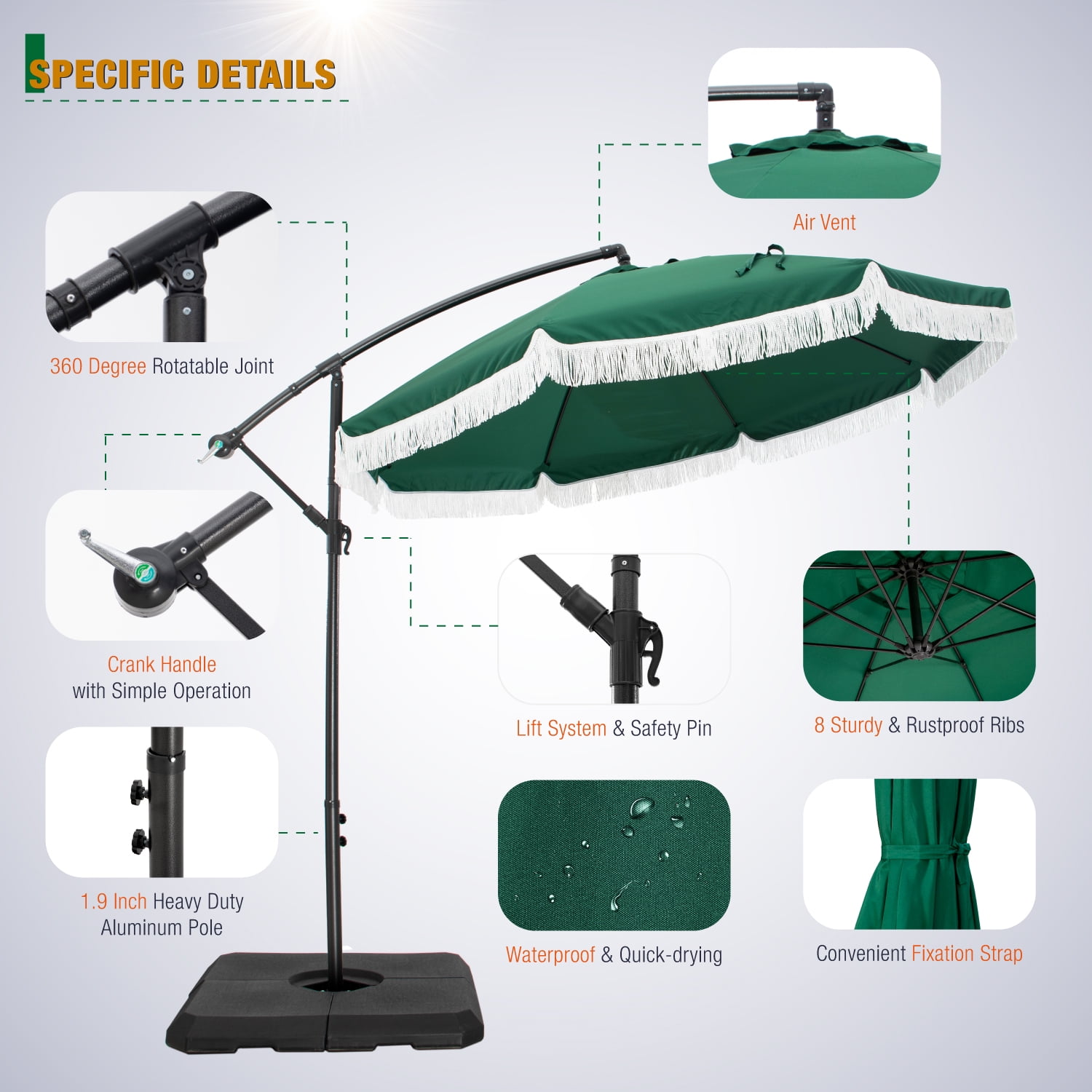 【Stylish TasselDesign】Stylish Tassel designed patio umbrella will add a fresh look and unique appearance to your patio or outdoor space. Ideal for the backyard, lawn, and garden. 【Aluminum Pole& Fiberglass Ribs】The 9ft patio offset umbrella supported with a thick Aluminum pole (1.9″) which has a powder coated surface, making it rust-proof, corrosion-proof and great for outdoor using. With 8 strong fiberglass ribs, this umbrella can maintain stability in the breeze and will not be blown over easily. High-quality material can be used for many years. 【UV-resistant Fabric】100% polyester fabric canopy, water-repellent, UV resistant and fade-resistant. Wind vent at the top to allow air and heat flow, reduce wind pressure to enhance stability and create cool experience. 【Crank Design】Umbrella easily opens and closes with crank and cantilever operation. 【Cross BaseIncluded】Cross base included. Weights are not included(Recommended weights: 4pcs x 44 lbs+). Please keep this umbrella closed when not in use. 【1 Year Warranty】We offer a guaranteed 1-year warrantyfor this outdoor umbrella, for customer support, questions and concerns, please contact Customer Service at [email protected] or dial our free service line, 877-606-2818. We promise to respond to any customer message within 24h.