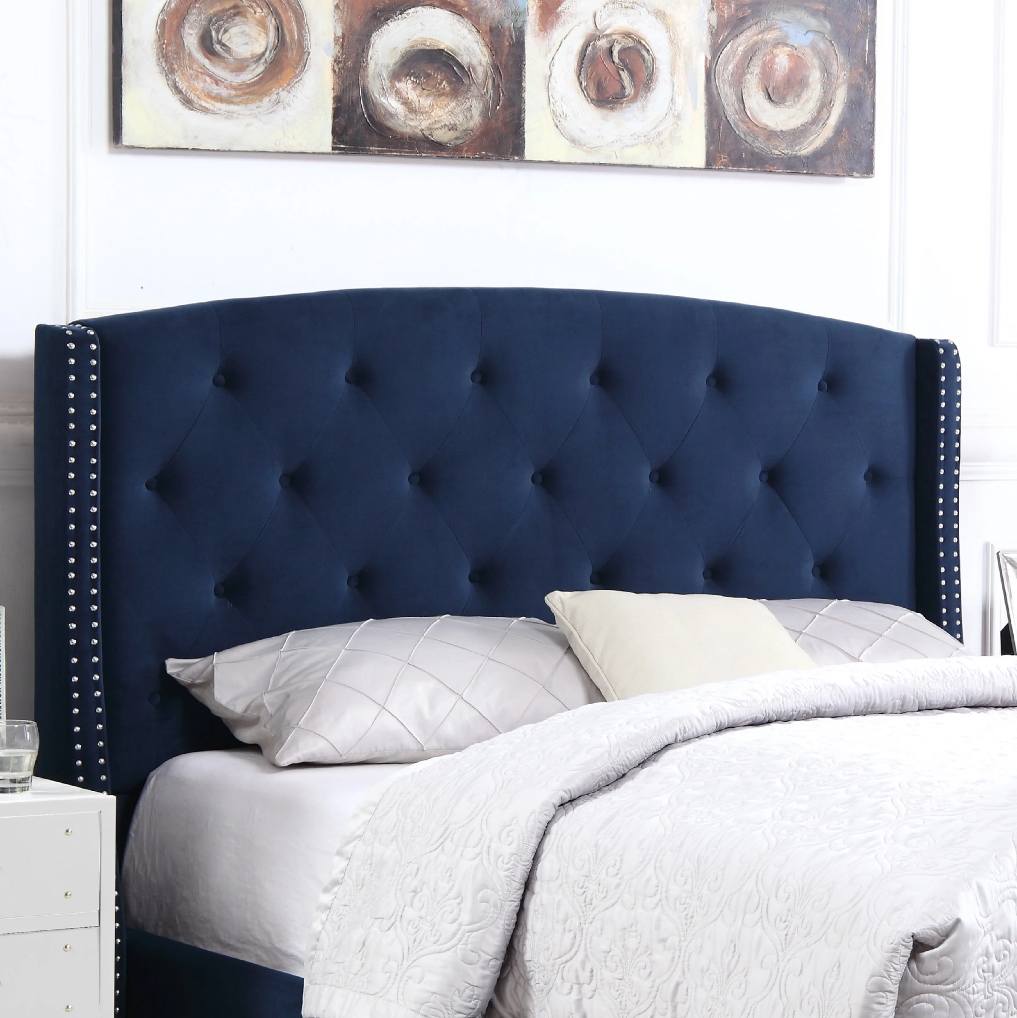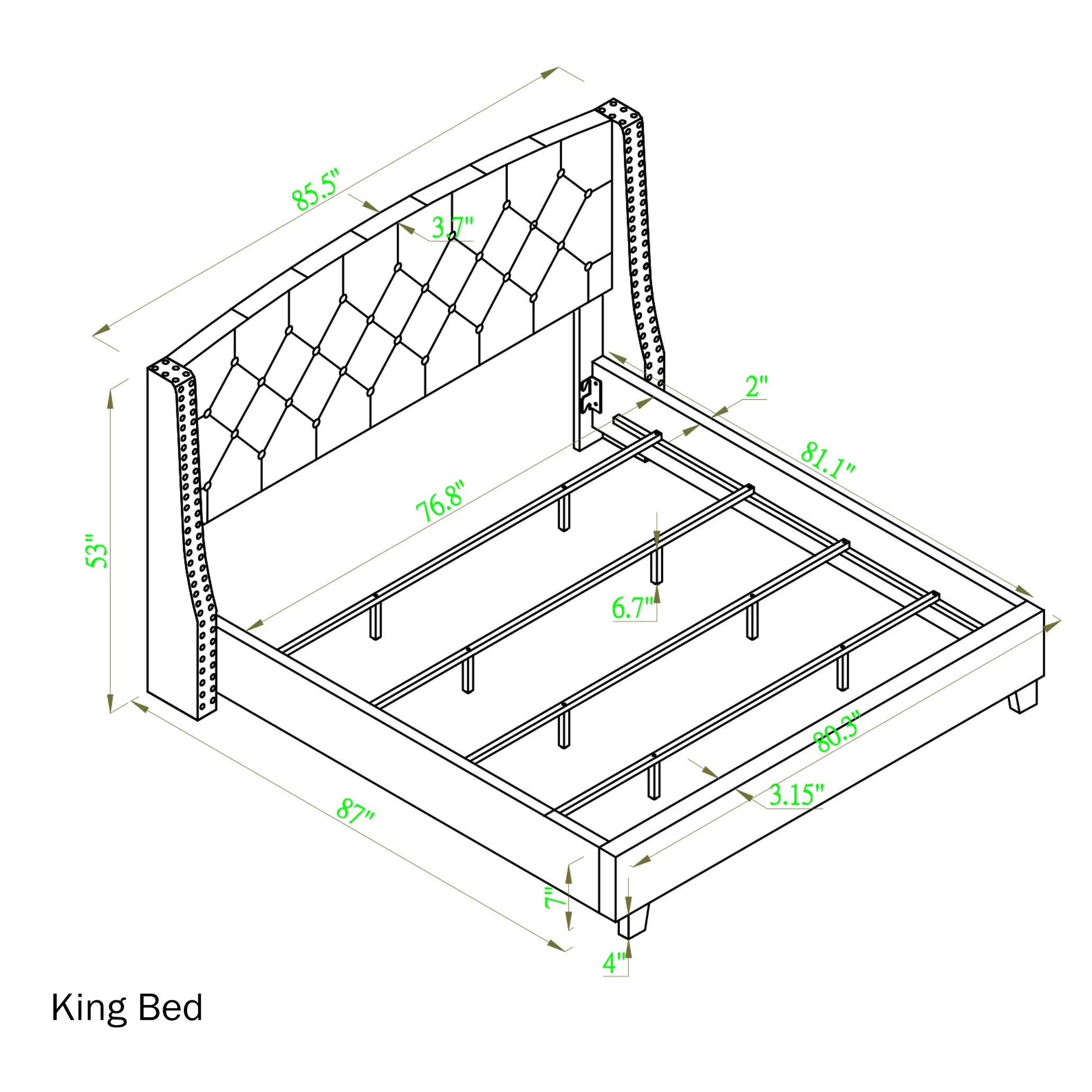 Choose from available sizes. Upholstered shelter bed styling Engineered wood internal frame. Upholstered in velvet fabric Button tufting and nailhead trim to create a sophisticated look you’ll love Sep up dimension: 70″ x 86″D x 56″H Some assembly required. Photo may slightly different from Actual Item in Terms of color due to the Monitor’s display
