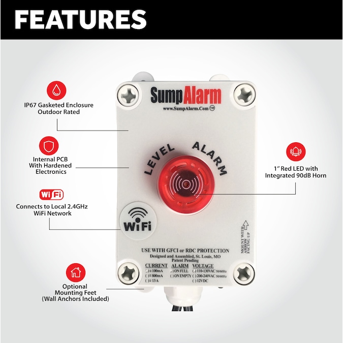 This Industry leading Indoor and Outdoor 120 V Wi-Fi Enabled High/Low Water Alarm Indicates Visually and Audibly When Liquid Level is too High (90db horn). It Can be Used in Sump Pumps, Water Tanks, Lift Stations, Low Density Oils and Sewage Water. Product Activates When the Water Level in the Basin or Sump Rises Above the Desired level. The 2.4GHz Wireless Enabled Sump Alarm Can Notify You Externally Free Email, Text and or Phone Call, Monitor your Sump from Anywhere in the World. The large (1 inch) LED Indicator Light is Visible from a Distance. This Product Comes with a 6 Ft. 3 Prong Grounded Plug and a 16 Ft. Tethered Water Boss Float. The Operating Temperatures for this Product are -40 deg F to 140°F. Product is Ready to Operate out of the Box, Including Four Rear Mounting Holes, Mounting Feet, Wall Anchors, Hardware, and Wire Ties to Simplify Installation. Homeowners Insurance Discounts for Smart Home Devices May Apply.