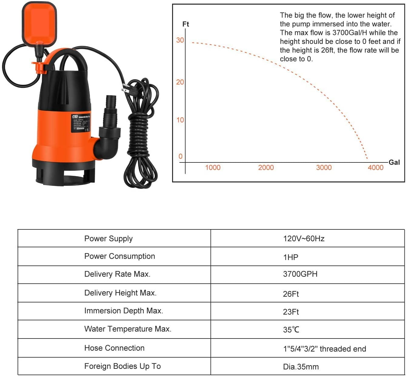 【Kindly Tip】When you start use the pump you must be submerged into the water at a slight angle to allowthe remaining air to escape. 【1HP High Power】Prostormer Sump Pump uses 1HP power, which is more efficient than ordinary 3/4HP sump pump; Max 3700 Gallon Per Hour rating tackles any draining job at a fraction of the time. 【Multi Outlet Sizes】3 different diameters outlets (1 inch ,1-1/4 inch, 1-1/2 inch) to adapte for different size hoses as needed according to the flow rate. The bigger the flow is, the wider the outlet should be. 【Keep Open Mode】When you put the float switch locked on the sump pump, the sump pump will keep working all the time. Once the pump can not pump any water, you should cut off the power immediately to prevent the coil from getting burned. 【Automatic ON/OFF Mode】The float switch should be unlocked from the pump. When the water level rises above the pump, the pump will start working automatically under the control of float switch. When the pump fails to pump water, it will automatically disconnected the power. 【Sealing Structure & Durable Construction】The sump pump features a durable sealing structure and the durable thermoplastic body keeps the pump from corrosion. The higher base plate which assures the prevention of debris collection in the sump pit. product information: Color: orange Material: plastic, alloy Style: 1HP submersible pump Energy source: alternating current Voltage: 120 volts Horsepower: 1 horsepower Maximum power: 0.7 kW Maximum flow: 61.67 gallons per minute Cable length: 16 feet End: With automatic float switch Usage: Clean/dirty water pump
