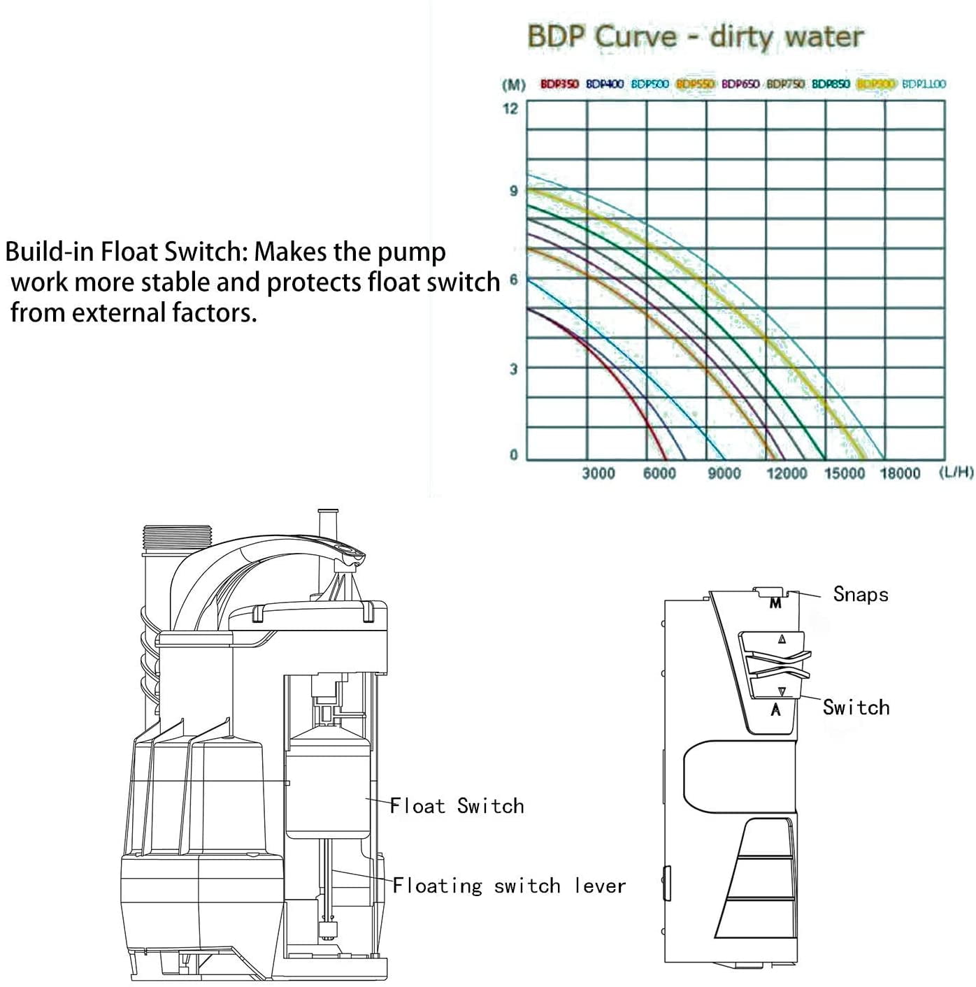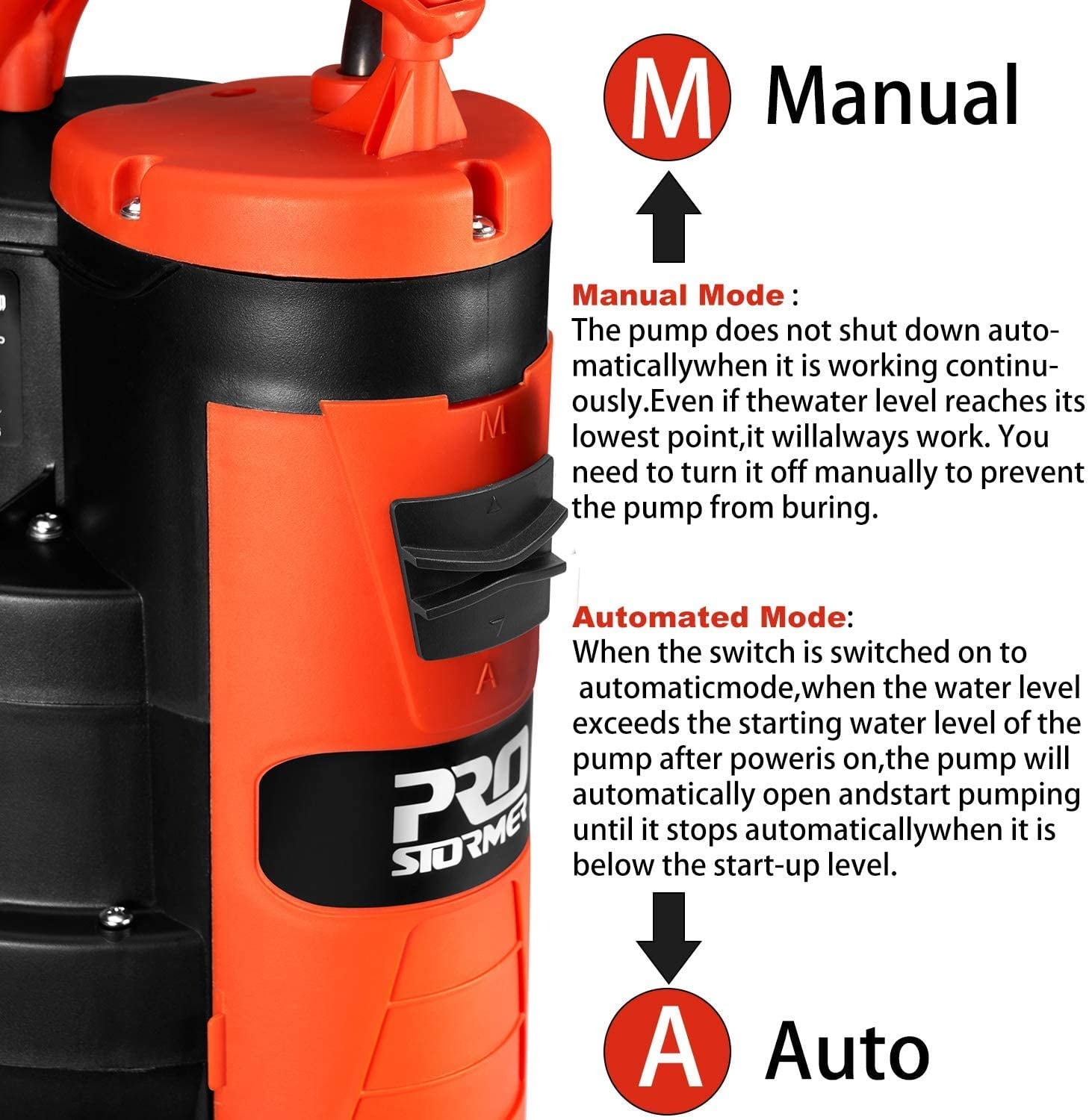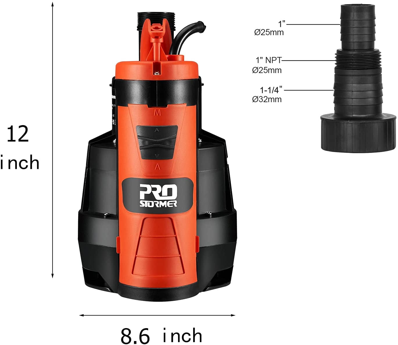 Kindly Tip 1: When you start use the pump you must be submerged into the water at a slight angle to allow the remaining air to escape. Kindly Tip 2: The device is not suitable for continuous operation (e.g.as recirculation pump for ponds). This type of use will substantially shorten the pump’s life expectancy. 1HP High Power: Prostormer Sump Pump uses 1HP power, which is more efficient than an ordinary 3/4HP sump pump. Max 3500GPH rating tackles any draining job at a fraction of the time. Multi Outlet Sizes: 3 different diameters outlets (1 inch, 1-1/4 inch, 1-1/2 inch) to adapt for different size hoses as needed according to the flow rate. The bigger the flow is, the wider the outlet should be. Manual Mode: Set the switch to the MANUAL position the pump will now not automatically switch off but carry out pumping, even if the remaining water level is reached and the pump runs dry. You should cut off the power immediately to prevent the coil from getting burned. Automated Mode: Set the switch to the AUTO position. Once you have plugged the device into the socket, the pump will switch on automatically when the water exceeds the start-level and switch off when the stop-level has been obtained. This means that the pump can be left on at all times and will keep the water in a cellar or boat, for example, at the required level. Bear in mind that this pump is not designed to be used continuously, it must be switched off at regular intervals. Sealing Structure & Durable Construction: The sump pump features a durable sealing structure, and the durable thermoplastic body keeps the pump from corrosion. The higher base plate which assures the prevention of debris collection in the sump pit. Product Information: Color: Orange, Black Material: Plastic, Alloy Style: 1HP sewage pump Energy source: Alternating current Voltage: 120 volts Horsepower: 1 horsepower Maximum flow: 58.33 gallons per minute Maximum lifting height: 26 feet Cable length: 16 feet End: Submersible clean/dirty water pump Usage: Built-in float switch