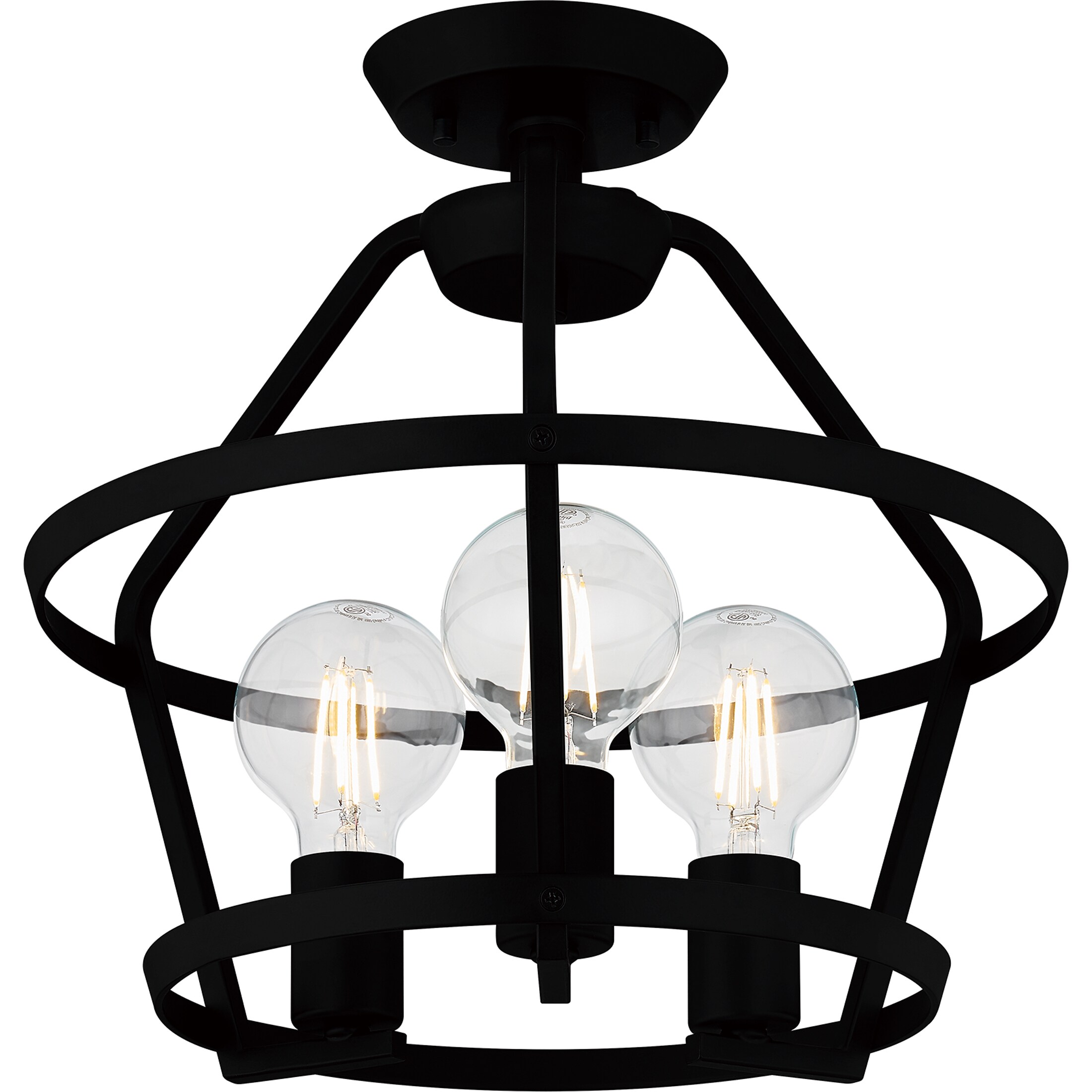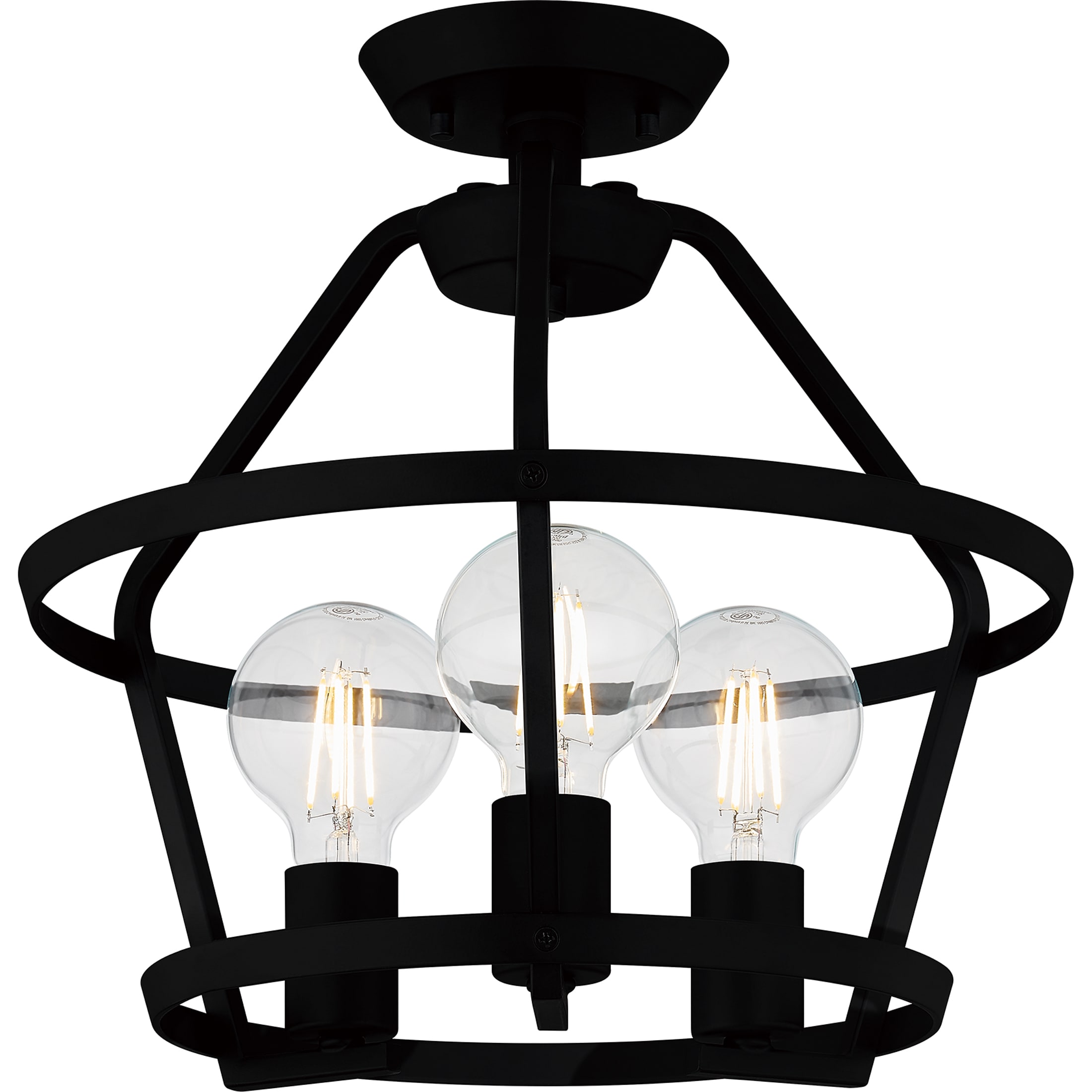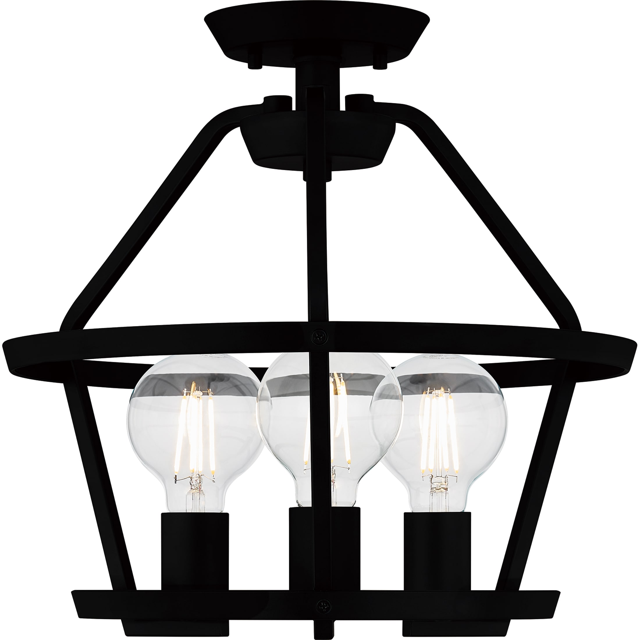With an open framework and weathered styling, the Sumpter semi-flush mount light offers updated farmhouse appeal. The slender metal body is finished in a sleek matte black that easily blends with any design style. Looks best when paired with vintage filament bulbs to provide soft, ambient light. Shop the rest of the Sumpter collection for chandelier and pendant options.
