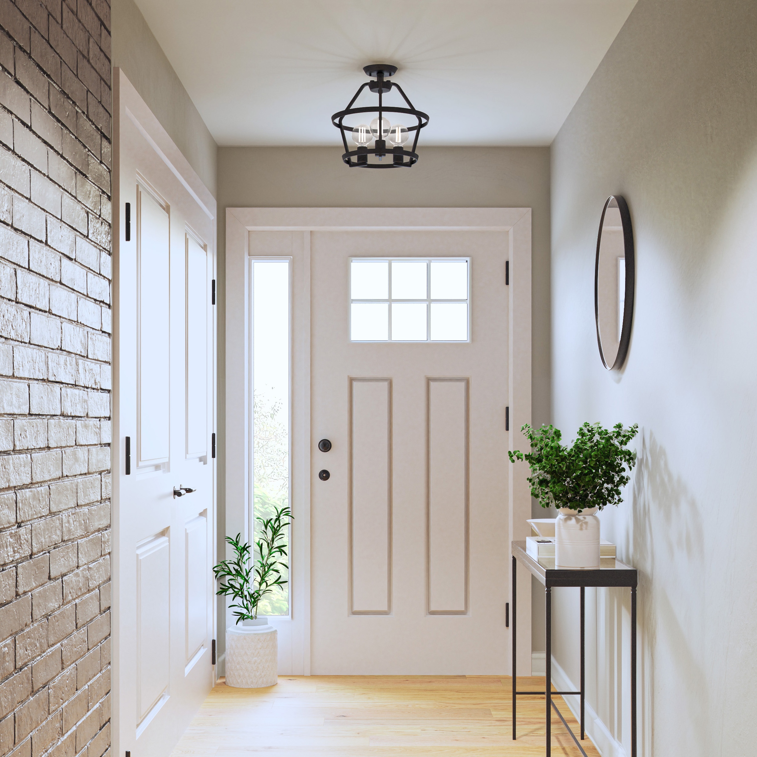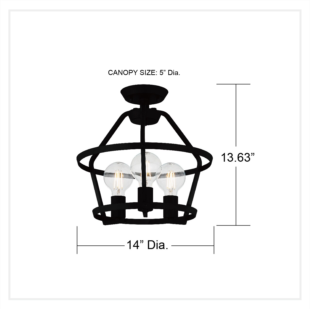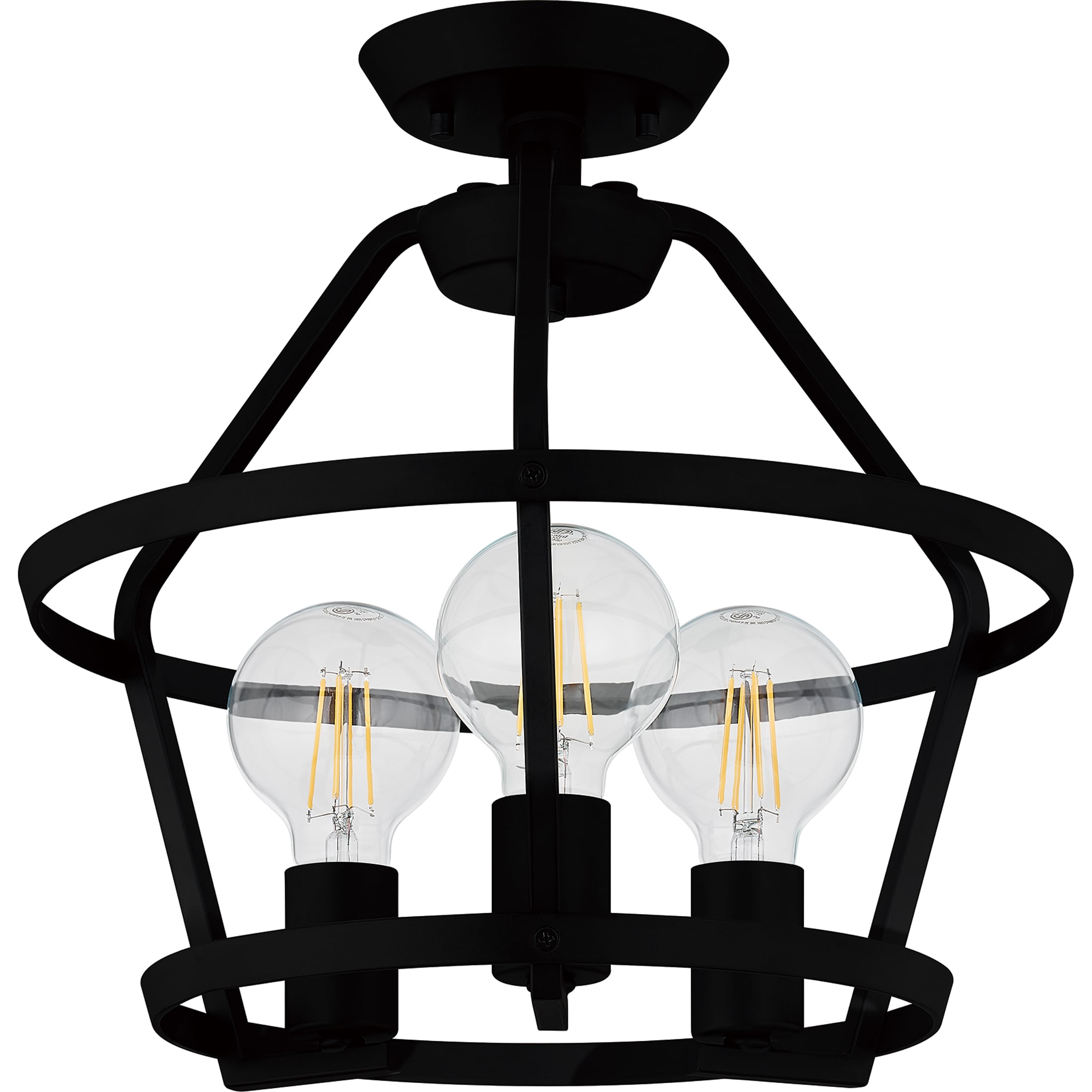 With an open framework and weathered styling, the Sumpter semi-flush mount light offers updated farmhouse appeal. The slender metal body is finished in a sleek matte black that easily blends with any design style. Looks best when paired with vintage filament bulbs to provide soft, ambient light. Shop the rest of the Sumpter collection for chandelier and pendant options.