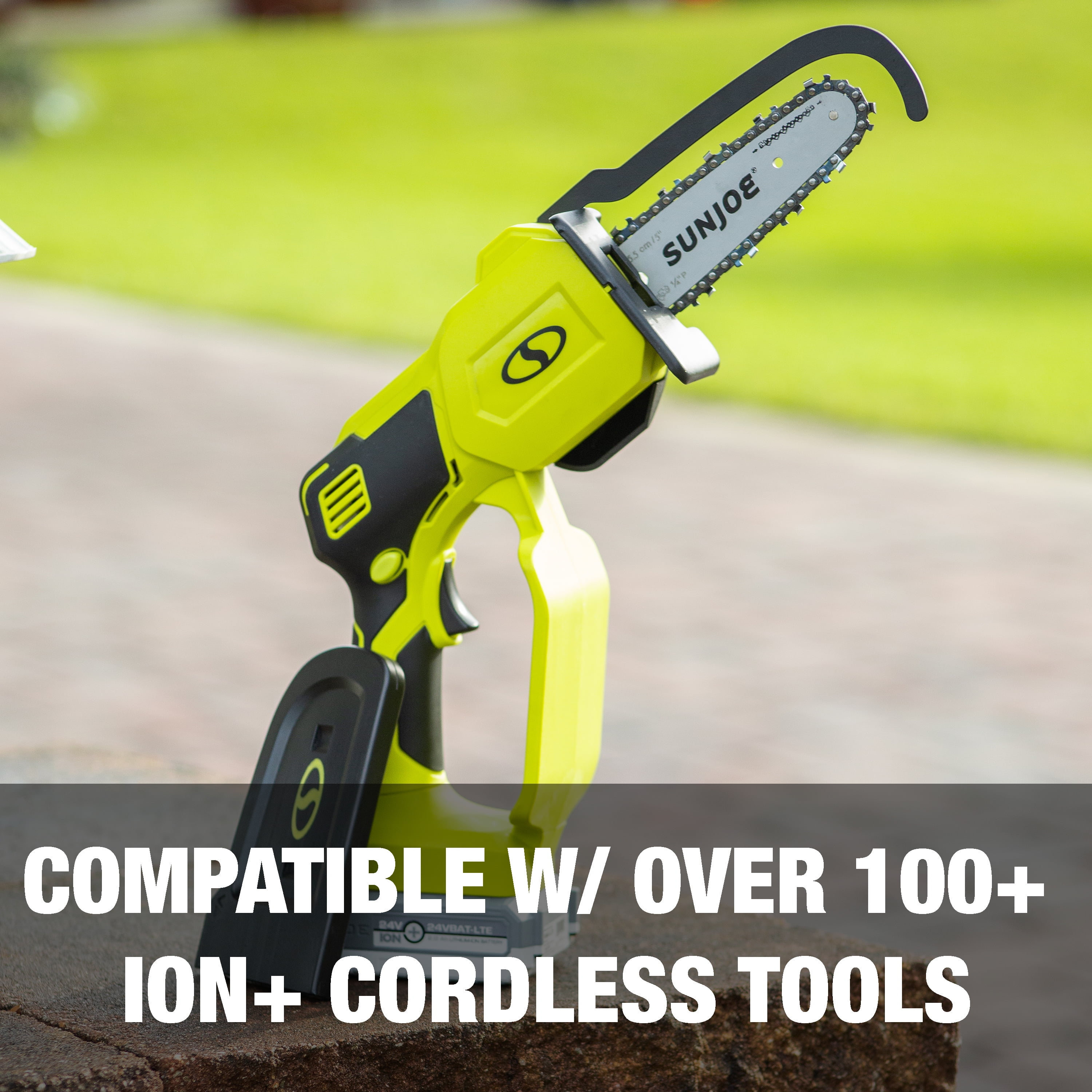 IONMAX 24-Volt System — Includes 2.0-Ah battery for up to 25 mins of runtime 230 W brushless motor runs cooler, quieter, and longer than traditional motors 5″ compact bar + chain starts up with just the squeeze of a trigger Ideal for pruning green, growing branches, and woody stems up to 4.5″ thick Built-in safety features: Chain + hand guards & a safety switch Refillable oil bottle capacity: 0.7 fl oz Included battery recharges in just 5 hours Lightweight + compact at just 5.5 lbs! SGS Listed/2-Year Warranty