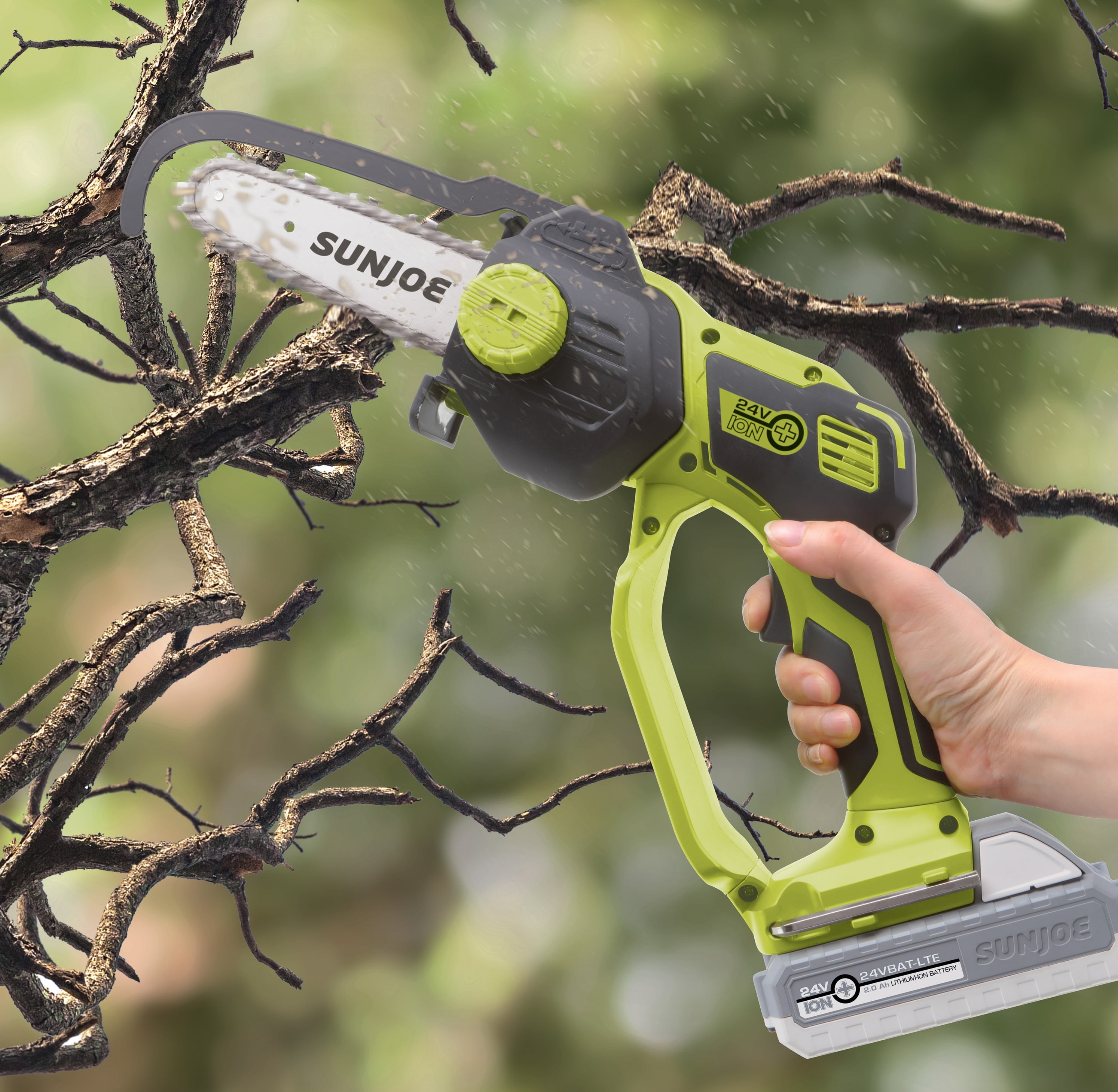 SEE IT? SAW IT! Trim overgrown branches with the 24V Cordless Handled Pruning Saw from SUN JOE®. Powered by the exclusive 24V IONMAX System, the included 24-volt lithium-ion battery provides up to 25 minutes of continuous runtime! Now you can shape up the shrubs without the strain! Ultra-compact and lightweight, this 5″ pruning saw slices through branches, thatch, and topiaries up to 4.5″ thick. The easy, one-handed operation makes it easier than ever to trim, saw, cut, and prune even the most unruly of plants! Ideal for green wood, woody stems, twigs and branches, Sun Joe provides a clean, precise cut to allow your plant to heal, while eliminating the stress and strain associated with squeezing conventional manual pruners. Cutting is as simple as squeezing the trigger! Plus, every Sun Joe IONMAX tool is backed by our rock-solid 2-year warranty, for worry-free operation, season after season. So, prune like a PRO and Go With Joe®! The 24V Cordless Handheld Pruning Saw from SUN JOE. GET EQUIPPED®.