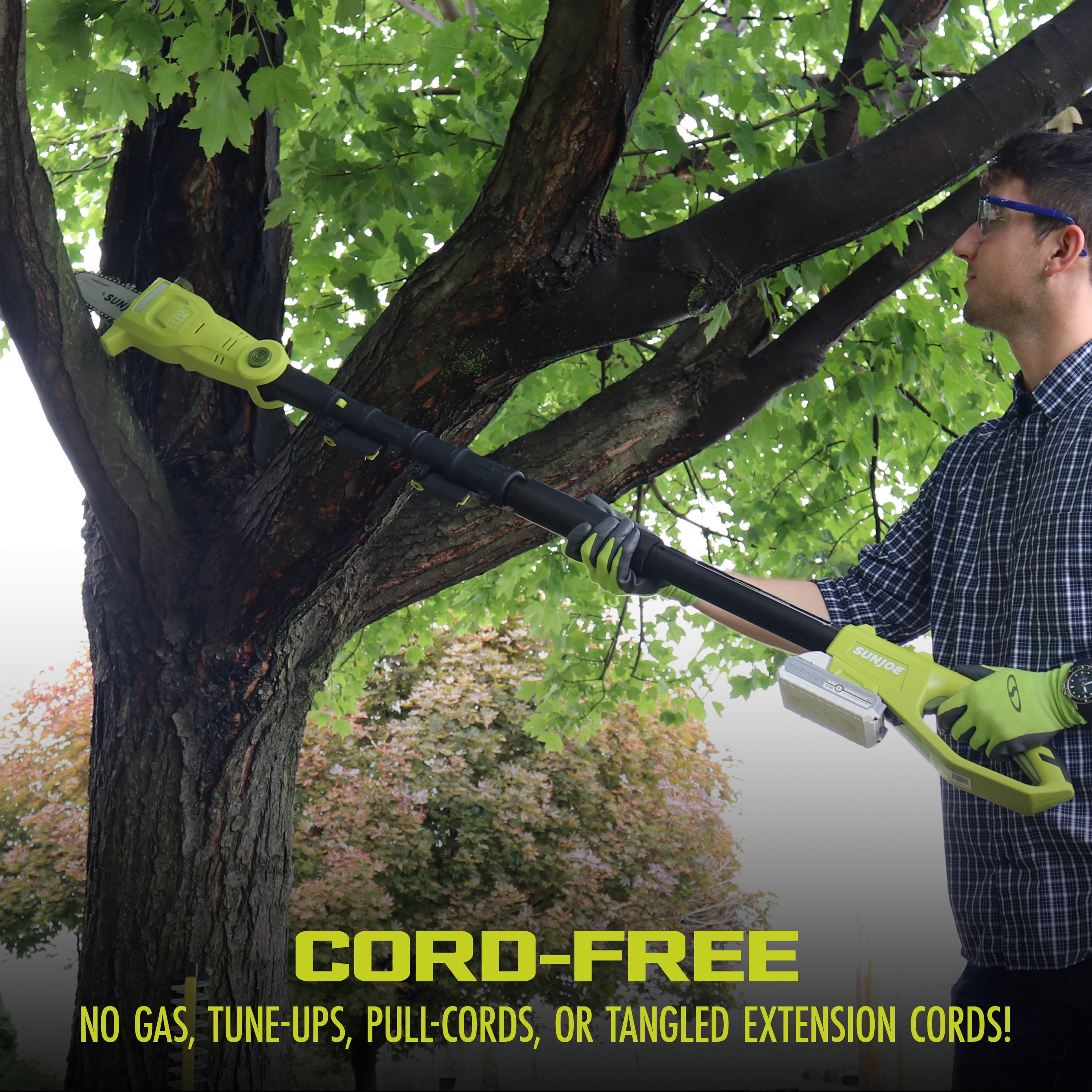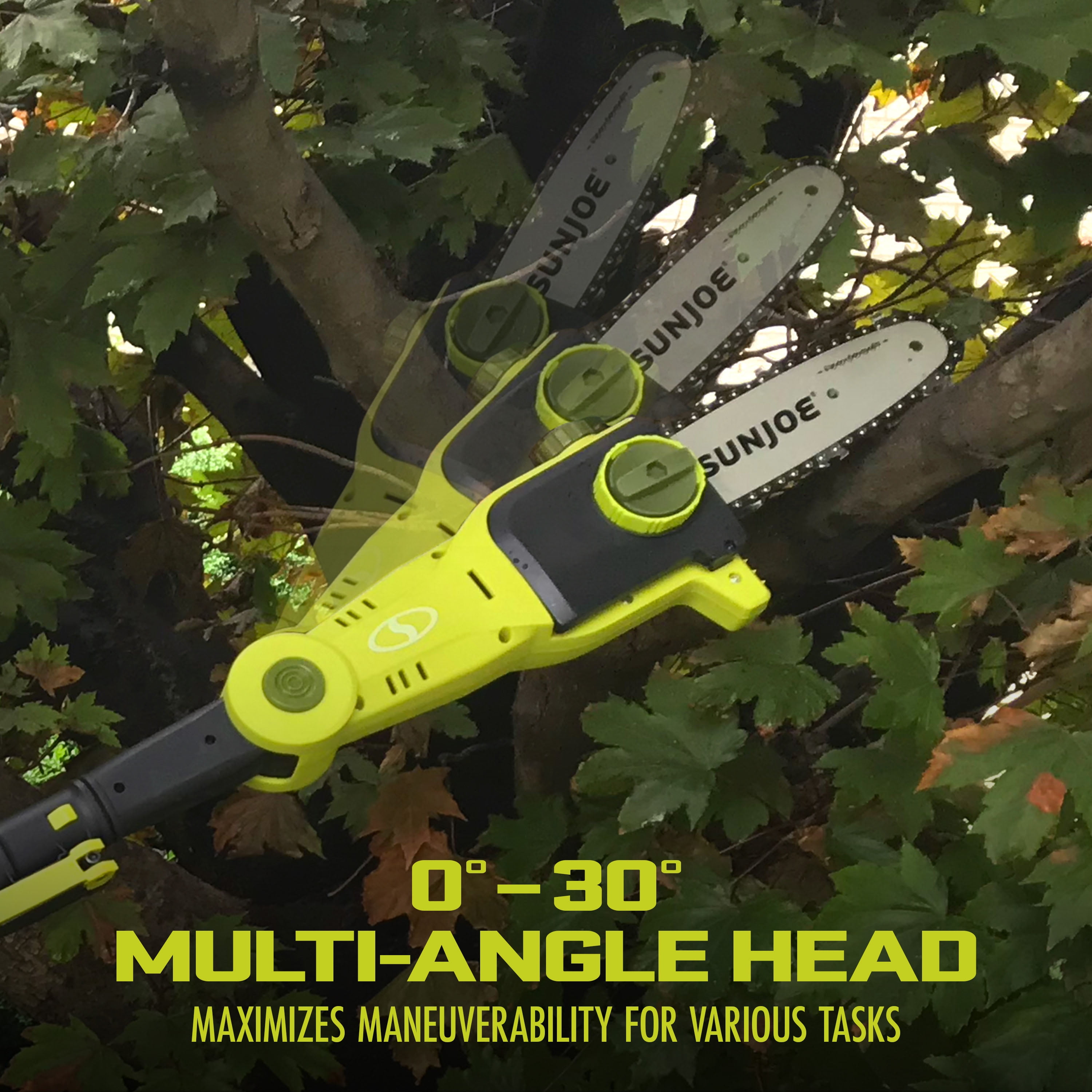 SEE IT? SAW IT — WITH SUN JOE! Cut your tree trimming tasks down to size and tackle those tough-to-reach branches with ease with the 24V-PS8-LTE 24-Volt 8-Inch Cordless Pole Chain Saw from SUN JOE. Powered by SUN JOE’s exclusive 24-Volt IONMAX Battery System, 24V-PS8-LTE’s 2.0 Ah lithium-ion rechargeable battery offers up to 40 minutes of runtime and charges up in just 80 minutes. IONMAX offers the all of the power and performance of gas with the best of cordless convenience for all your outdoor chores — and no emissions, fumes, fuss, or tangled extension cords. Cut The Cord® and cut a cord of wood, or trim a load of limbs and logs, all while standing safely on solid ground! SUN JOE takes the danger and difficulty out of trimming overgrown trees. Trim out-of-reach branches with the telescopic pole — which extends from 3.7 ft to 7.2 ft — to provide up to 14 ft of overhead reach. Powered by a robust 350 W motor and revolutionary lithium-ion battery power, 24V-PS8-LTE’s multi-angle head can quickly adjust from 0º to 30º for maximum cutting control. And SUN JOE’s auto-lubricated 8-inch bar and chain can handle the most stubborn brush, branches, limbs and logs up to 7.5-inches thick. So, when you’re in the thick of things, cut your yard chores down to size and Go With Joe®: the 24V-PS8-LTE 24-Volt 8-Inch Cordless Pole Chain Saw from SUN JOE. GET EQUIPPED.