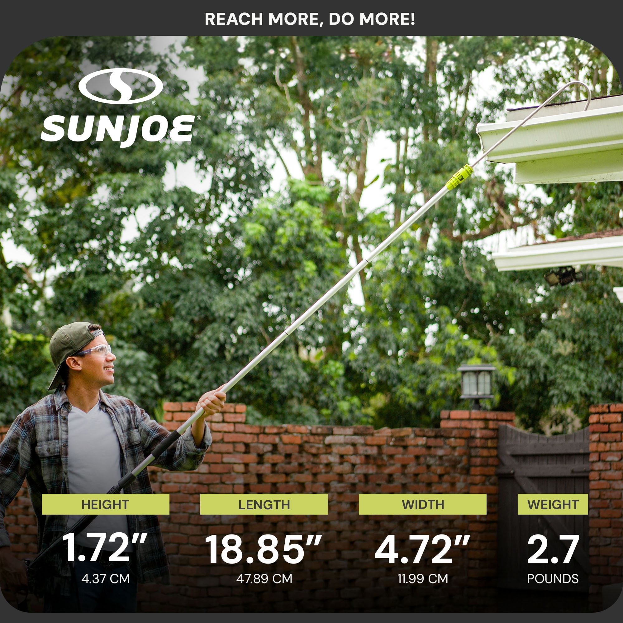 Aluminum pole extends to 5.5 feet providing up to 9 feet of reach Simple assembly plus non-slip foam grip for comfort control Quickly connects to your favorite Sun Joe SPX Series Pressure Washer No need for a ladder: extend your reach up to 9 feet to get to those out-of-reach areas such as gutters, siding, shutters, windows – and more Transfer adapter included*
