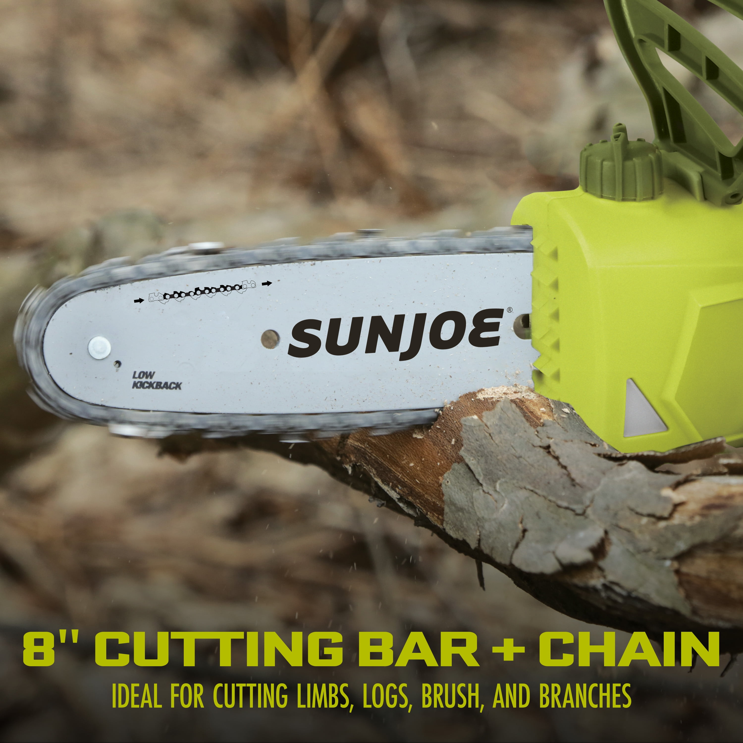 2 tools in 1 – swap tools in seconds to quickly convert from powerful pole chain saw to lightweight handheld chain saw Ideal for cutting overhanging limbs and thin logs, clearing brush and low branches Telescoping pole extends up to 8.9 feet for up to 15 ft overhead reach Powerful 6-amp electric motor cuts branches up to 7.5-inches thick 8-inch Sun Joe® cutting bar and chain with automatic lubrication