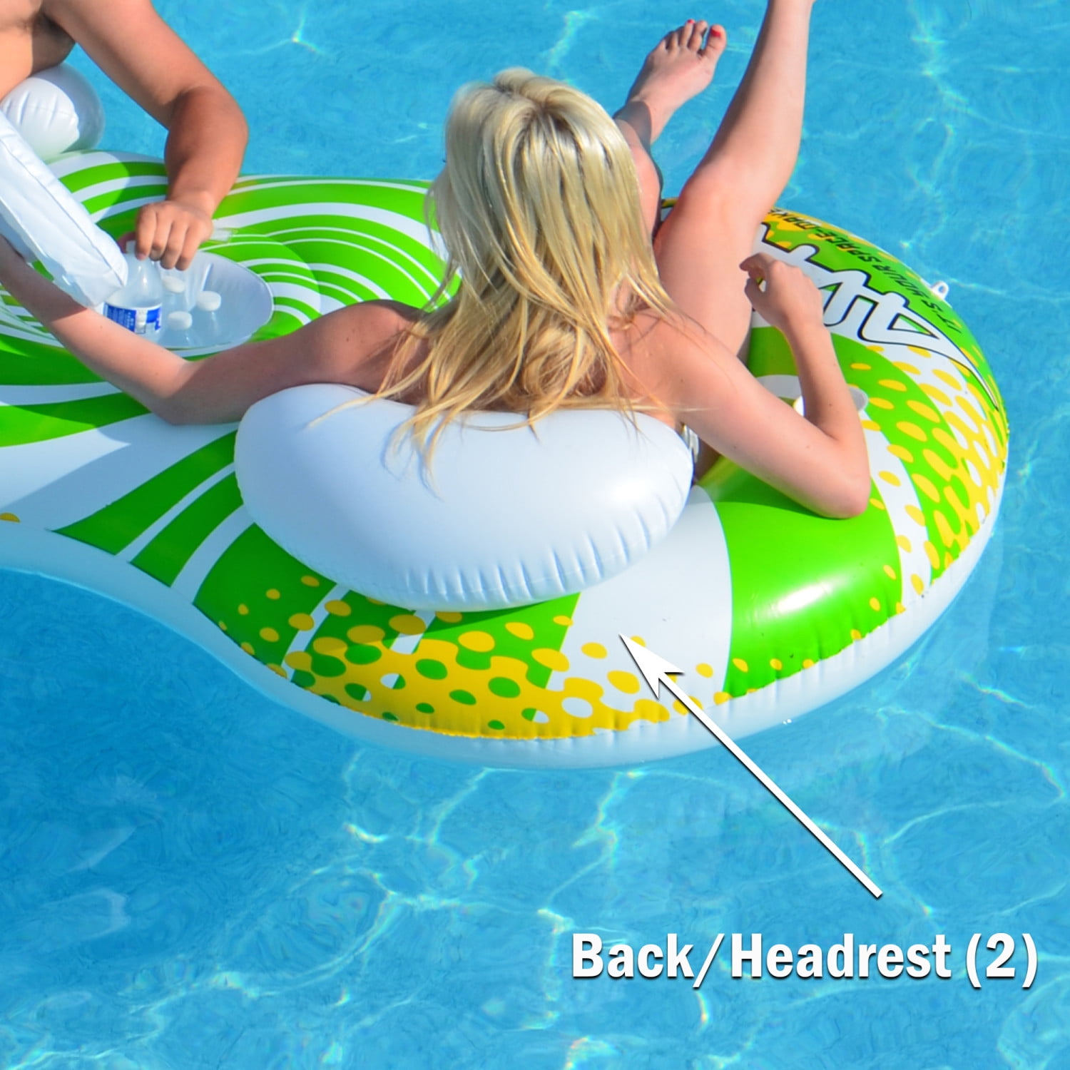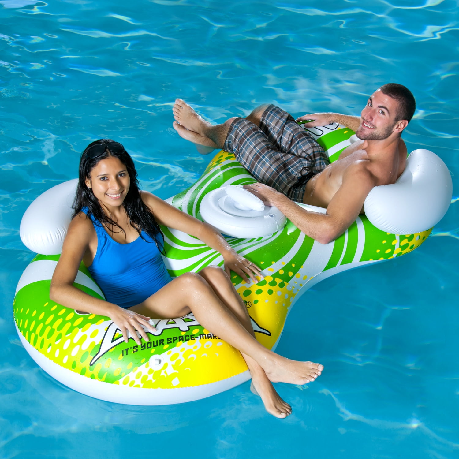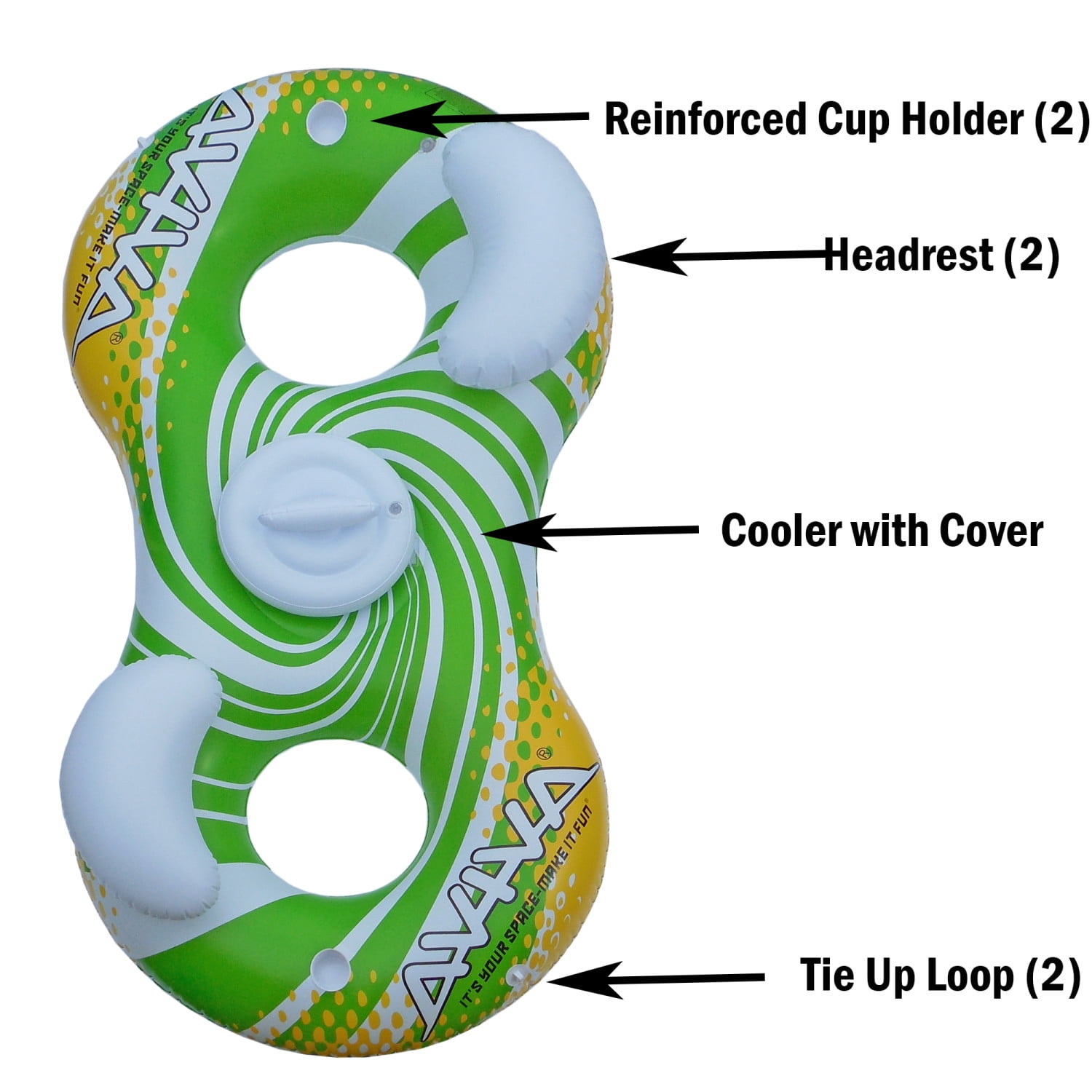 80″ x 39″ x 22″ (203cm x 99cm x 56cm) inflated 225 lbs. (102 Kg) max weight per seat UV-stabilized, durable 10 gauge PVC 2 drink holders Pool float includes storage cooler with lid