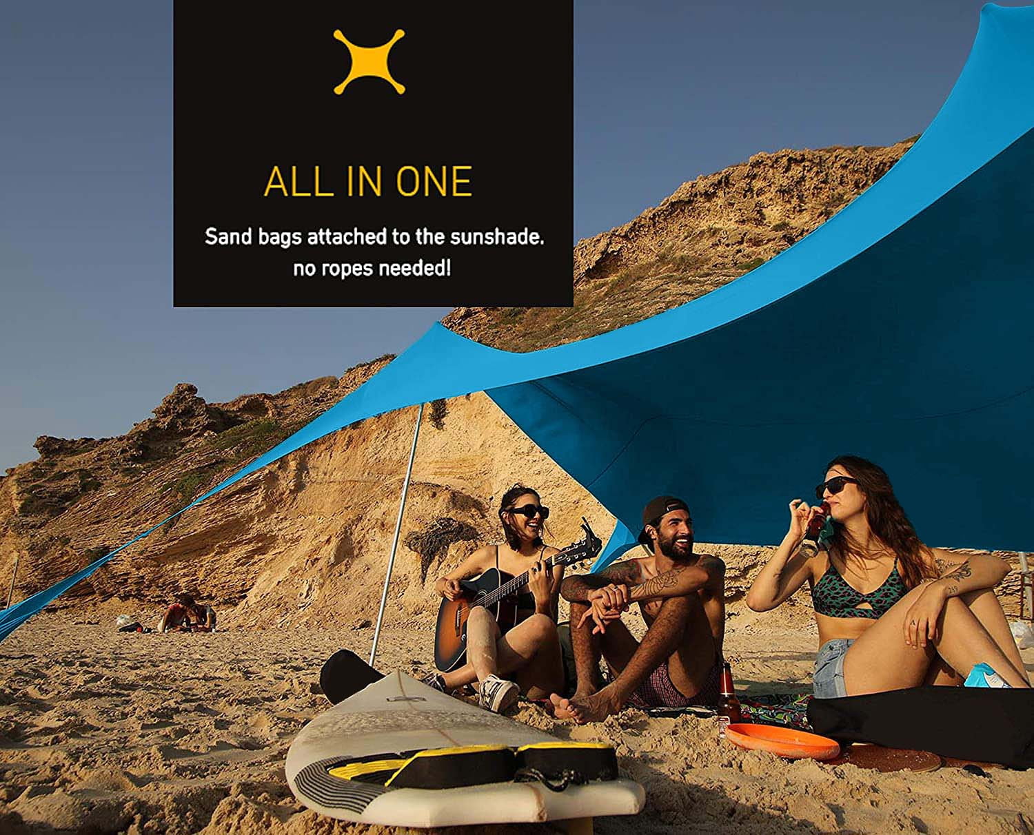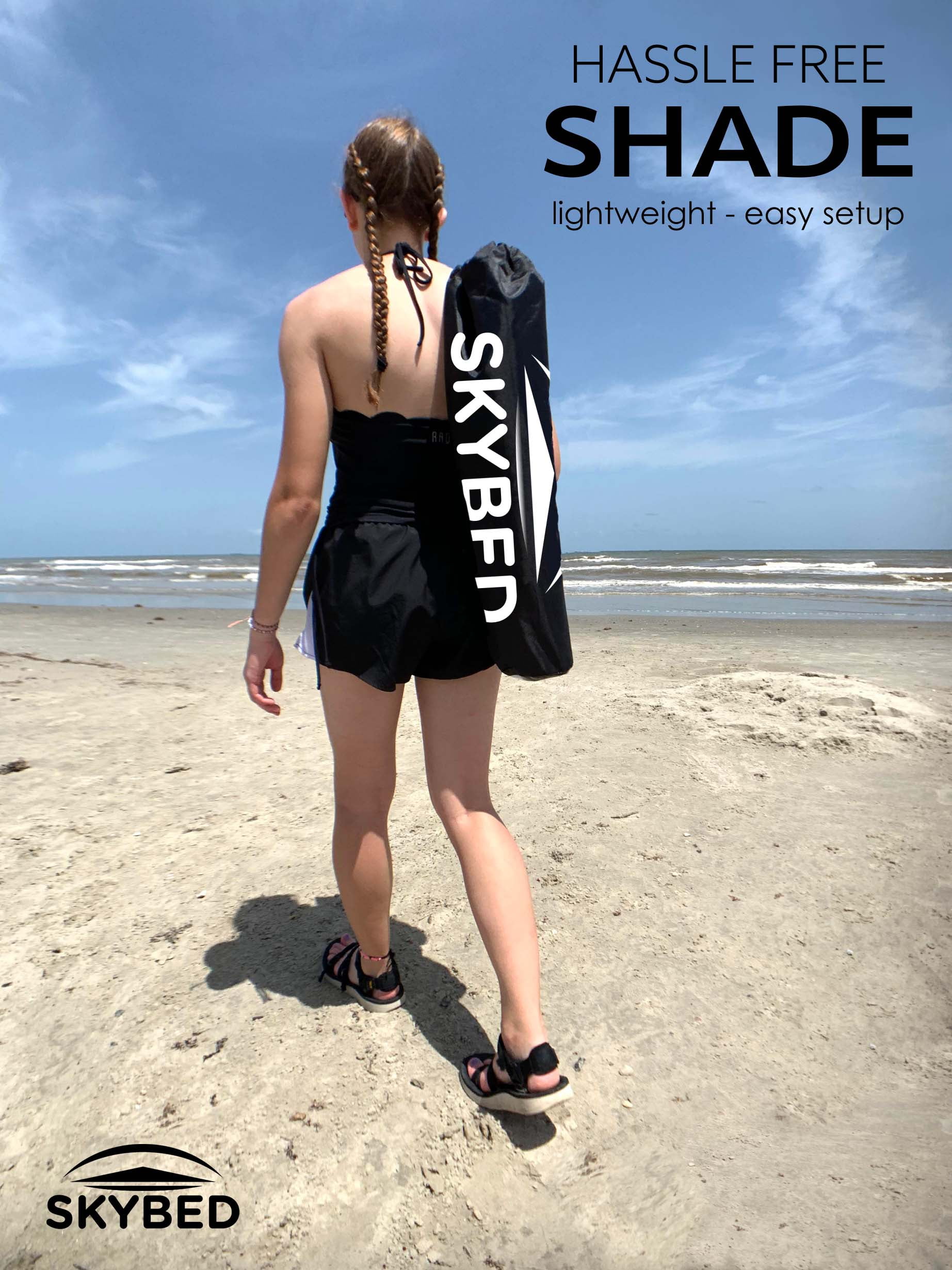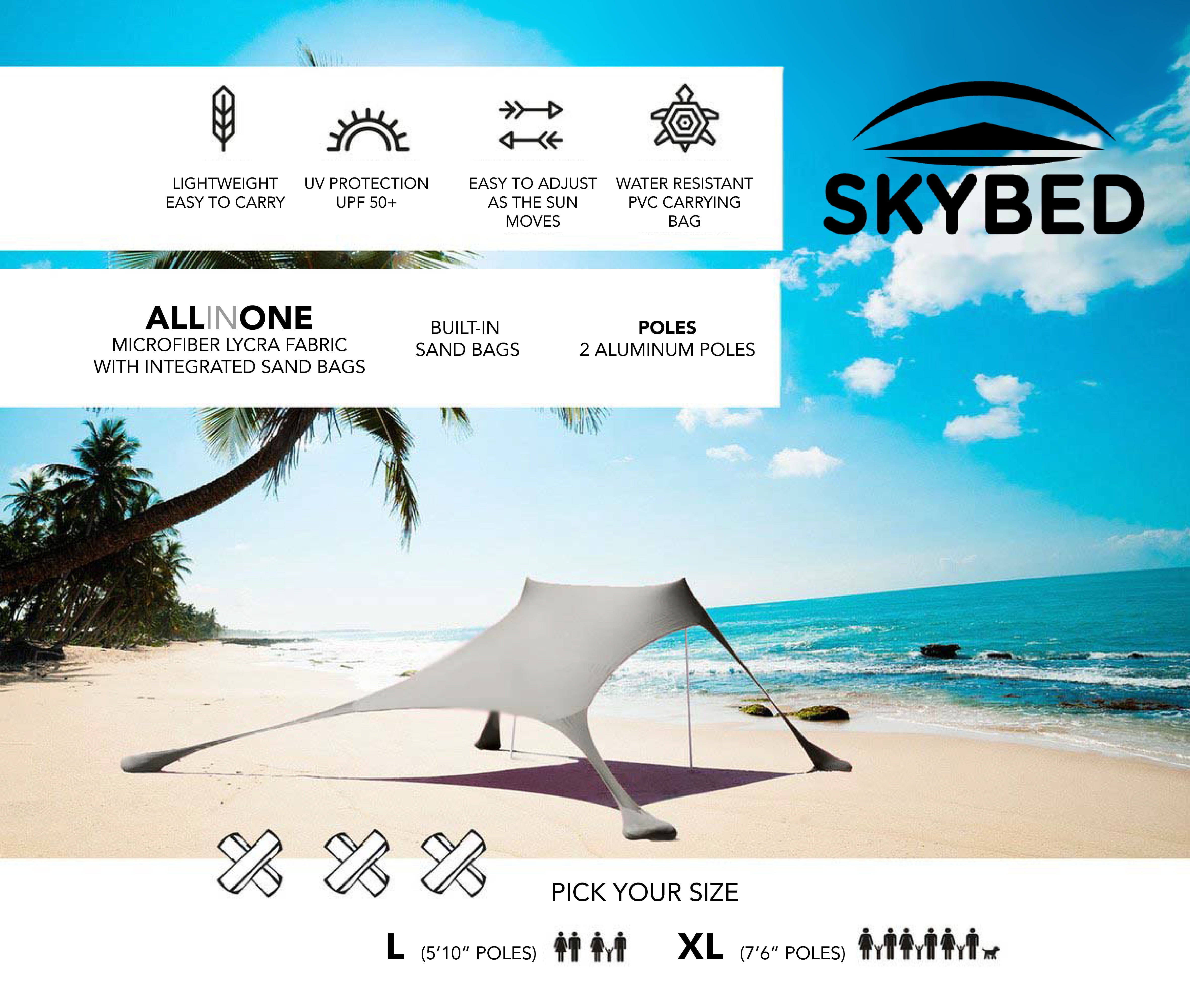 PROTECTS YOU FROM HARMFUL UV RAYS: Skybed shades give you the highest UV protection rating available (UPF 50+) so enjoy the outdoors, sunburn free! GOES ANYWHERE: Set it up on the beach, at the park, in the backyard, or at your favorite camping, fishing, or parade watching spot. With this all-purpose pop-up shade tent, you can enjoy great shade for watching family sporting events, relaxing on the beach, or backyard gatherings with friends! GIVES PLENTY OF SHADE: This extra-large 9′ x 9′ shade area can fit 6-8 people. That means plenty of room to spread out or share your shade. With 90” (7’6”) poles, your average NBA Center could easily stand up in it! Our outdoor sun shades are great for couples, families, or whoever you want to share your shade with! KEEPS YOU COOL AND COMFORTABLE: Skybed beach shades give optimal ventilation and stability – The sturdy, open design allows the breeze through to cool you – less wind resistance means more stability – well balanced anchors and poles will help keep the canopy standing when the wind picks up, so you can rest easy. EASY TO PACK AND CARRY – the whole kit weighs just 6 pounds and comes in a stylish pouch that fits in carry-on luggage for easy vacation packing and has a shoulder strap for hands-free transport at your destination. QUICK AND EASY SETUP: Skybed shades can be set-up by a single person in under five minutes. The quick-assemble aluminum poles have an elastic that runs through so you just have to straighten it and connect the joints. The Skybed Shade is all one piece with built-in anchors, so just stretch it out, add sand (or smooth stones), and inset the poles! (Pro-tip – in high winds, use the lycra elastics that come with the poles to fasten the pole-head to the sun shade!)