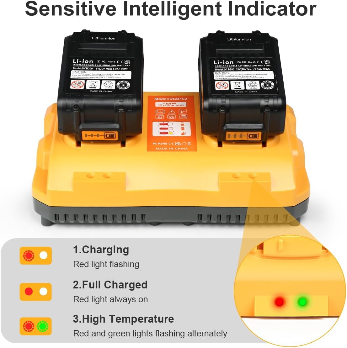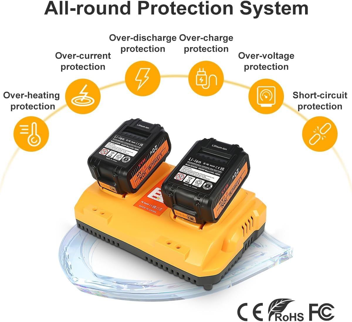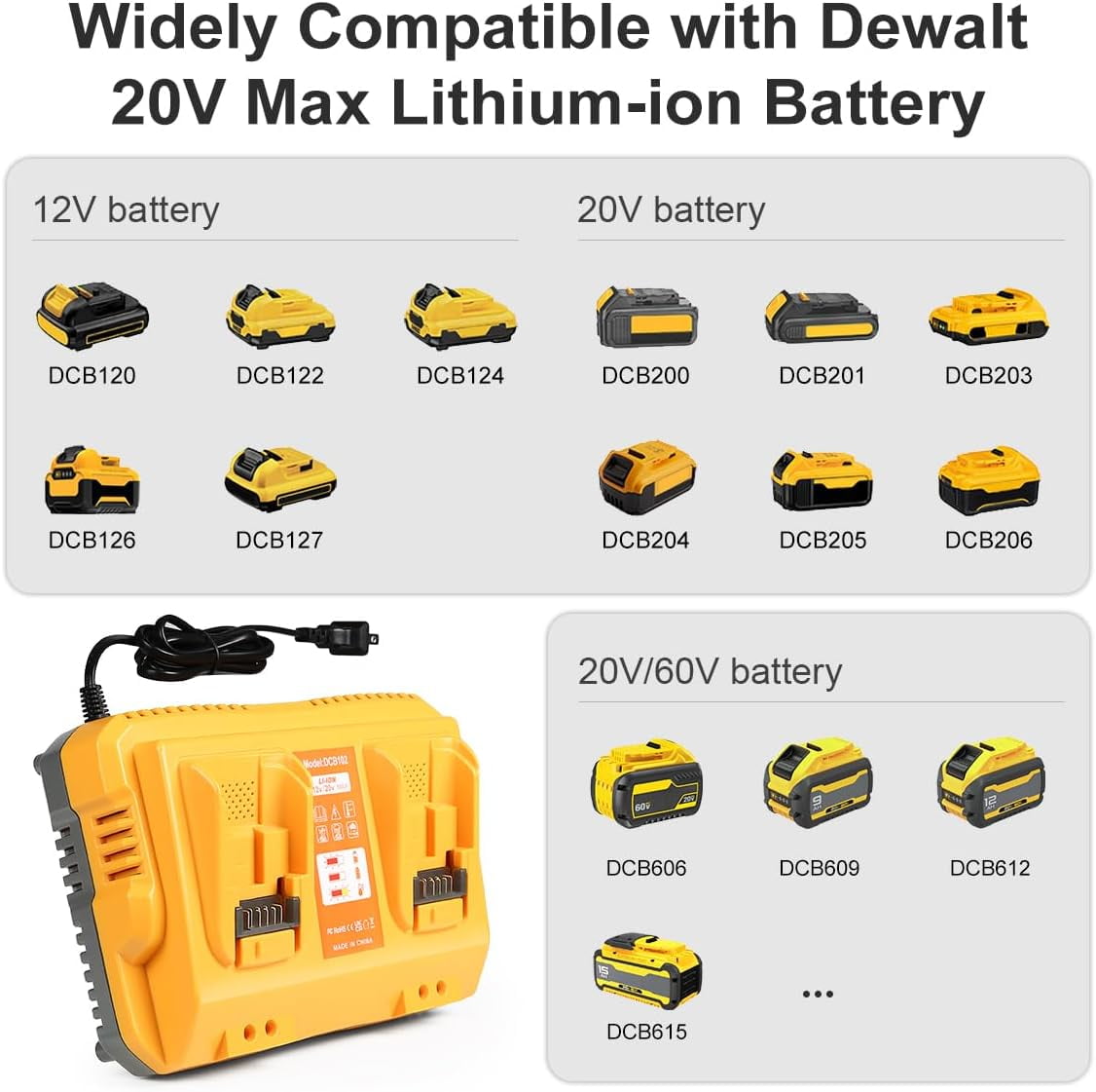 【Efficient Charger】: DCB102 charger replacement for dewalt 20v battery charger is standard plug AC input : 100V~240V / 50~60 Hz, DC output : 12V~20V / 3.0A.Can charge 12V-20V max lithium-ion batteries in 90 mins to save your time. 【20V Battery Compatibility】: Replacement for Dewalt 20V series batteries DCB207, DCB206,DCB180, DCB204-2, -2, DCB203, DCB202 and DCD, DCF, DCG, DCS series chargers. Our battery is also highly compatible with Dewalt 20V series tools and original chargers. 【12V/20V Charger Compatibility】: Our battery charger is compatible with dewalt 12V-20v battery DCB120 DCB124 DCB127 DCB204 DCB200, etc. Perfect Replacement for Dewalt 20 Volt battery charger DCB104 DCB107 DCB112 DCB115 DCB118 DCB119 DCB110 etc. 【Comprehensive Protection】: Replacement for dewalt battery 20v with 6000mAh large-capacity has no memory effect and can be charged at any time for long running time. Built-in 3-LED indicators allow you to better detect the battery status. Protect your battery from insecurity issues caused by over-charge, over-discharge, over-heating, over-current, over-voltage, short circuit etc and current to maximize battery life. 【Warm After-sales Service】: 1 year warranty. Please feel free to contact us if you have any questions about our replacement for dewalt 20v battery and replacement for dewalt battery charger station.