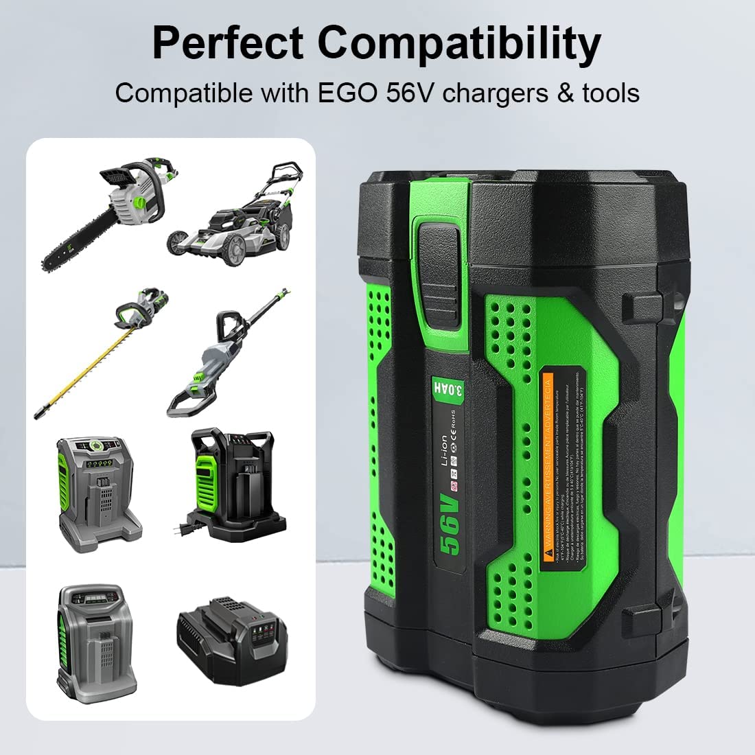 SUNBAT 56V 3000mAh Power Tool Battery for EGO BA2800, BA1400, BA4200 Consistently strong and long-lasting performance: This Ego replacement 56V battery is designed to outperform many others, providing a powerful alternative to gas with minimal maintenance required Unique arc-shaped design: The innovative design helps keep the battery cool during extended use in extreme conditions, enhancing the efficiency of your Ego tools Fuel gauge indicator: The built-in gauge displays the battery’s charge level, allowing you to monitor its condition and know when it reaches 15% Compatibility: This 56V 3000mAh high-capacity lithium battery is a replacement for BA2800, BA1400T, BA4200, and other EGO power tools, except for PST3042 and PST3040 portable power stations. Each battery is rigorously tested for compatibility with EGO tools and OEM chargers Storage recommendations: For optimal performance, store the lithium-ion battery pack in a cool, dry place below 78.8°F if not in use for more than 30 days