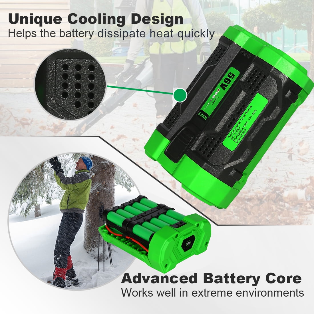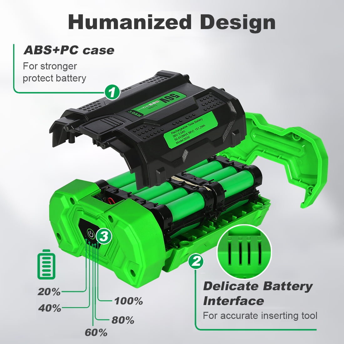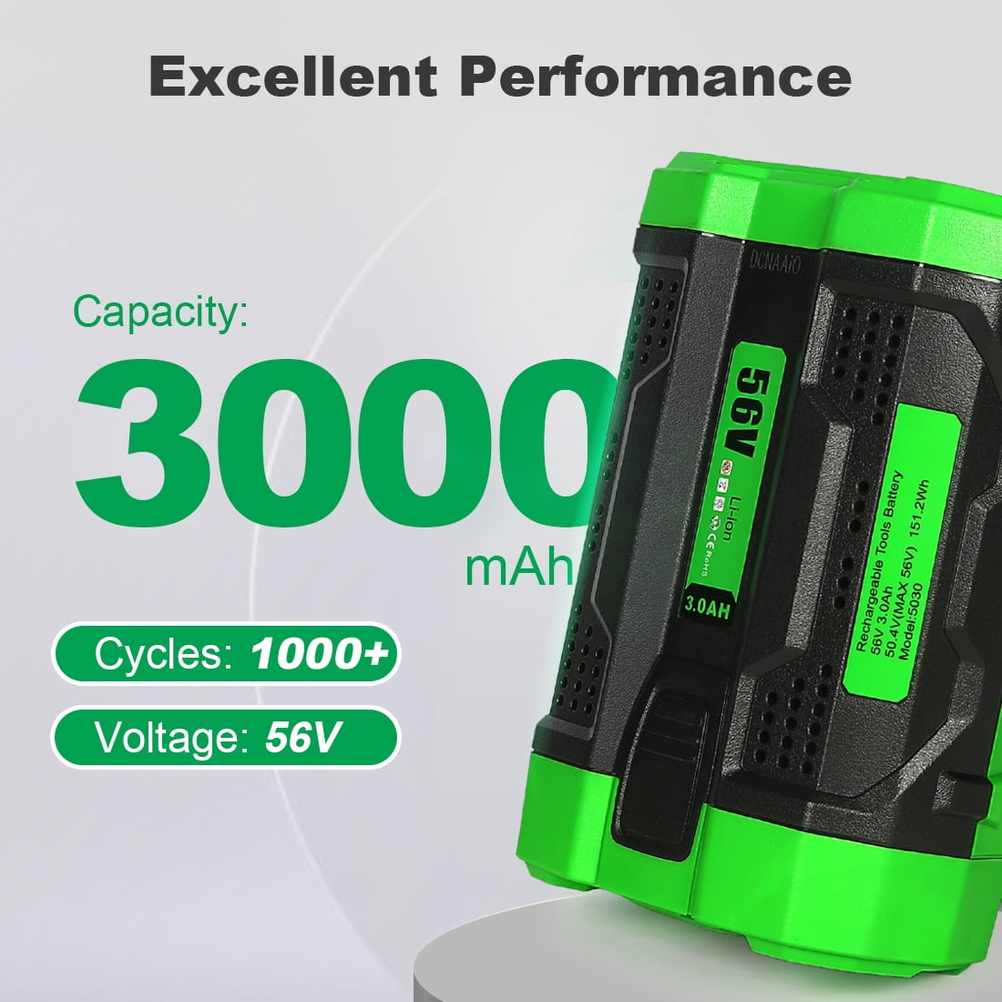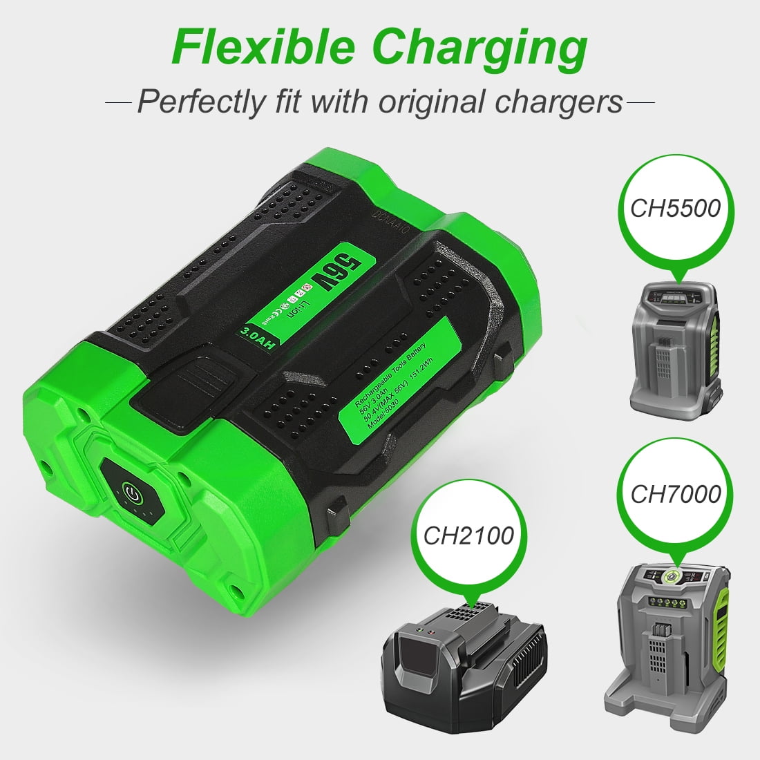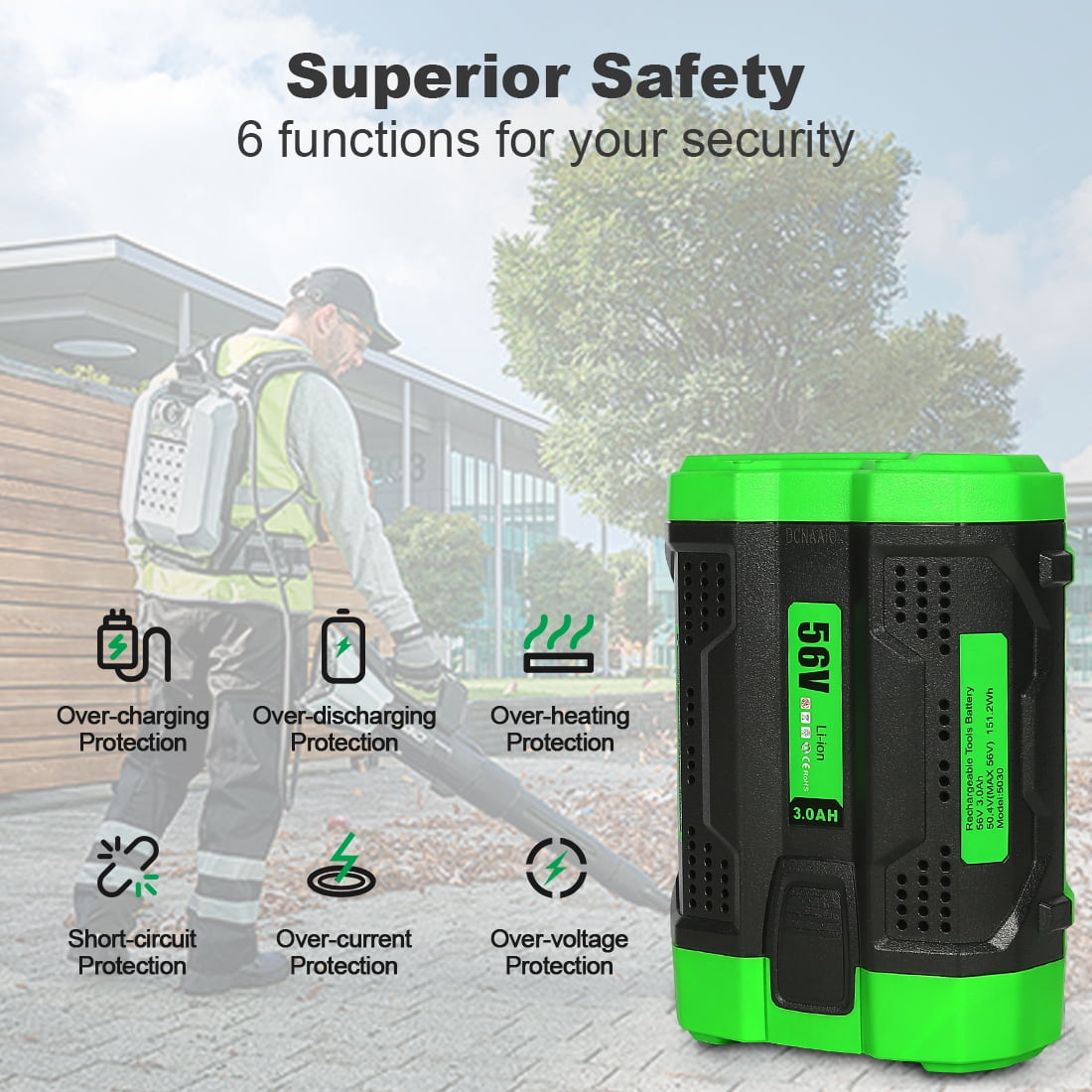 SUNBAT 56V 3000mAh Power Tool Battery for EGO BA4200 BA1400T BA4200T BA2800 Upgraded Fuel Gauge: Equipped with a built-in indicator light to show remaining run time, preventing unexpected power failures 6 Safety Protection Technologies: Features protection against voltage errors, battery overloads, short circuits, overcharging, and internal overheating Certified by CE, FCC, and ROHS Large Capacity & Long Endurance: 56V, 3000mAh capacity provides reliable power Charging time is calculated based on battery capacity and charger current High Compatibility: Supports various chargers including CH2100, CH7000, CH2800D, and CH5500 Compatible with multiple power tools, excluding PST3042 and PST3041 portable power stations Product quality defects for free return within 30 days, Warranty within 1 year, any question