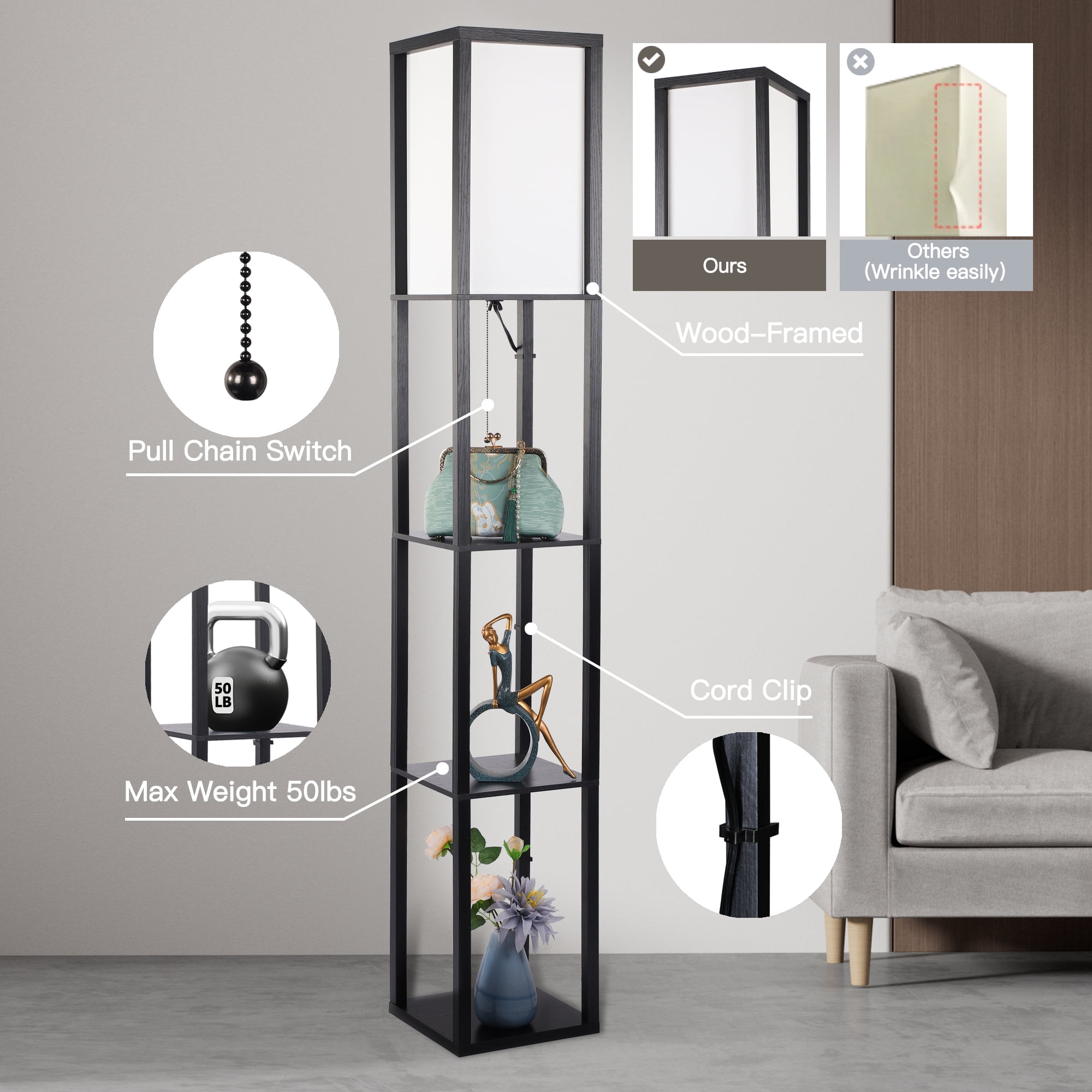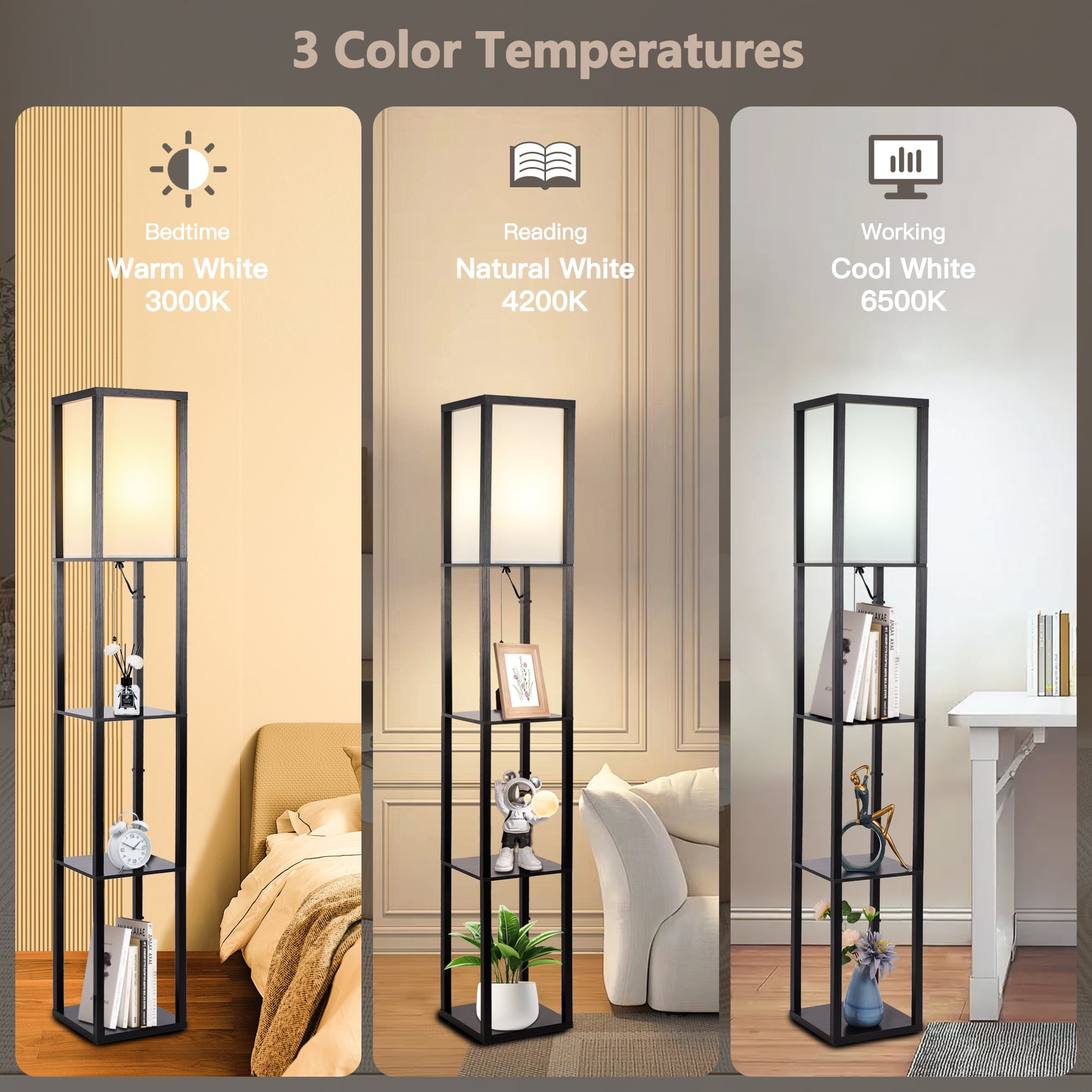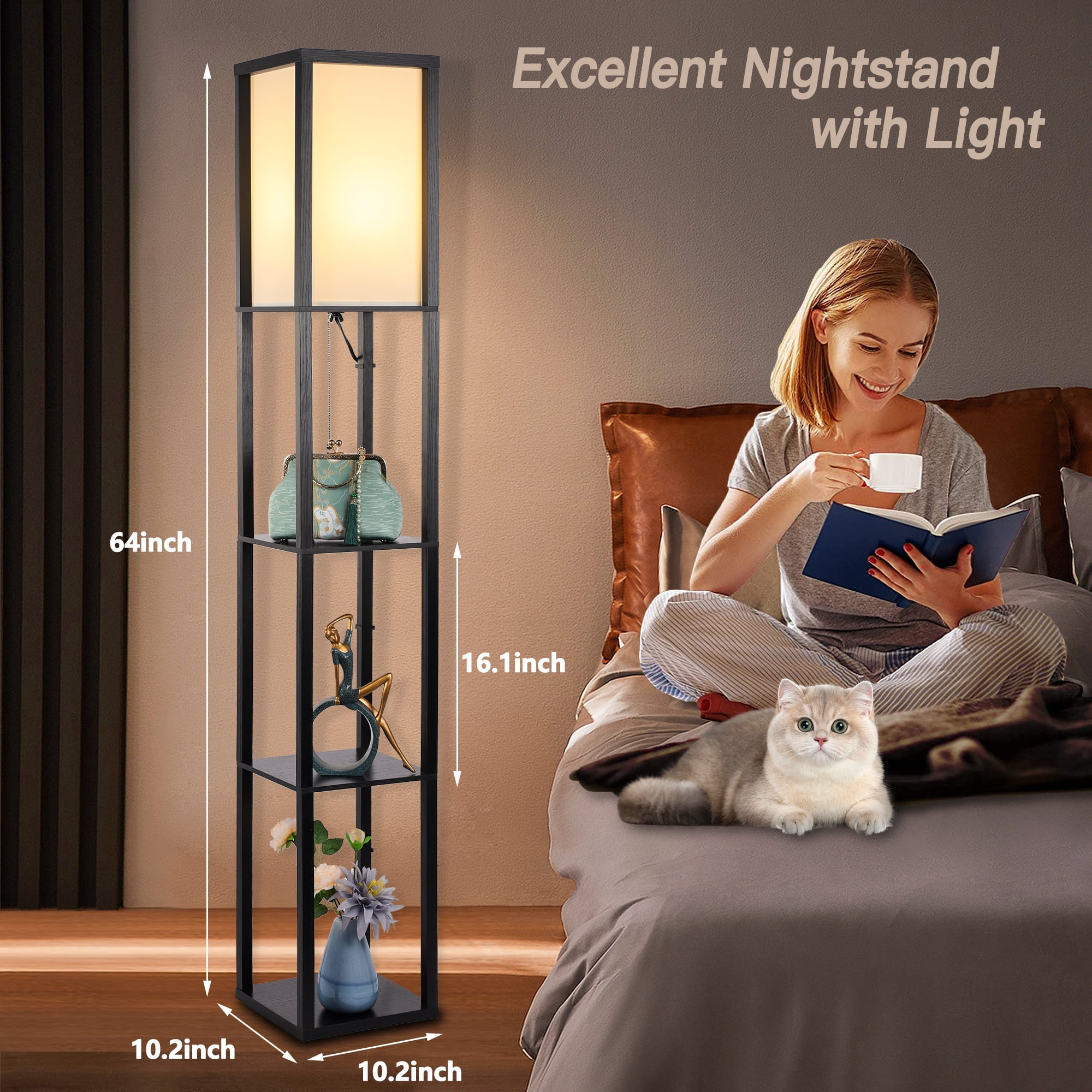 Functional Design – Optimize your space with the three-tier storage shelves of this floor lamp, providing a storage or display area for books, plants, or any items you desire. Perfect for keeping your living room, bedroom, or office neat and organized. The top layer is fitted with wooden strips to protect the lampshade from dust accumulation and accidental impacts, ensuring its longevity. 3 Adjustable Color Temperatures – Contains a 12W energy saving LED bulb for energy efficiency and long-lasting illumination. Easily switch between warm white, natural white and cool white color temperatures to create the perfect ambience for any occasion, whether you want a cozy, relaxing atmosphere or a bright, focused light for reading or working. Versatile Application – Contemporary wooden design, effortlessly blends into most interior decor style. The sleek black finish adds a touch of elegance to your space, making it perfect as a corner lamp or slim nightstand. It not only serves as a practical lighting solution but also enhances the overall aesthetic appeal of your room. Subtle and Soft Lighting – The lampshade of this floor lamp, crafted in an off-white color, opens at the top, allowing the light to diffuse gently and creating a warm and inviting glow. This design creates a soft and soothing vibe in your space, making it an ideal choice for relaxation and fostering a cozy atmosphere. Easy Assembly – With clear instructions and minimal components, this floor lamp can be assembled effortlessly in no time, allowing you to enjoy its illumination and display benefits without any hassle. Material: Wood,Fabric Product Dimensions: 10.2″D x 10.2″W x 64″H Shade & Shelf Height: 16.1″ Item Weight: 13.6 Pounds Switch Style: Pull Chain Included Components: Bulb Wattage: 12 Watts Voltage: 120 Volts (AC) Bulb Base: E26 Bulb Features: 3000K-4200K-6500K