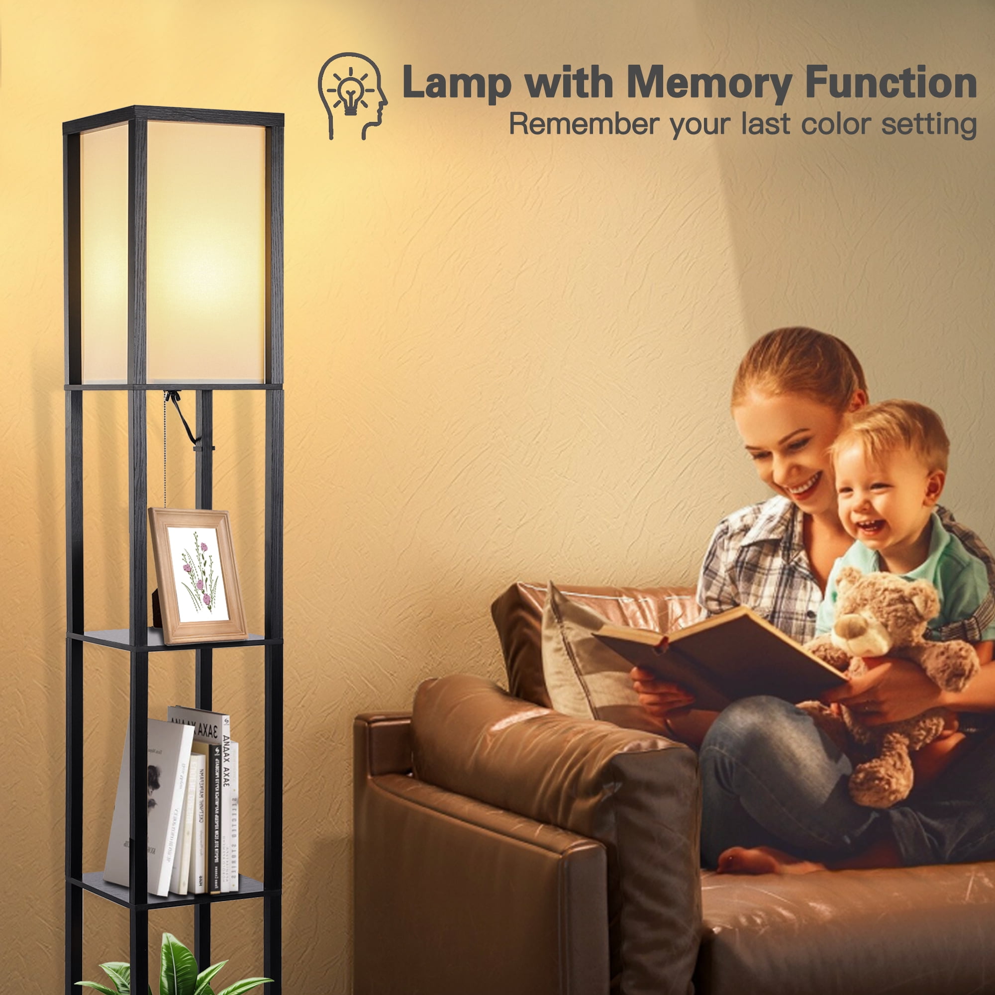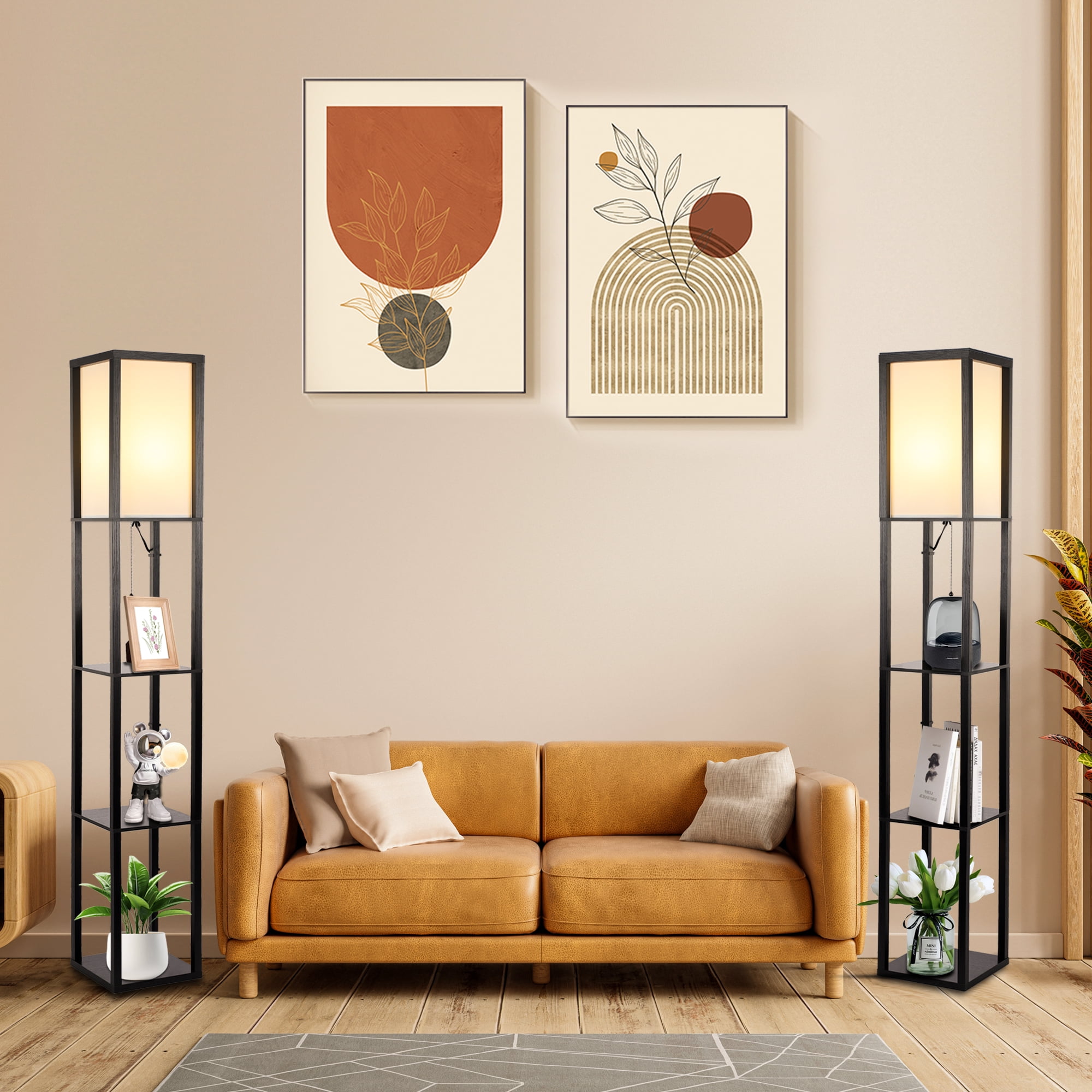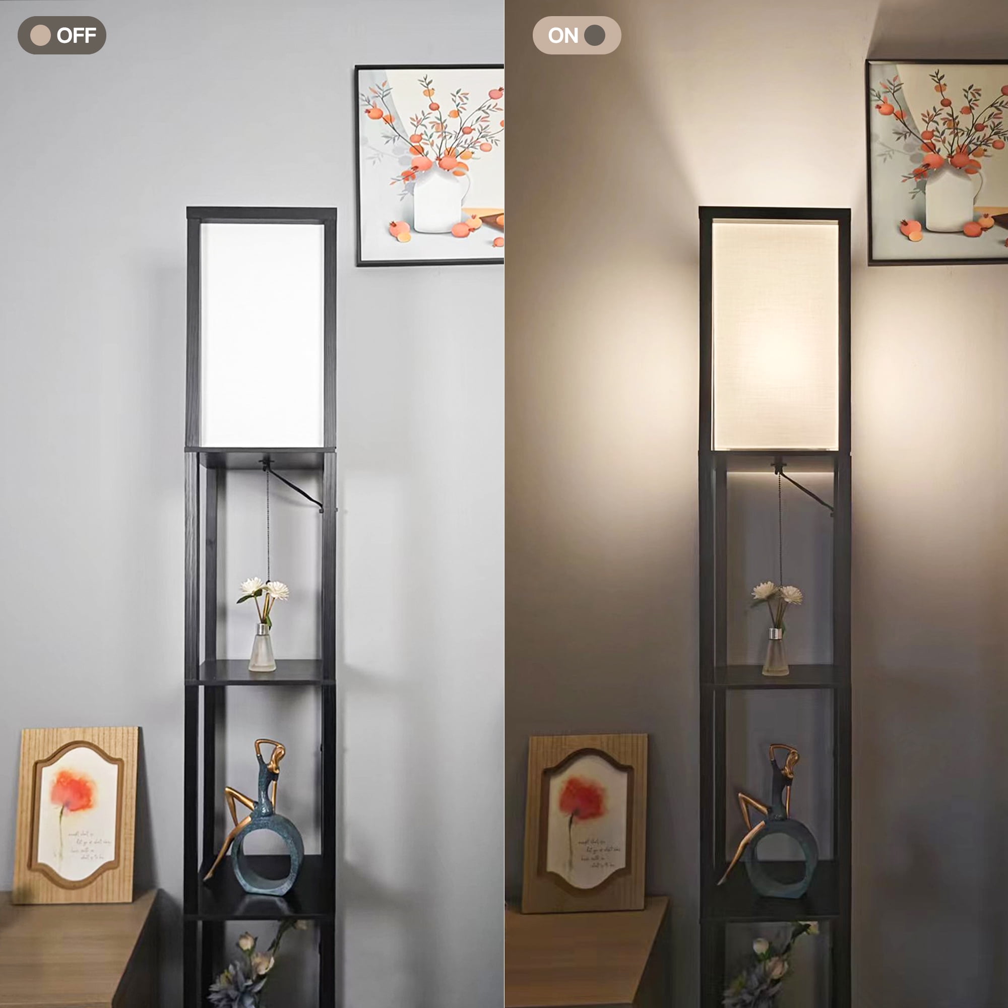 Functional Design – Optimize your space with the three-tier storage shelves of this floor lamp, providing a storage or display area for books, plants, or any items you desire. Perfect for keeping your living room, bedroom, or office neat and organized. The top layer is fitted with wooden strips to protect the lampshade from dust accumulation and accidental impacts, ensuring its longevity. 3 Adjustable Color Temperatures – Contains a 12W energy saving LED bulb for energy efficiency and long-lasting illumination. Easily switch between warm white, natural white and cool white color temperatures to create the perfect ambience for any occasion, whether you want a cozy, relaxing atmosphere or a bright, focused light for reading or working. Versatile Application – Contemporary wooden design, effortlessly blends into most interior decor style. The sleek black finish adds a touch of elegance to your space, making it perfect as a corner lamp or slim nightstand. It not only serves as a practical lighting solution but also enhances the overall aesthetic appeal of your room. Subtle and Soft Lighting – The lampshade of this floor lamp, crafted in an off-white color, opens at the top, allowing the light to diffuse gently and creating a warm and inviting glow. This design creates a soft and soothing vibe in your space, making it an ideal choice for relaxation and fostering a cozy atmosphere. Easy Assembly – With clear instructions and minimal components, this floor lamp can be assembled effortlessly in no time, allowing you to enjoy its illumination and display benefits without any hassle. Material: Wood,Fabric Product Dimensions: 10.2″D x 10.2″W x 64″H Shade & Shelf Height: 16.1″ Item Weight: 13.6 Pounds Switch Style: Pull Chain Included Components: Bulb Wattage: 12 Watts Voltage: 120 Volts (AC) Bulb Base: E26 Bulb Features: 3000K-4200K-6500K