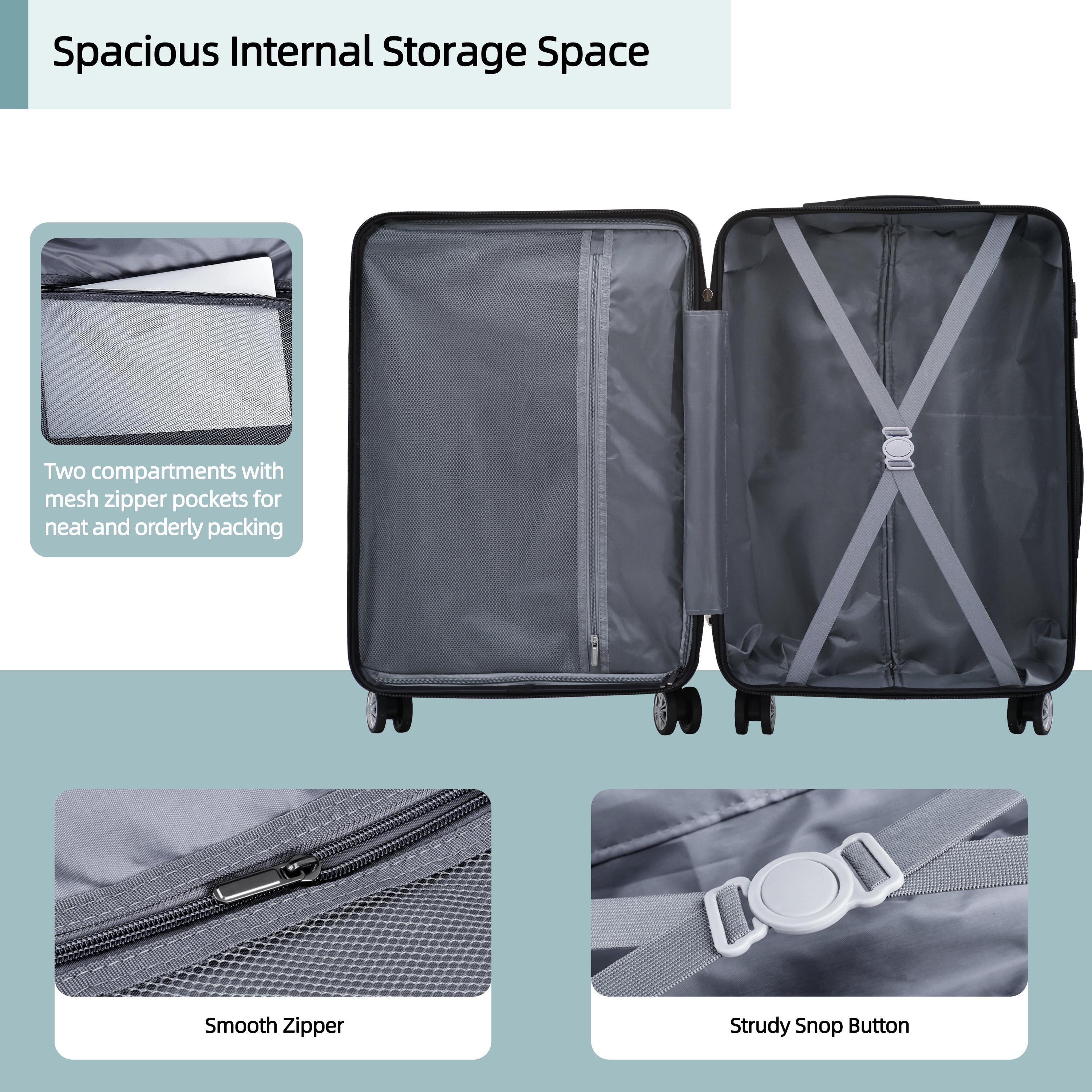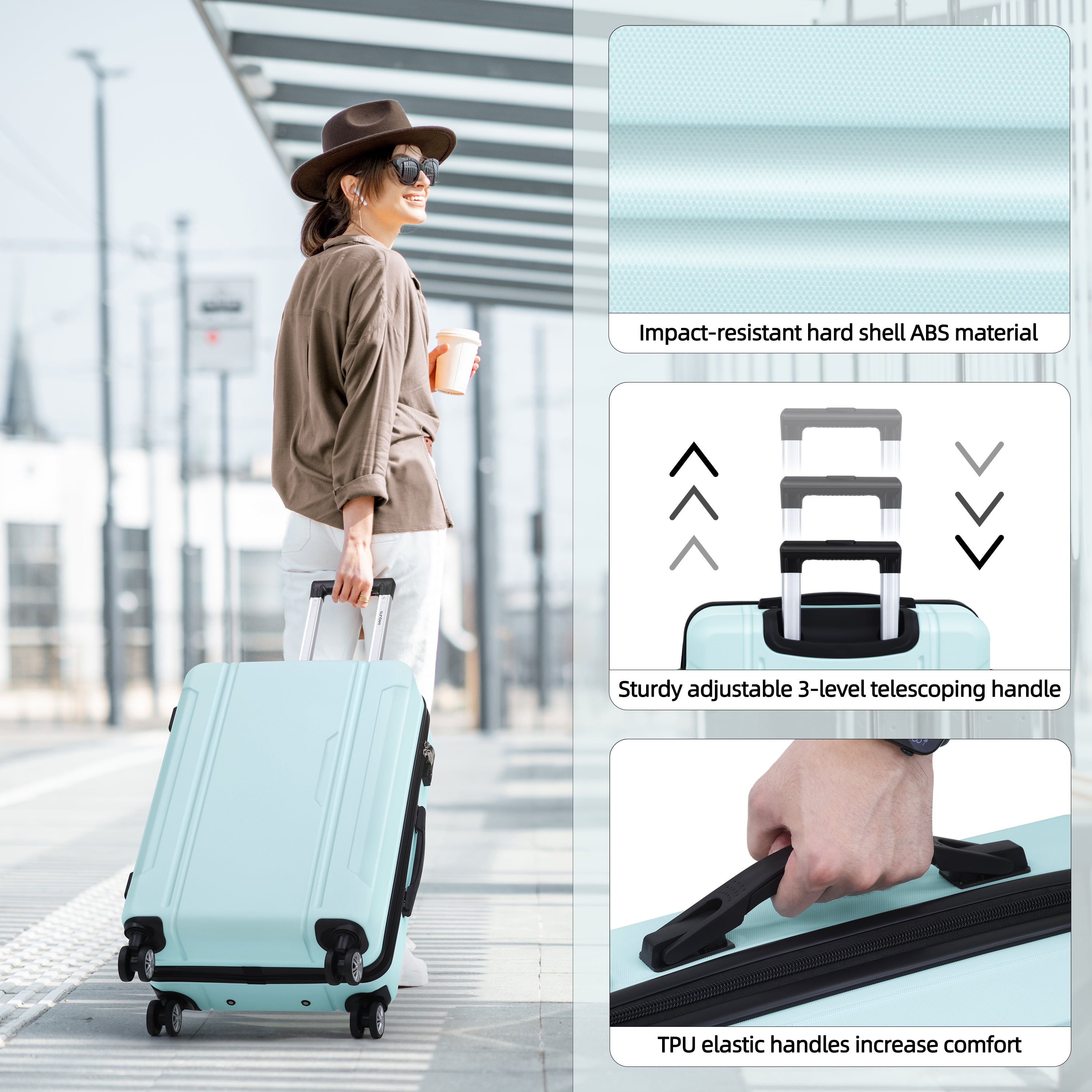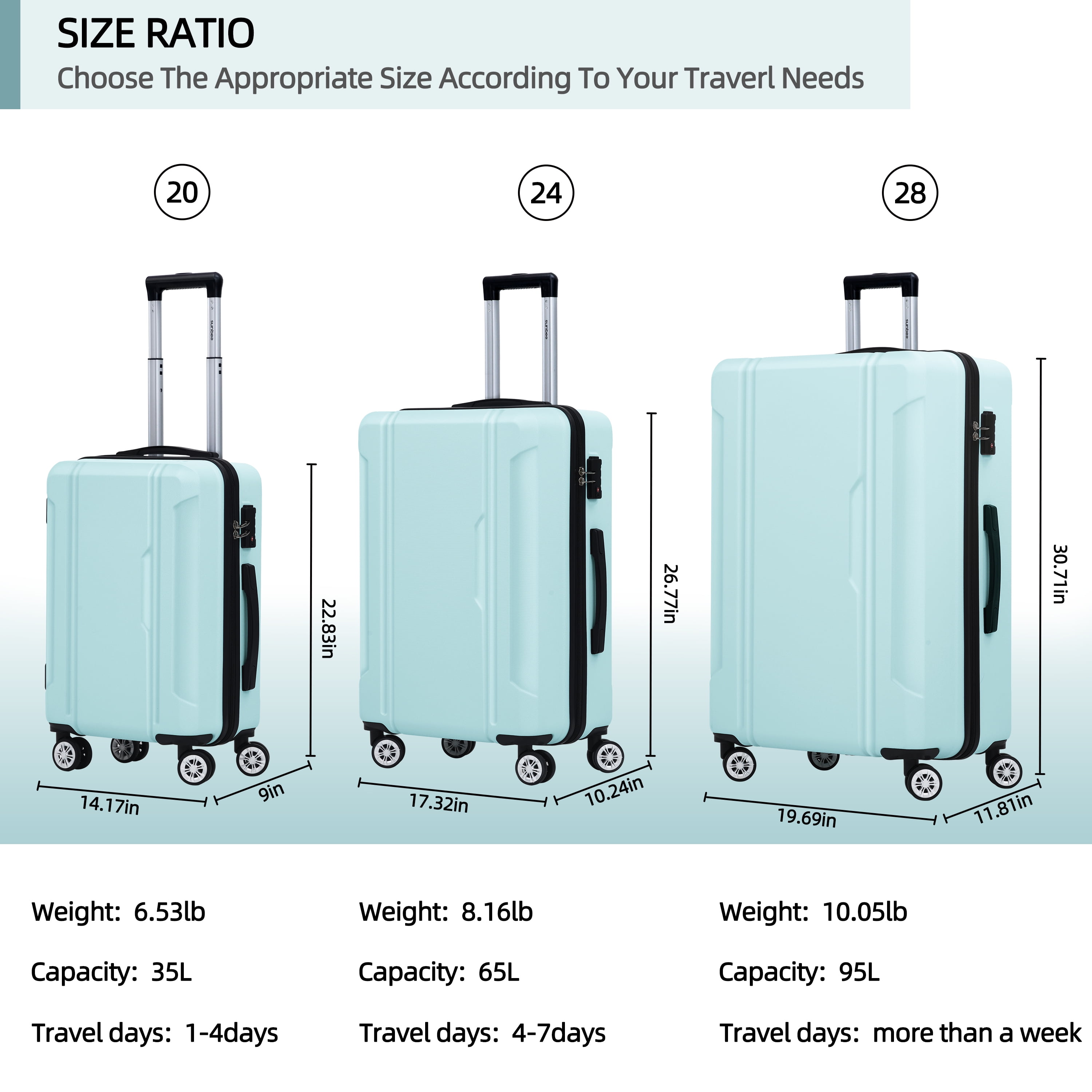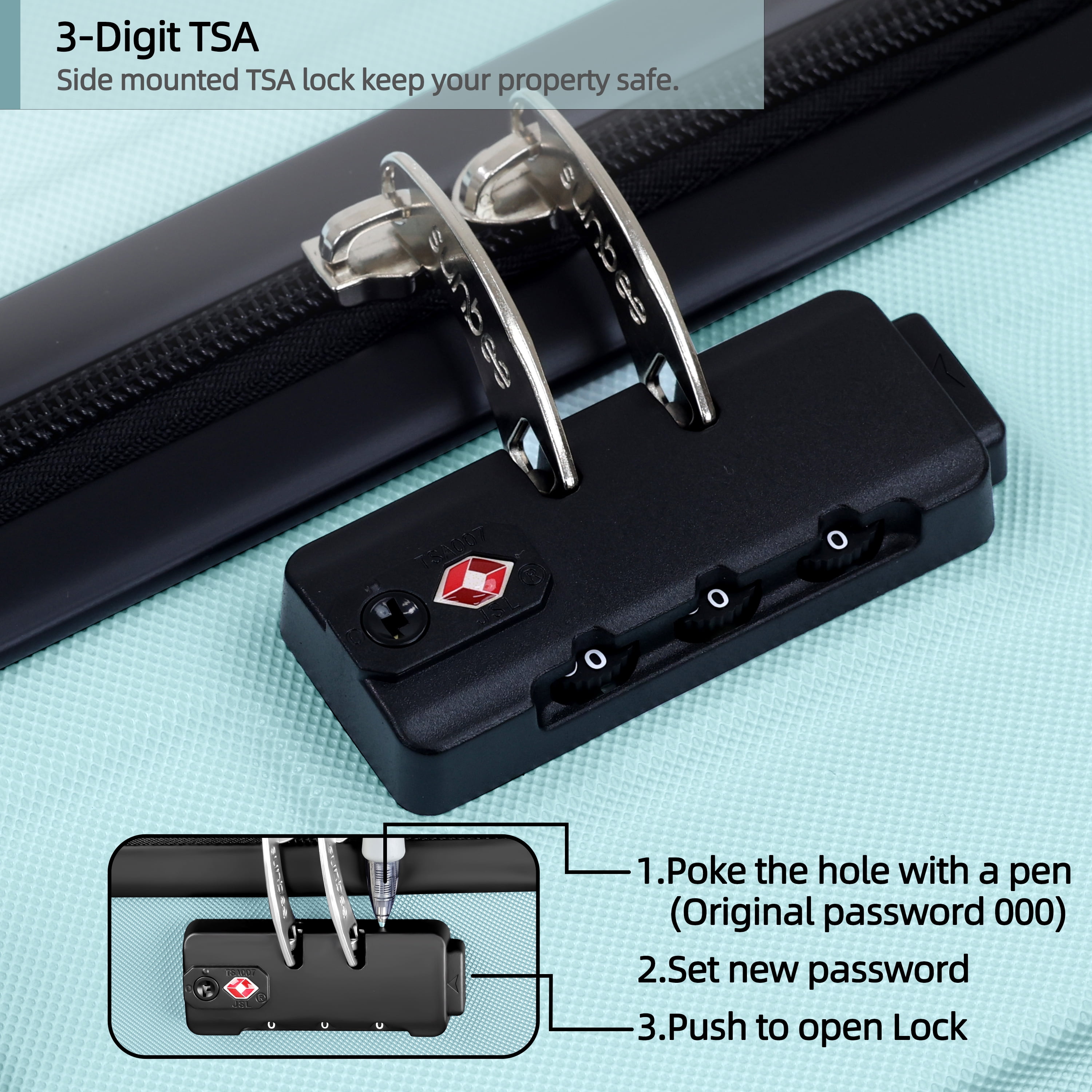 【100% ABS material】: Lightweight and durable ABS hardside luggage sets; Scratch & Pressure-resistant & Waterproof suitcase with wheels. The fully lined interior and the multi-use organizational pockets make packing clothes easy. 【Silent & Smooth 360 degree Spinner Wheels】: Multi-directional silent spinner wheels can move in any directions for easy mobility. Our spinner luggage sets have been tested extensively on different road conditions with emphasis on endurance and damage resistance. Double wheel design is more durable, stable, silent and smoothly. 【TSA lock for travel security]】 : TSA Lock act to deter theft, ensuring that only you or a TSA agent have easy access to your belongings when traveling with Sunbee hardside luggage. 【Telescoping Handle】: Suitcase set of 3 have sturdy 3-Step Telescoping Handle. Soft flip side of top handle and side carry handle can protect your fingers. 【Two Years Warranty】: Sunbee luggage include carry on luggage and checked luggage, are rigorously tested to ensure our products meet stringent standards.If an accident occurs, don’t worry. Worldwide 2 year warranty for peace of mind.If there are any issues, please contact me immediately and I will solve them for you