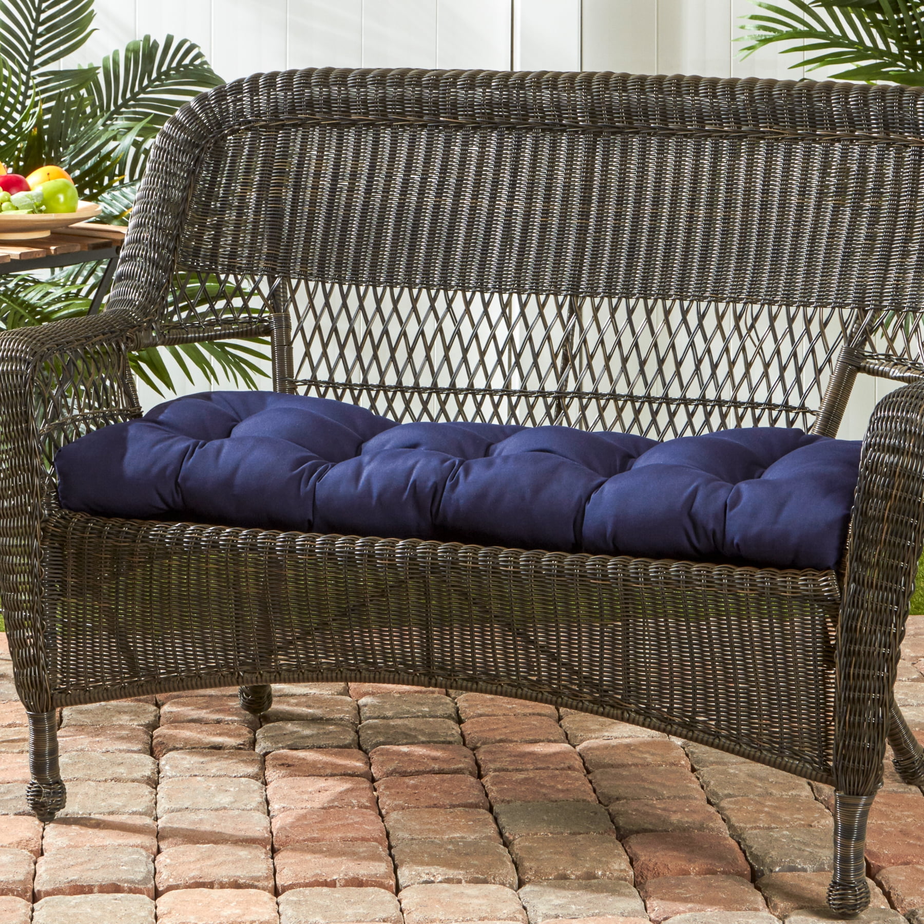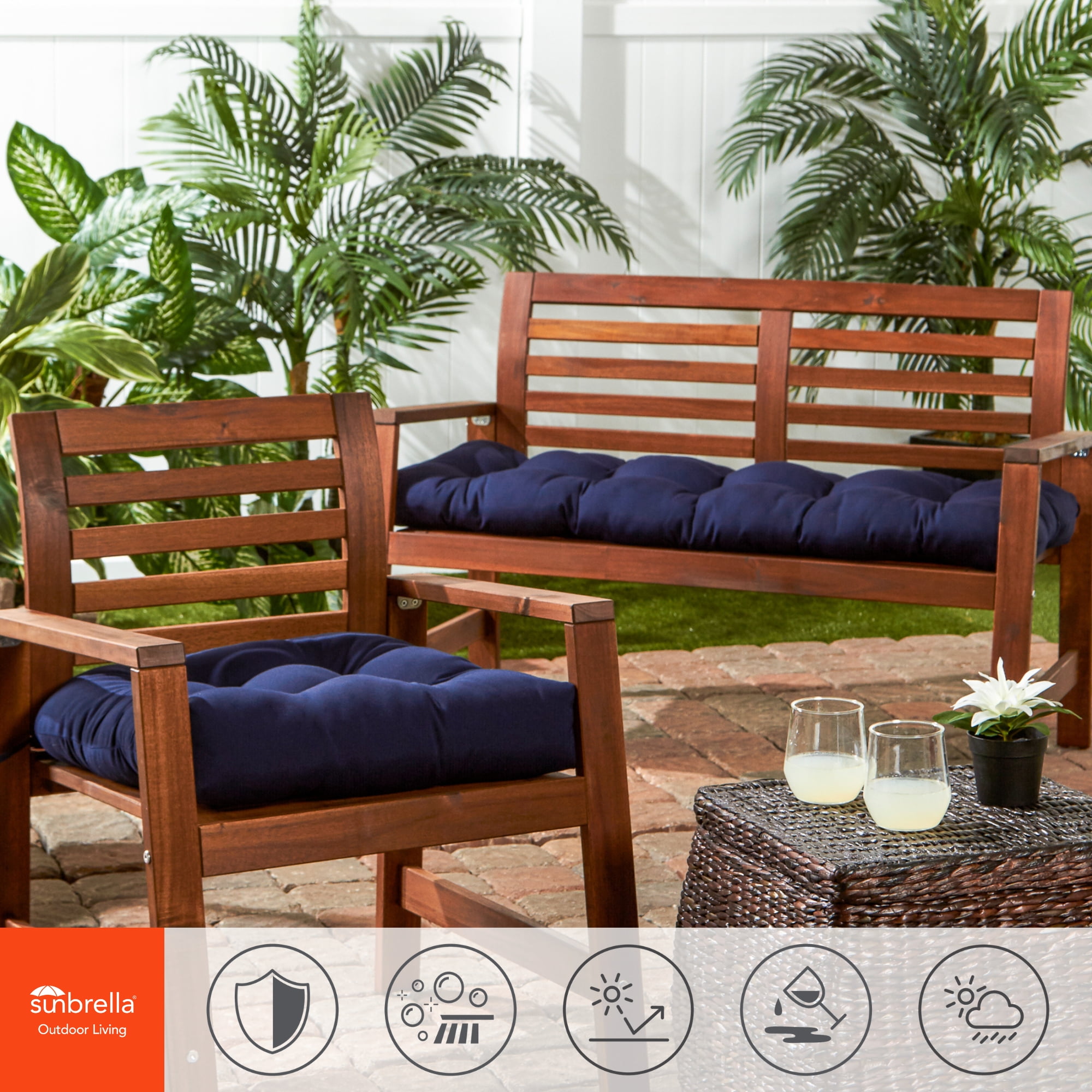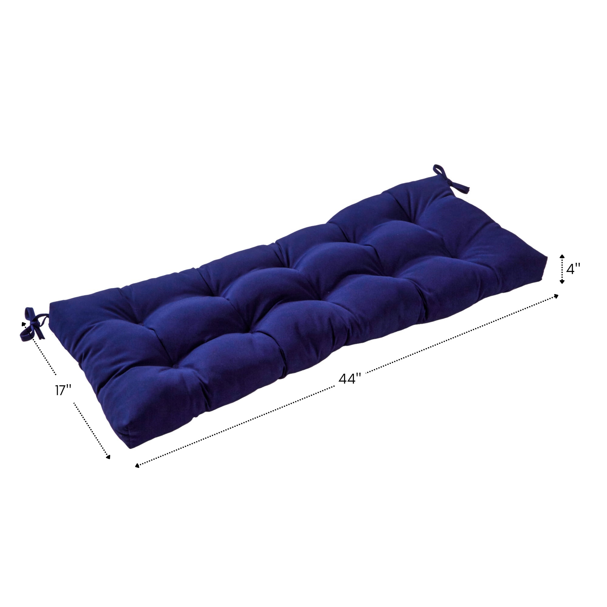 Includes one 44 x 17 in. reversible outdoor bench cushion Deep solid shade of blue Made from 100% acrylic, high-performance outdoor Sunbrella fabric Water, stain, fade and mildew resistant Soft polyfiber fill made from 100% recycled, post-consumer plastic bottles Plush, overstuffed construction for extra comfort and longevity For best results, and to prolong the life of your cushions store covered when not in use Cushion dimensions are +/- 2 inches. Please note product will arrive in a slightly compressed state; please allow a few days for product to expand to final size listed in description