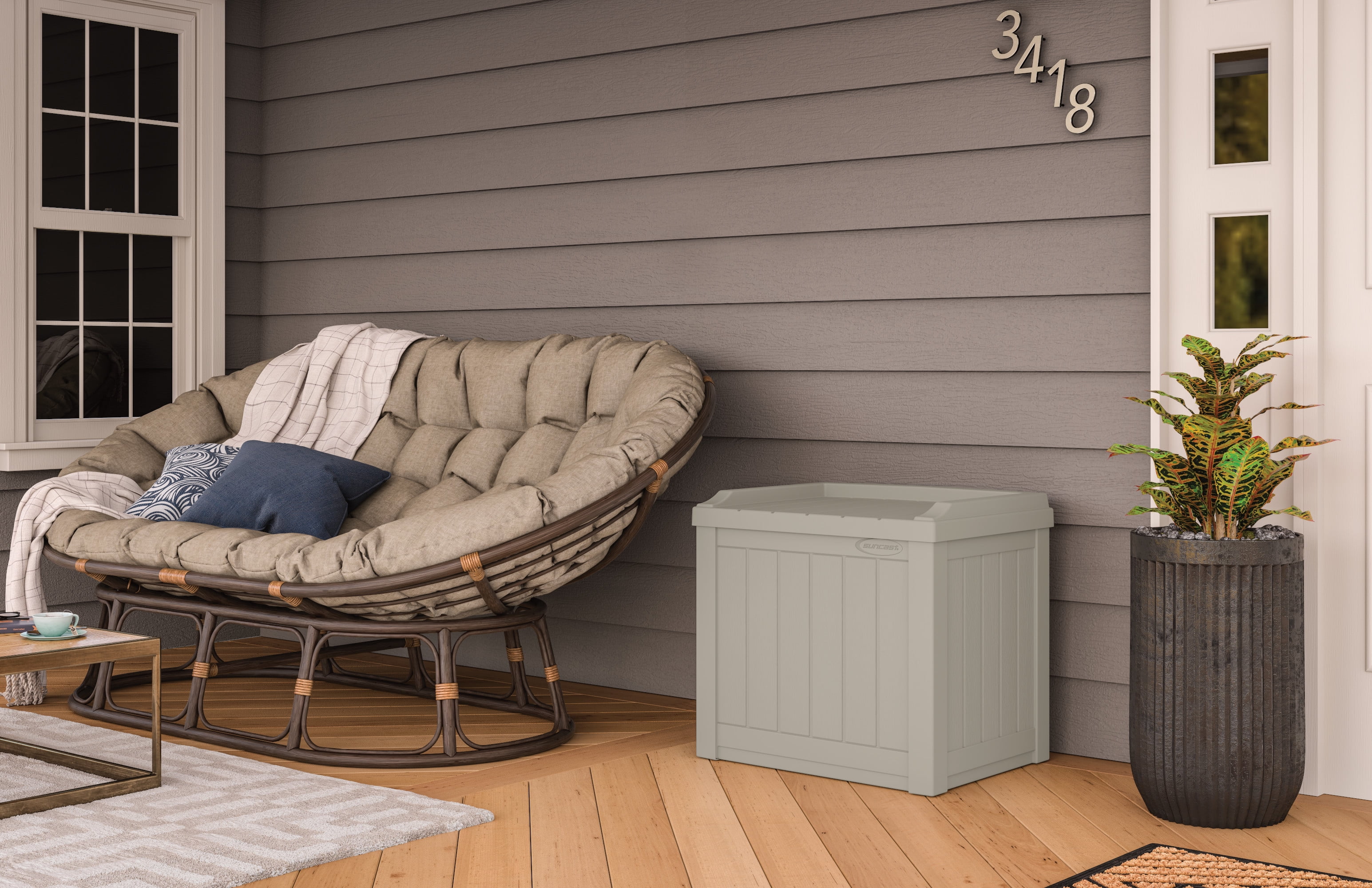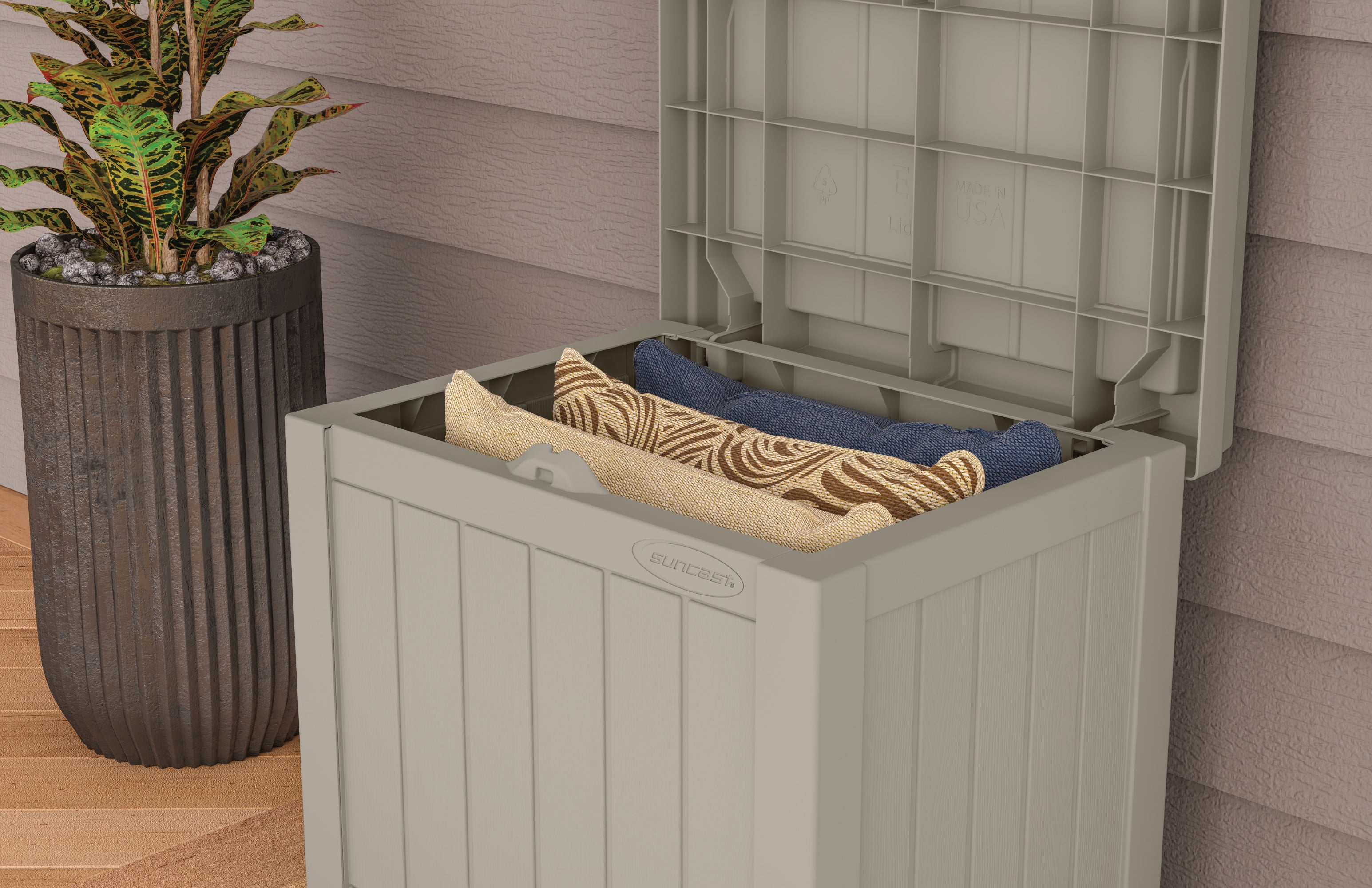 22-gallon capacity for patio, deck, yard, porch, garage and shed storage Store pool toys, grill supplies, gardening tools, cushions, blankets, and more Water-resistant resin construction resists fading and rust Rain water flows off of the box to prevent water pooling Attractive light taupe finish looks great with any backyard or indoor décor Assembly is quick and easy with minimal tools required Small size allows for easy storage in your home or shed during the off season Small size allows for easy storage in your home or shed during the off season. Storage box measures 17 in. x 22 in. x 20.5 in. with an interior size of 15.5 in. x 20.5 in. x 17 in., the perfect size for your outdoor space.