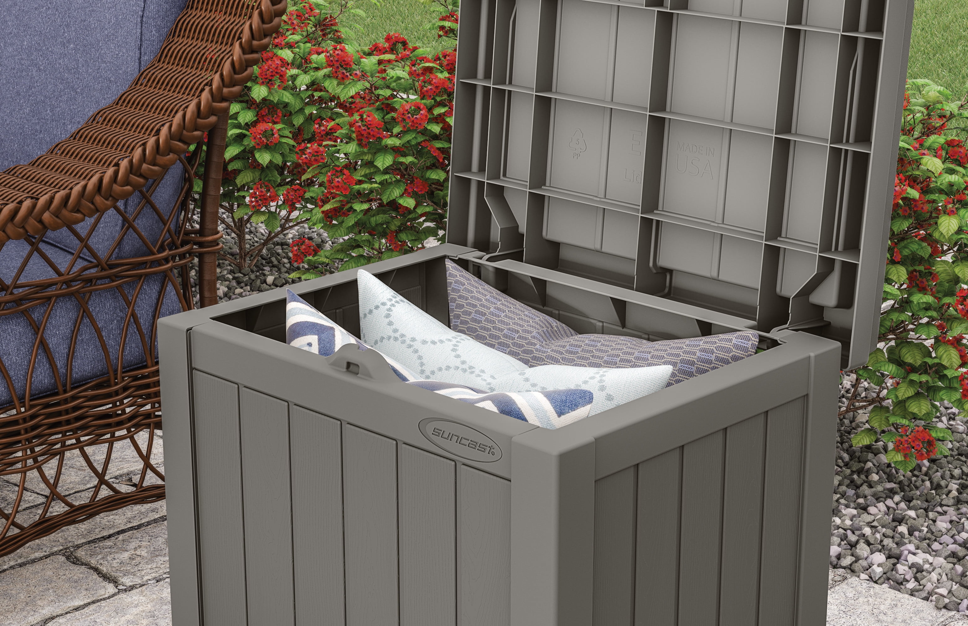 22-gallon capacity for patio, deck, yard, porch, garage and shed storage Store pool toys, grill supplies, gardening tools, cushions, blankets, and more Water-resistant resin construction resists fading and rust Rain water flows off of the box to prevent water pooling Attractive stone gray finish looks great with any backyard or indoor décor Assembly is quick and easy with minimal tools required Small size allows for easy storage in your home or shed during the off season Color: Stone Exterior Dimensions (W x D x H): 22.5 x 17 x 22.5 inches Interior Dimensions (W x D x H): 20.5 x 15.5 x 17 inches Weight: 9.3 lbs.