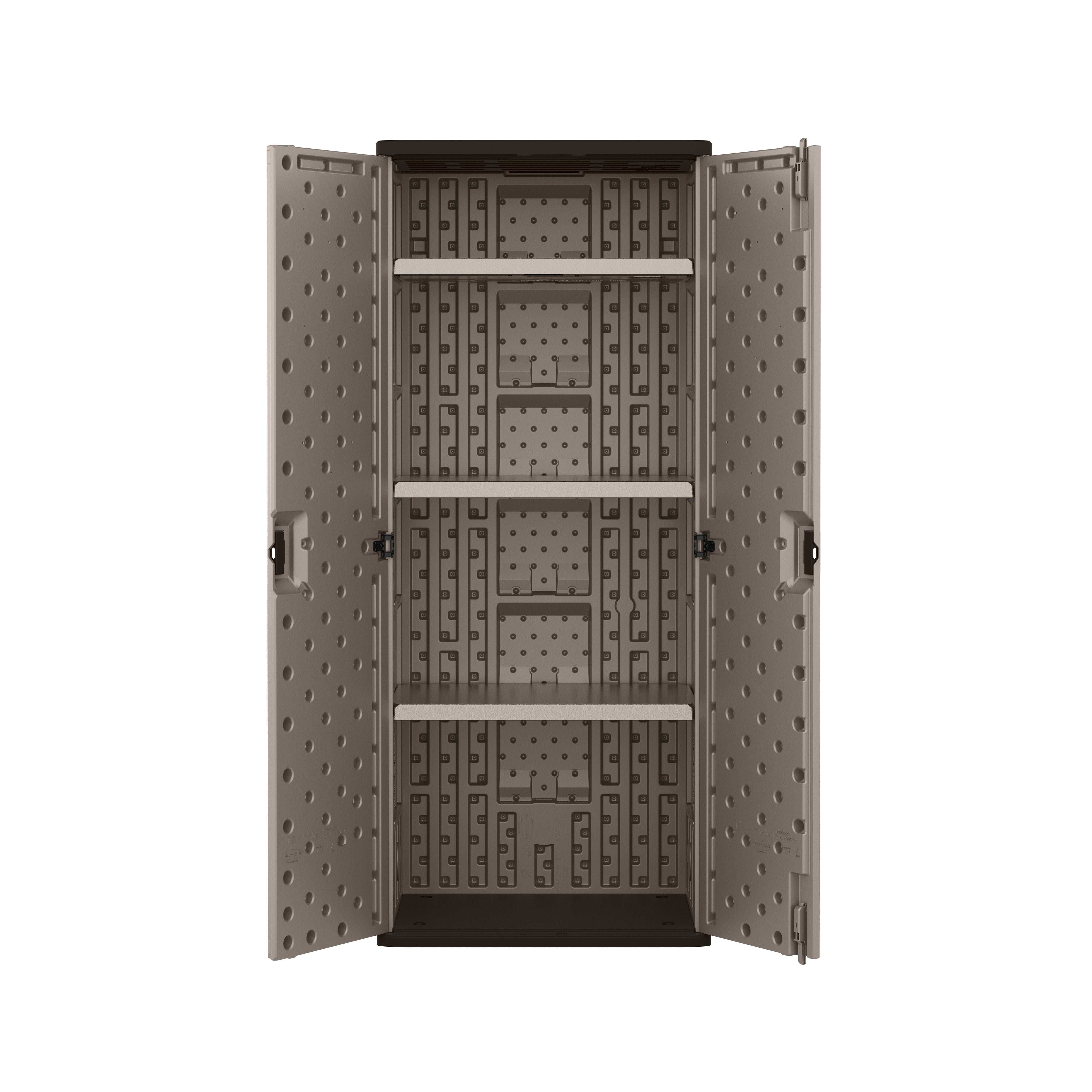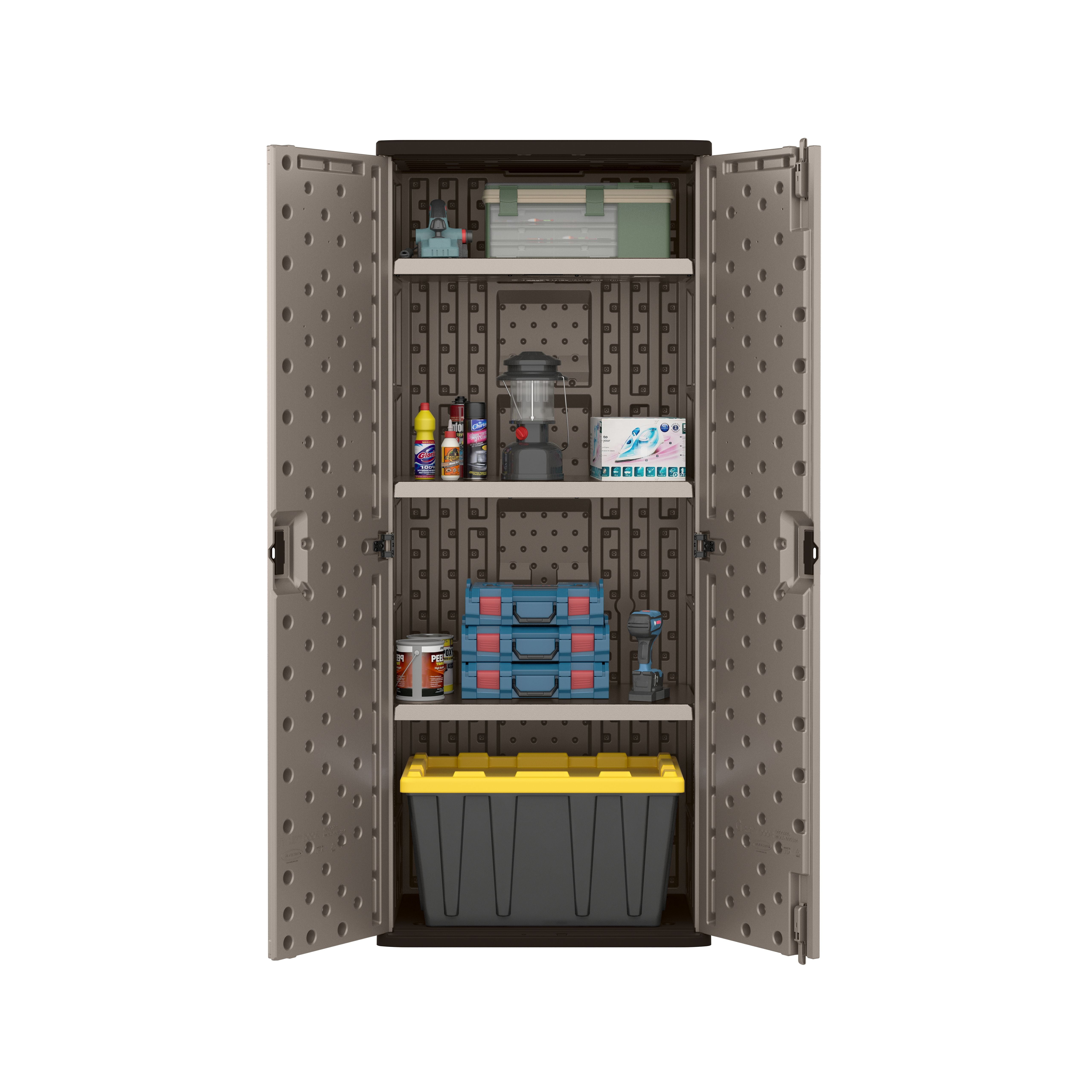 This freestanding base cabinet offers a practical storage solution for organizing toys, tools, equipment, and other household or garage items, keeping your space clean and clutter-free Built with double-wall resin panels that resist warping, rusting, and denting, this tall outdoor storage cabinet is engineered to withstand tough conditions in both indoor and outdoor settings The sleek platinum finish enhances any space with a contemporary look, while its compact yet functional design fits neatly into corners or against walls Features three metal-reinforced shelves, each capable of supporting up to 75 lbs., making it ideal for storing a variety of items, from heavy tools to bulky household supplies Measuring 20.25″ D x 30″ W x 72″ H, this outdoor garage storage offers ample storage space without dominating your floor plan, making it a versatile addition to any storage area