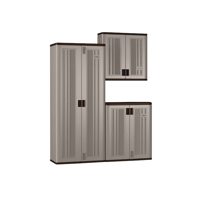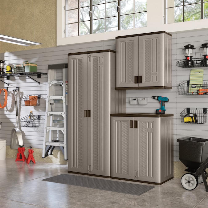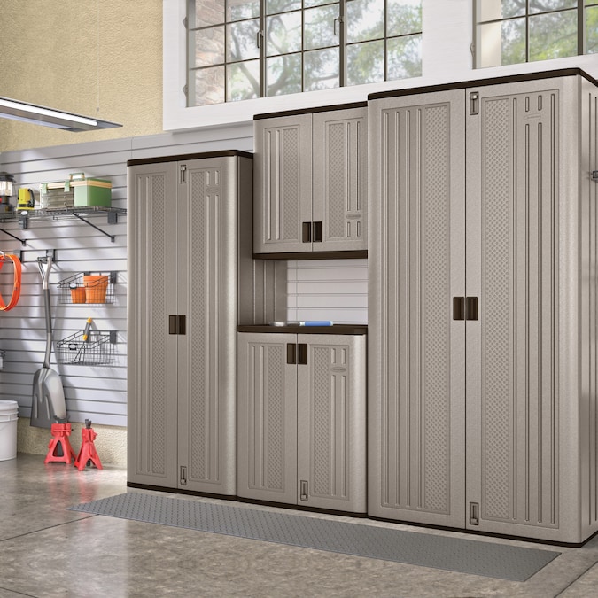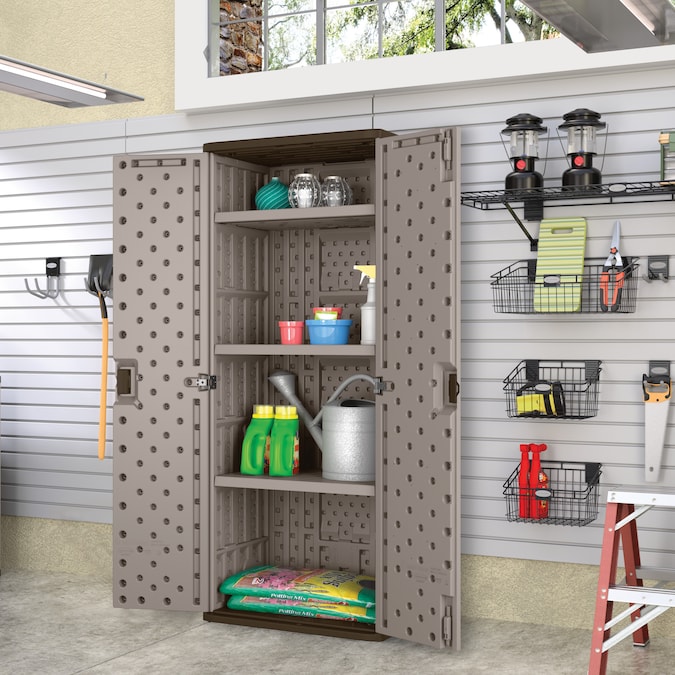 72 In. tall, storage cabinet, double wall resin construction, includes 3 steel reinforced shelves, each holds up to 75 lb, lockable doors, no tool assembly, platinum color doors, sides and back, slate color top, bottom and handles, assembled size: 30 In. W x 20-1/4 In. D x 72 In. H.