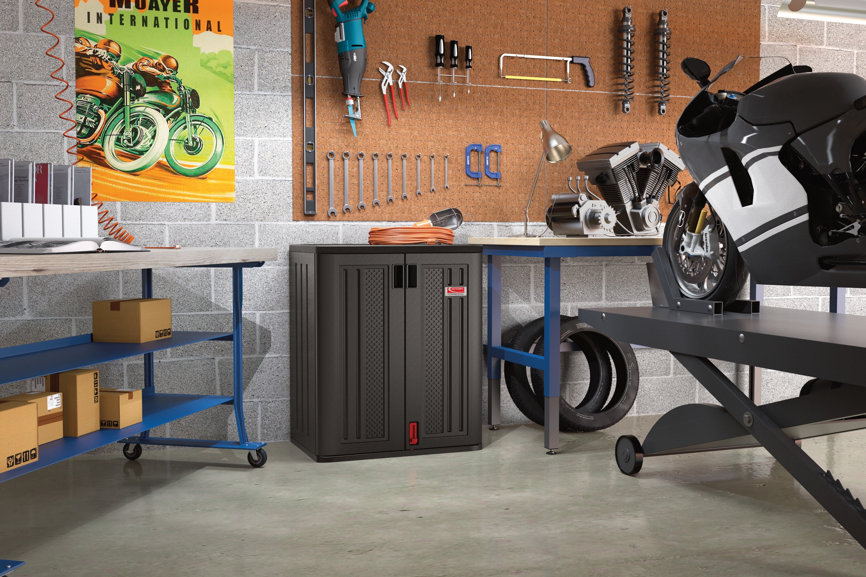 Perfect for storing toys, tools, lawn equipment, garden accessories, and more Multi-wall construction is resistant to warping, rusting, and denting Storage cabinet fits into the corner of a garage or shed 2 metal reinforced shelves hold up to 200 lbs. each for additional storage Doors are capable of locking to protect your valuables (lock not included) Black cabinet is easy to assemble and clean for your convenience