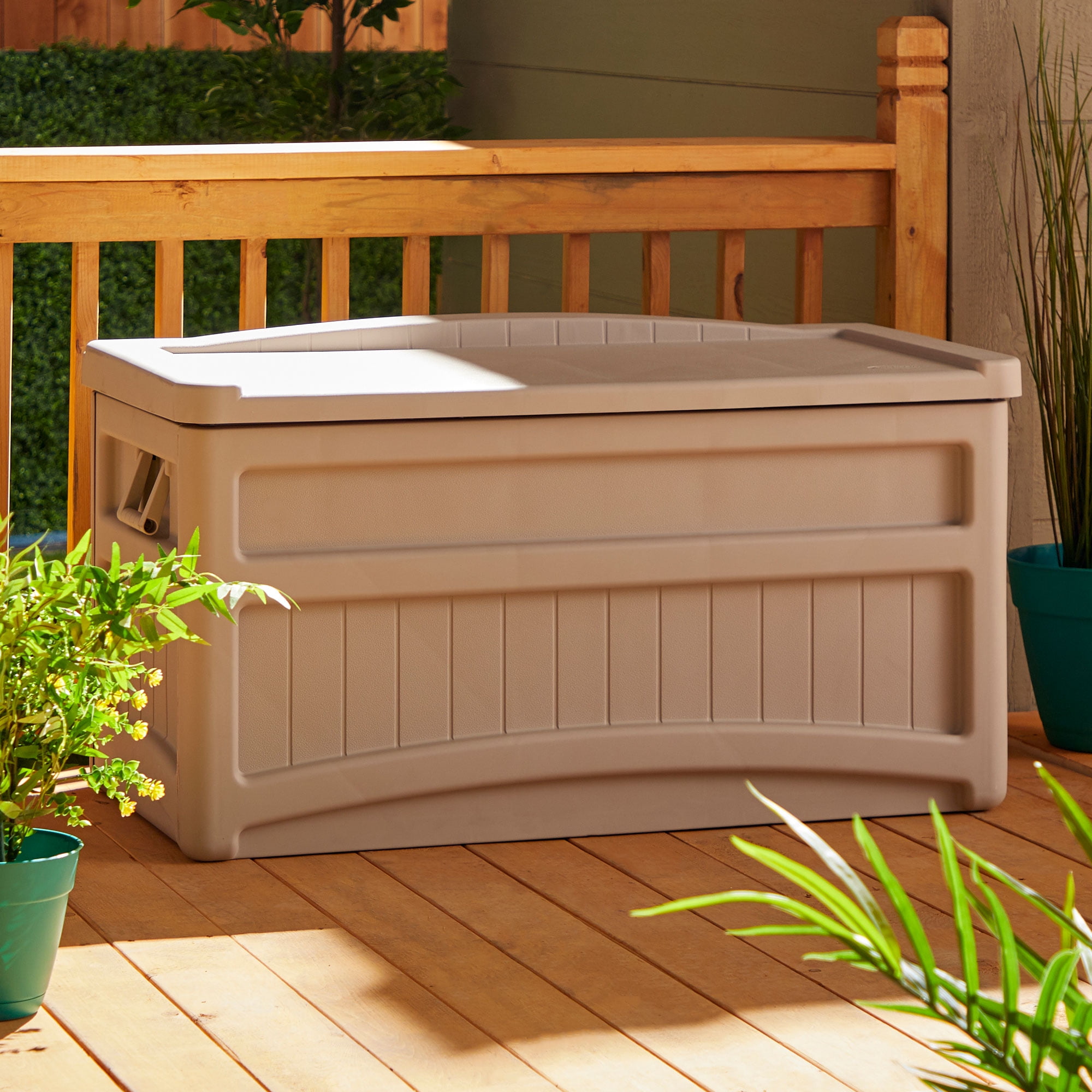 Keep your patio as neat as your home with the Suncast 73-Gallon Patio Storage Box. A convenient storage solution for use outdoors, this spacious 73-gallon outdoor storage bin fits everything from patio furniture to gardening tools. Constructed from durable resin, this deck storage box requires little maintenance and holds up all year long. The unique, stay-dry design protects the contents you place inside from rain, snow, and other moisture. Thanks to the built-in handles and wheels, you can easily move this box to wherever you need extra storage. The neutral light taupe color makes it easy for this box to fit into your existing outdoor decor.