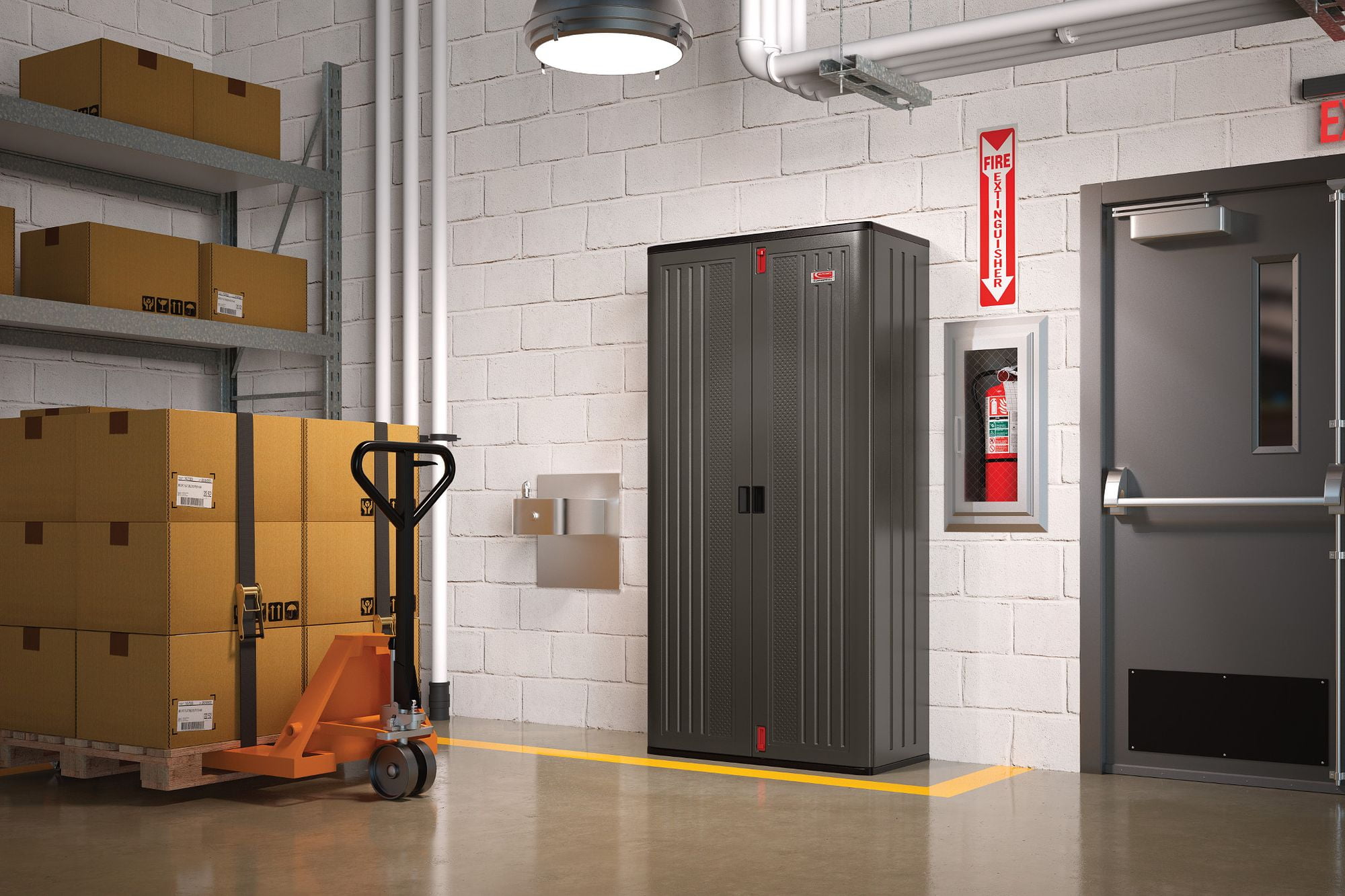 Suncast base storage cabinet perfect for storing toys, sporting equipment, tools, lawn care equipment, garden accessories, and more Multi wall construction that is resistant to warping, rusting, and denting to provide years of quality use Black storage cabinet that fits into the corner of a garage or shed creates an attractive and functional space Includes 4 metal reinforced shelves that holds up to 200 lbs. for additional storage Doors are capable of locking to protect your valuables. Metal mid-hinge assists in smooth door operation Cabinet is easy to assemble and clean for your convenience. Measures 20 1/4 in. x 40 in x 80 1/4 in., with the interior measuring 17 1/4 in. x 38 in. x 77 1/2 in. and a 37 in. x 77 1/2 in. door opening