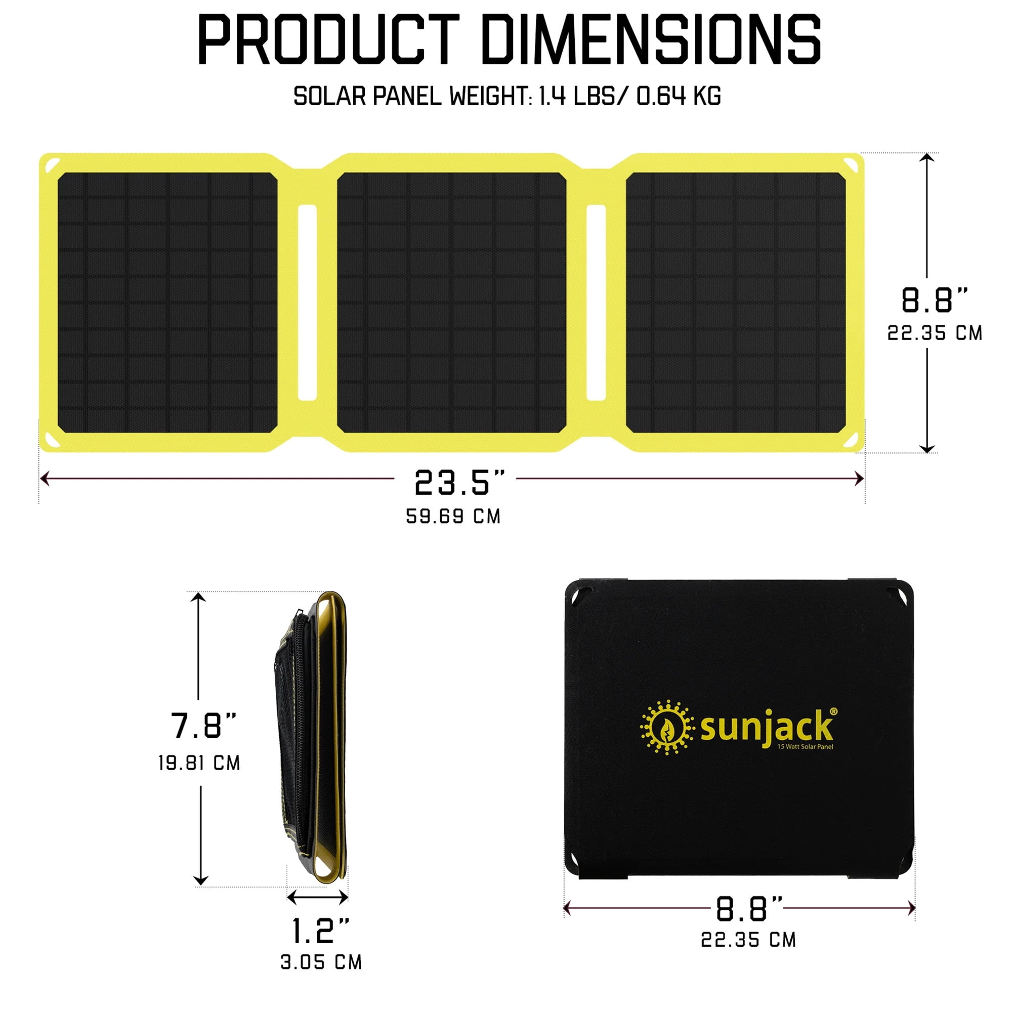 The SunJack solar panel’s weatherproof ETFE exterior layer improves performance and durability, extending the panel’s lifespan and requiring less maintenance compared to PET exterior layers used by most portable solar chargers. It’s also waterproof, shock-proof, dust-proof, and drop-proof. These panels fold down to the size of a tablet, making them easy to fit into any backpack. The integrated magnetic closure system eliminates the need for bulky straps. With the ability to pump out up to 3 Amps of power per USB port (15W max), this solar panel charger provides wall-outlet charging speeds. It features dual USB ports for charging both USB-A and Type-C devices. The ETFE construction’s high UV permeability (95%) makes it more efficient than other solar chargers using PET. The built-in smart IC chip intelligently identifies your device and maximizes charging speed while protecting against overcharging. It also automatically restores charging if shade occurs. Ideal for a variety of outdoor activities, including camping, backpacking, and hiking. It’s an essential addition to disaster, emergency, and hurricane prep kits for survival. Never be caught without power, as it’s compatible with cell phones and any USB device, including iPhone, Samsung, Pixel, and iPad. Backed by a 12 month hassle-free warranty from a local USA company. Solar Panel: 15 Watts of high-efficiency mono-crystalline power Output Port 1: USB-C (5V/3A) Output Port 2: USB-A (5V/3A) Unit Size folded: 7.8″ x 8.82″ x 1″ Unit Size unfolded: 23.5″ x 8.82″ x 0.1″ Unit Weight: 1.4lbs / 0.64kg