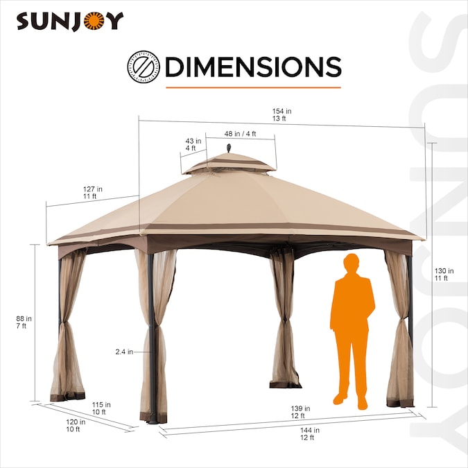Instantly create an outdoor gathering spot for family and friends away from the glaring sun and pesky insects. This 10.5 ft. x 13 ft. soft-top gazebo by the world’s leading ready-to-assemble outdoor structure maker, Sunjoy, creates a perfect outdoor setting. Keep cool under the weather-resistant 2-tier ventilated canopy supported by the rust-resistant steel frame. The outdoor fabric and trimmed mosquito netting is designed to withstand the elements. Amplify the wow factor by suspending a chandelier from the incorporated ceiling hook for functional light and high design. With straight-forward, easy-to-follow assembly instructions you’ll be relaxing in your favorite new outdoor living space in no time.