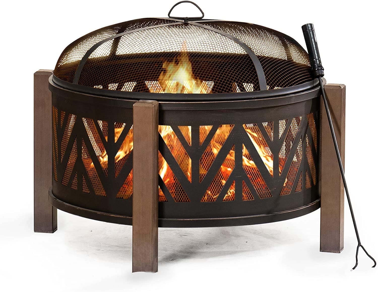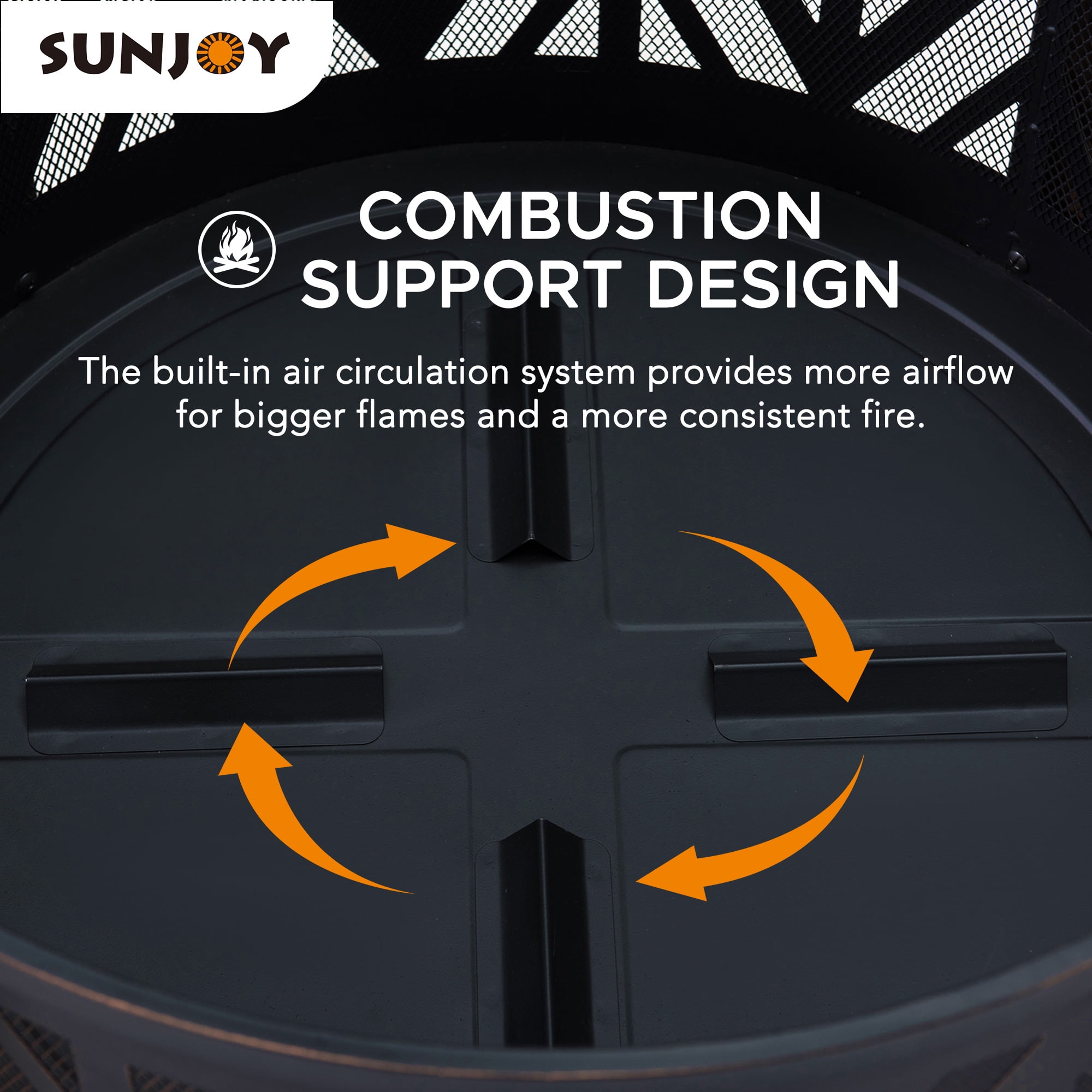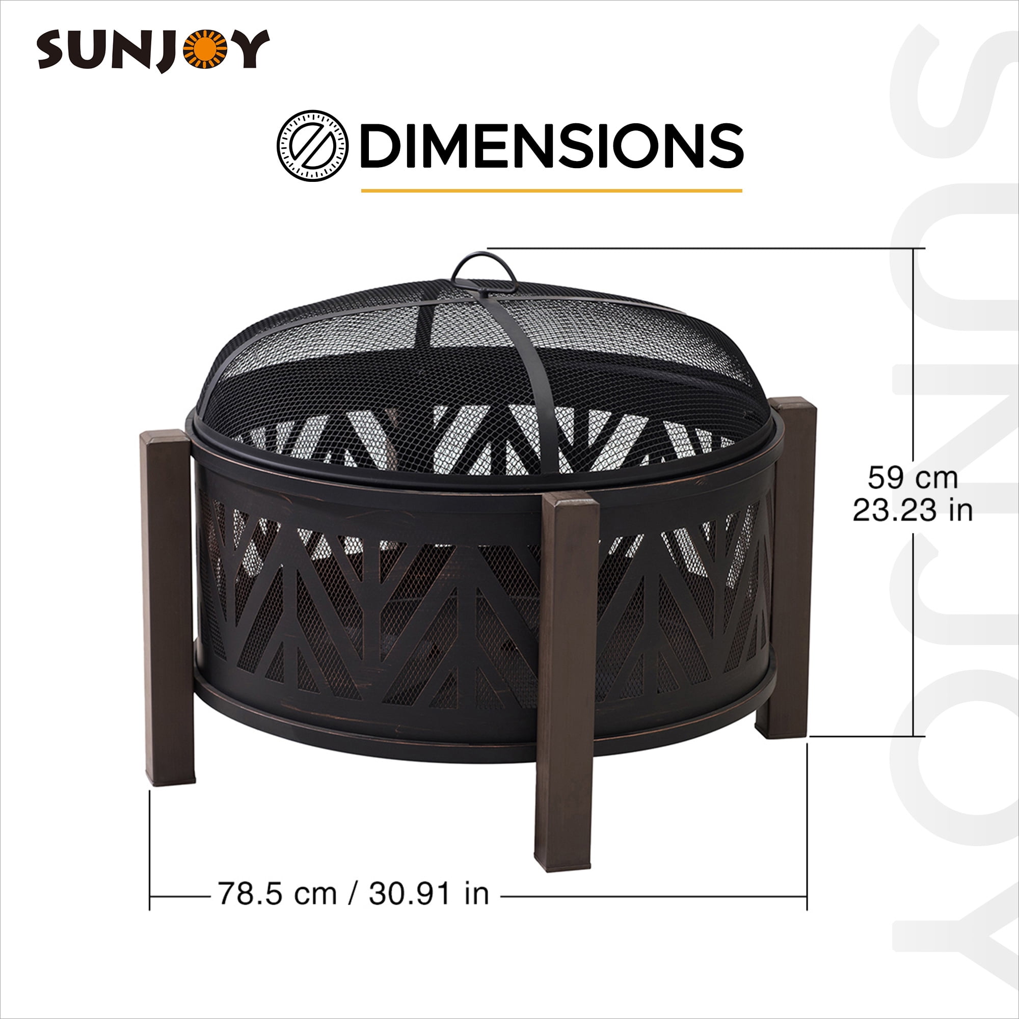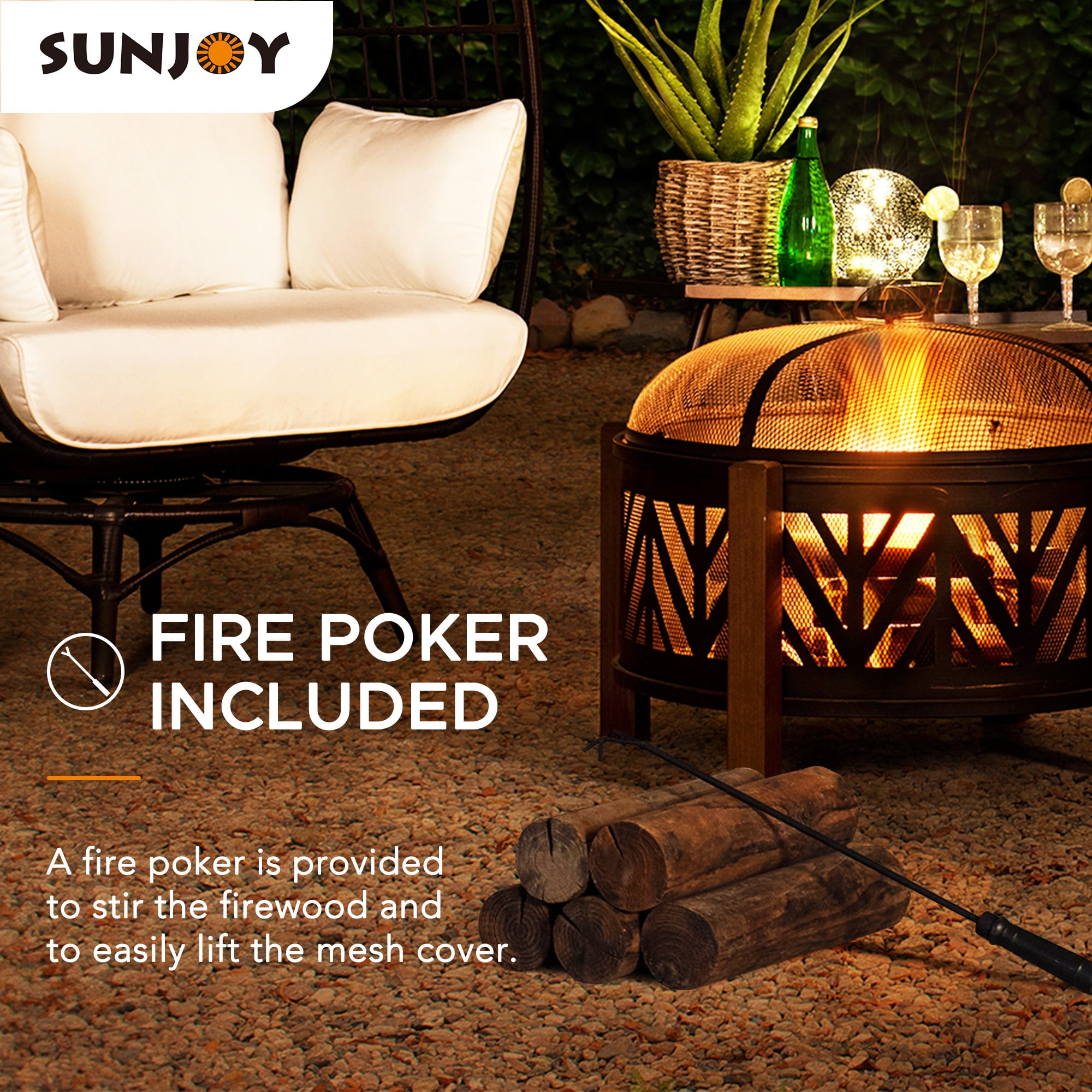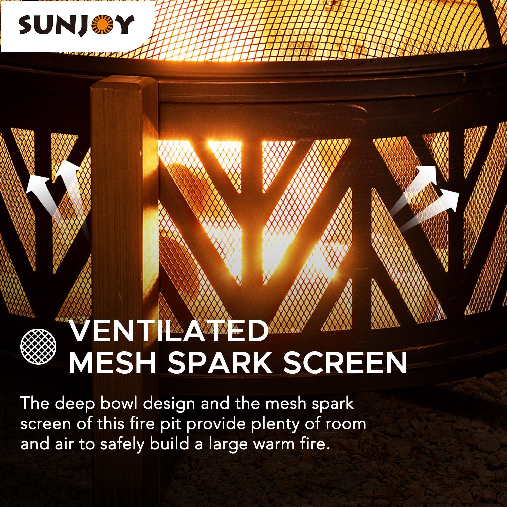 This fire pit features a deep and spacious fire bowl with an inner diameter of 27″, and a height of 11.6″. The fire bowl features thick steel construction with a high-temperature-resistant coating, which is durable and large enough to accommodate more logs and build larger campfires. This fire pit is very easy to set up and comes with illustrated assembly instructions and is backed by an experienced customer service team ready to answer any questions that may arise. Professional Assembly Services for an additional fee are available. Contact Sunjoy Customer Service for more information. This outdoor fire pit comes with a fire poker and a steel mesh spark screen to safely catch embers and sparks while providing more air for larger flames and more heat output. The size of this wood burning fire pit is perfect to gather the whole family around, whether roasting marshmallows, enjoying a glass of wine, or just swapping stories under the stars. Overall size 30.91″ dia. x 30.91″ H, Weight 21.4 lbs. The mesh spark guard design provides more airflow for larger flames and more consistent fire. The bottom of the bowl also features burner support rods to increase airflow and keep the fire burning. The 11.6 inch deep fire bowl design and the mesh spark screen of this fire pit provide plenty of room and air to safely build a large warm fire. This stylish fire pit features a brown woodgrain finish legs that make this an attractive addition to the outdoor, patio, or backyard. Black powder-coated steel frame and mesh screen Four brown woodgrain heat transfer legs Heavy-mesh spark guard body The 11.6’’ deep-bowl design accommodates large fires Combustion support design provides more airflow for bigger flames Poker tool included Easy to assemble
