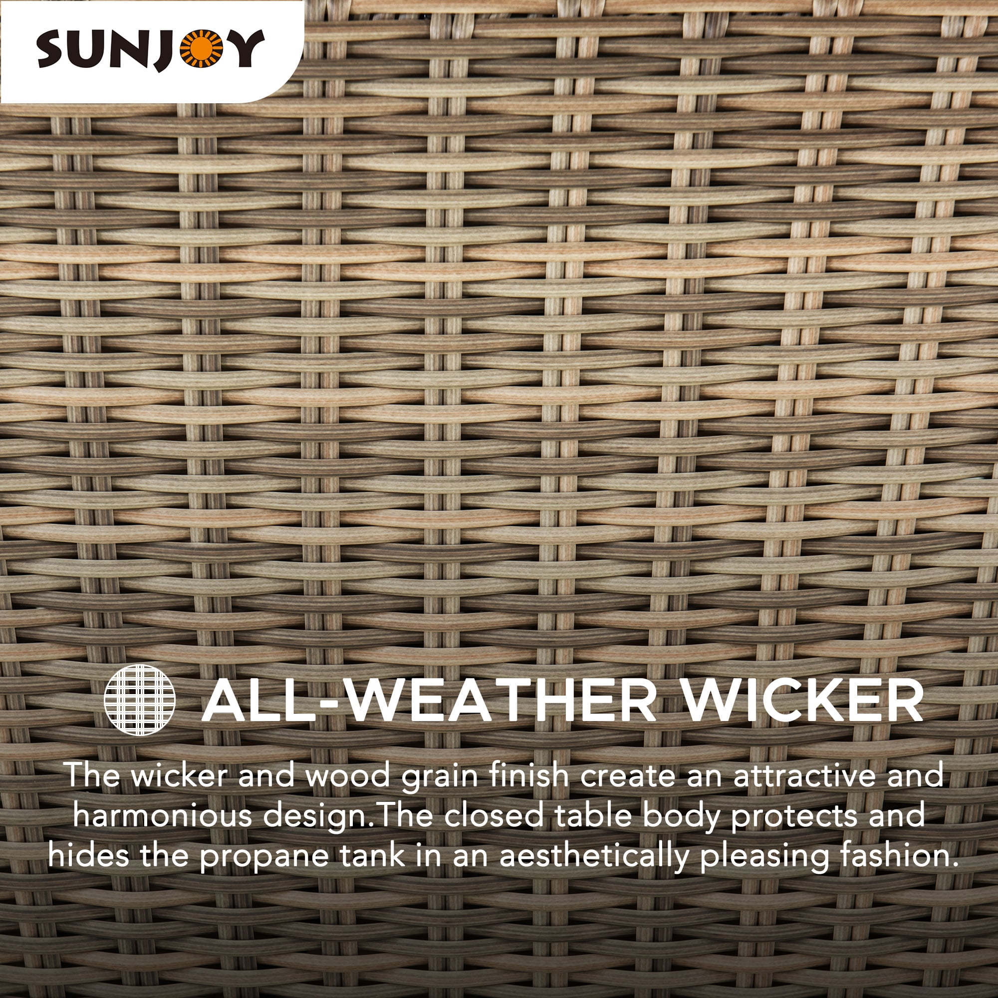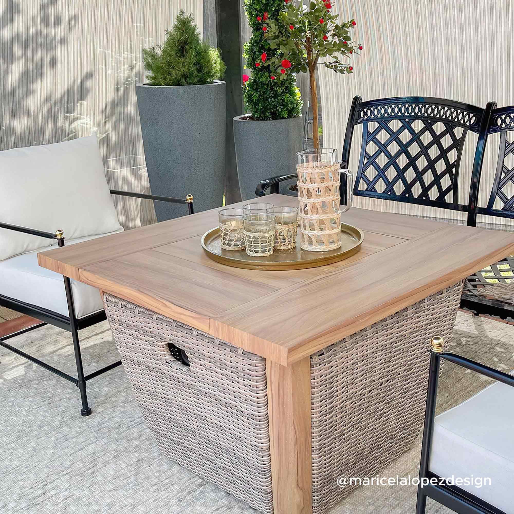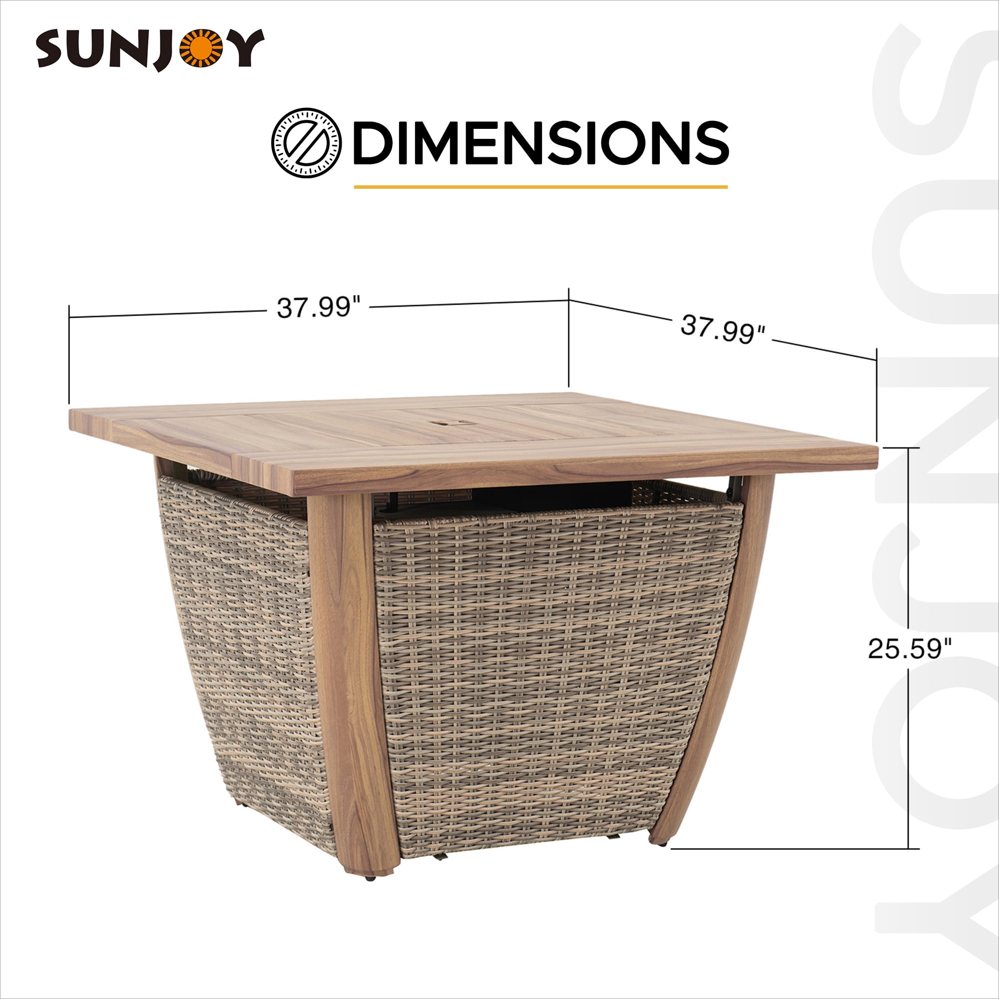 Durable & High-Quality Material: Constructed with a thick powder-coated steel frame and a natural-looking wood grain heat-transfer steel tabletop, this fire pit will complement a variety of outdoor spaces. Fashionable Appearance & Design: Featuring a unique design, this fire pit has an all-weather wicker table base, the stylish and high-class aesthetics make this fire table an attractive addition to the garden, patio, or balcony. Effortless Operation: Built-in electric ignition for an easy start, and via the adjustment knob the flame size can be regulated to meet various warmth needs. When not in use as a fire pit, cover with the lid, and it can be easily converted into an outdoor table or coffee table. Perfect Size: 37.99″ x 37.99″ x 25.59″, weight 77.16 lbs. Perfect size to gather the whole family around. Whether roasting marshmallows, enjoying a glass of wine, or just swapping stories under the stars, this outdoor propane burning fire pit transforms your backyard into a cozy relaxation destination. Enjoy Coffee & Dining Outside: This hidden propane tank fire pit table is a perfect addition to various outdoor living spaces, such as patios, decks, backyards, gardens, swimming pools, lawns, etc. Easy to Set Up: This fire pit table is very easy to set up and comes with illustrated assembly instructions and is backed by an experienced customer service team ready to answer any questions that may arise. All-weather Wicker The wicker and wood grain finish create an attractive and harmonious design. The closed table body protects and hides the propane tank in an aesthetically pleasing fashion. Natural Wood-looking Finish This chic and stylish fire pit table features a handsome woodgrain finish that complements a wide array of outdoor spaces. Protective Lid Included With the protective lid, when not use it as a fire pit, the unit can be easily converted into an outdoor table or coffee table. The stylish appearance makes for an attractive addition to your garden, patio, or balcony. Adjustment knob for Easy Control The electric ignition switch makes the unit easy to start. The flame intensity is controlled by an adjustment knob to meet various warmth needs. Storage Space Built-in storage space for the propane tank (not included). Provides ample warmth and creates a warm and romantic bonfire atmosphere. Magnetic Side Door With the magnetic side door, you can quickly change and conceal your propane tank. Easily insert/remove the propane tank through the door or check on the propane tank directly. Powder-coated steel frame with woodgrain heat transfer table top Light brown all-weather wicker Storage space for LP tank (LP tank not included) Adjustment knob for easy control Magnetic side door design for easy access Protective lid and lava rocks included Easy to assemble