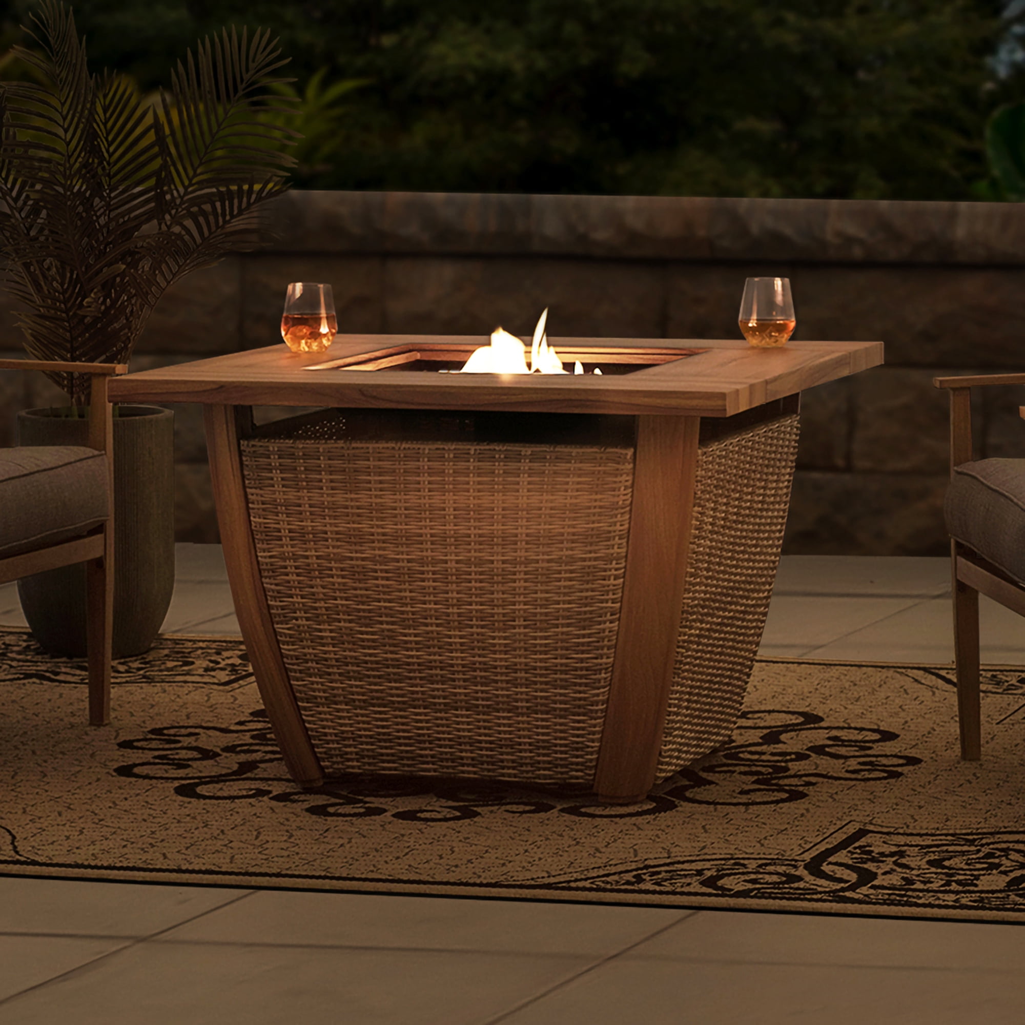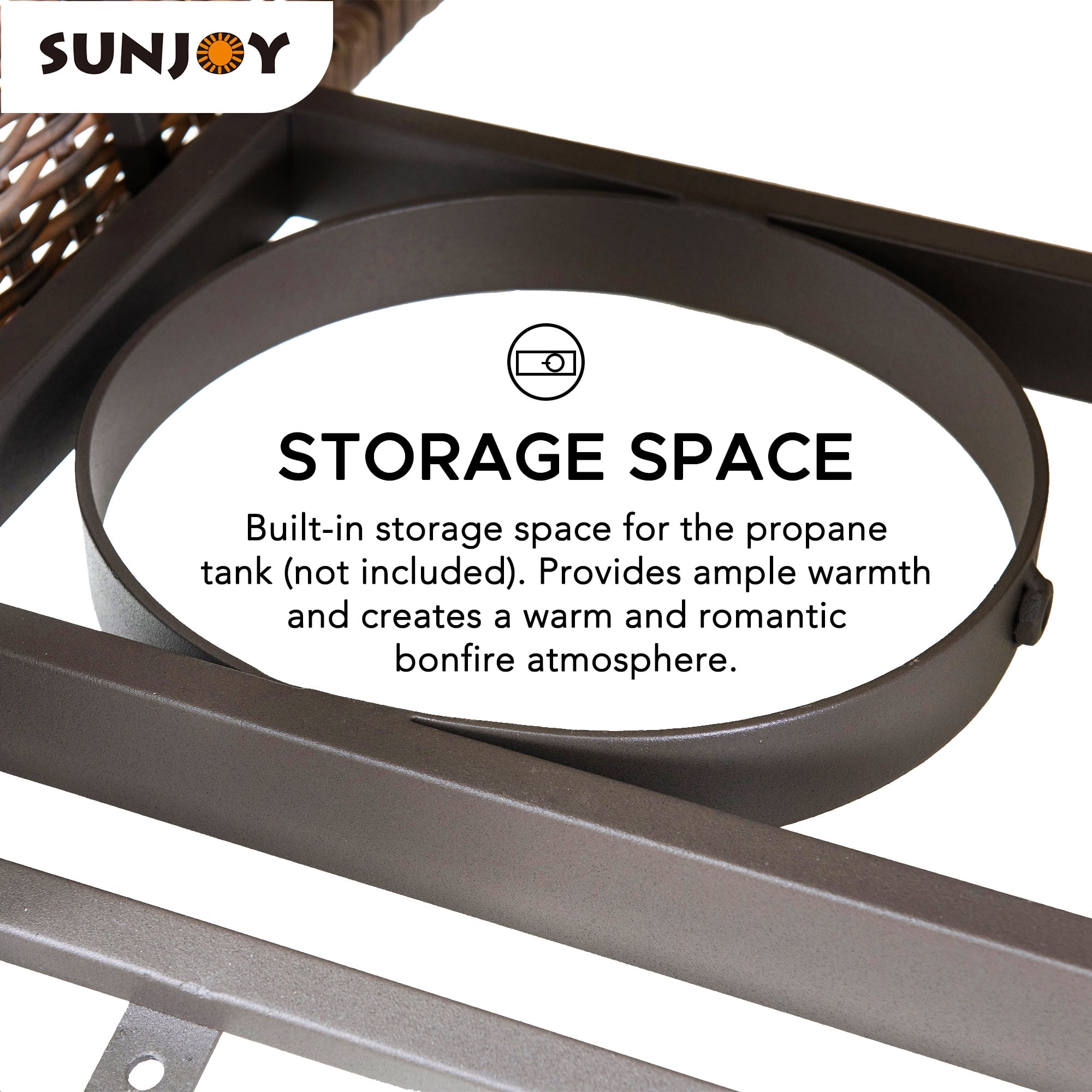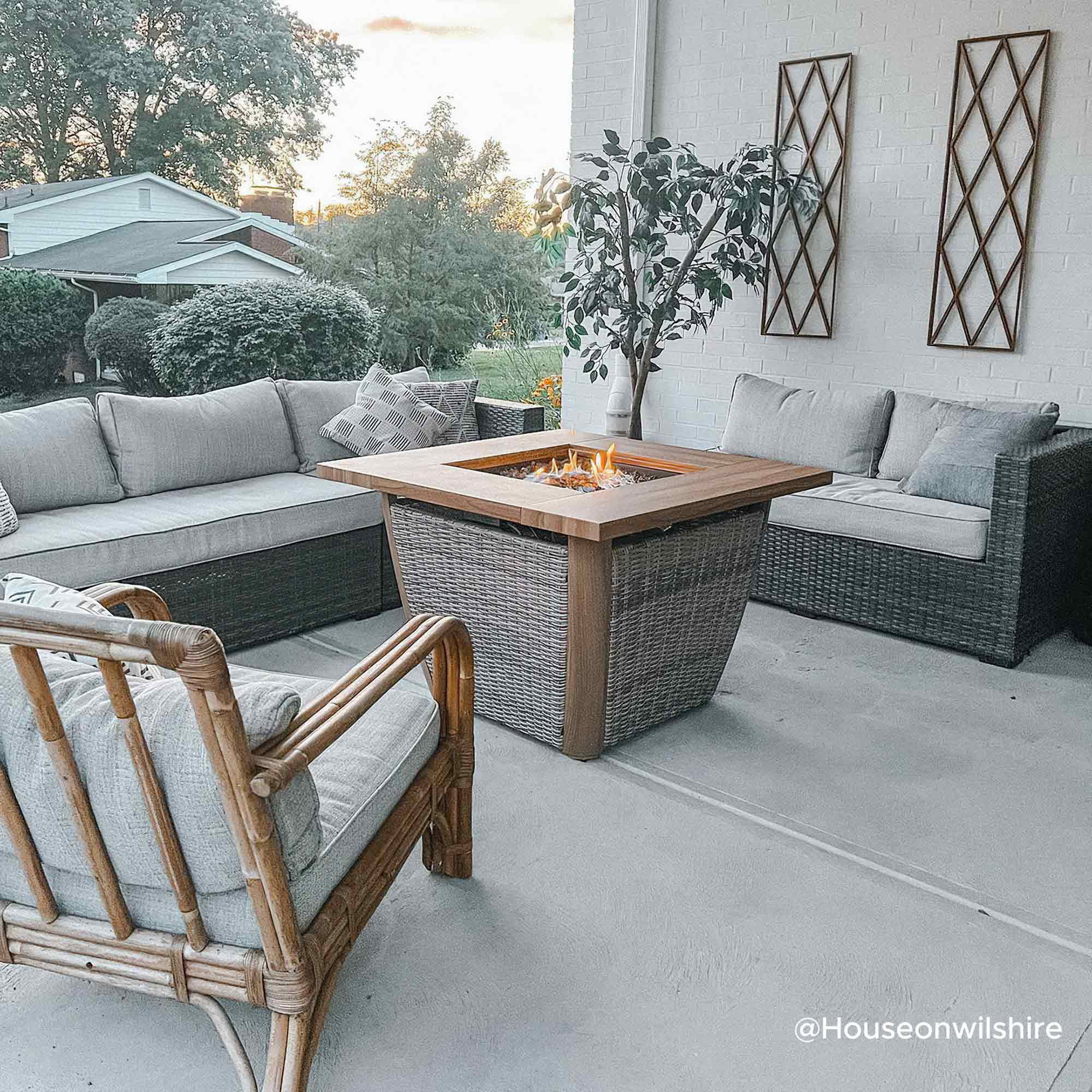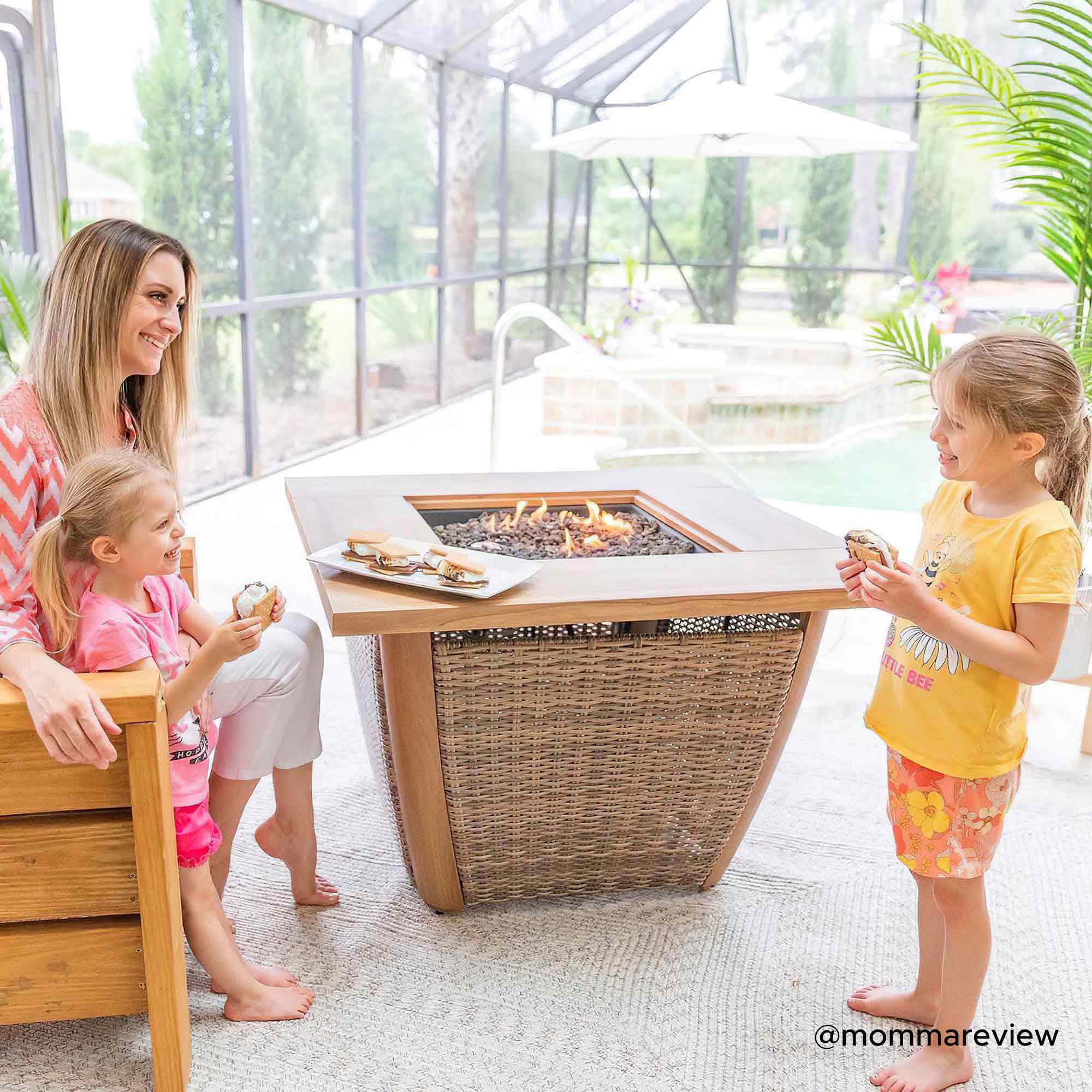 Durable & High-Quality Material: Constructed with a thick powder-coated steel frame and a natural-looking wood grain heat-transfer steel tabletop, this fire pit will complement a variety of outdoor spaces. Fashionable Appearance & Design: Featuring a unique design, this fire pit has an all-weather wicker table base, the stylish and high-class aesthetics make this fire table an attractive addition to the garden, patio, or balcony. Effortless Operation: Built-in electric ignition for an easy start, and via the adjustment knob the flame size can be regulated to meet various warmth needs. When not in use as a fire pit, cover with the lid, and it can be easily converted into an outdoor table or coffee table. Perfect Size: 37.99″ x 37.99″ x 25.59″, weight 77.16 lbs. Perfect size to gather the whole family around. Whether roasting marshmallows, enjoying a glass of wine, or just swapping stories under the stars, this outdoor propane burning fire pit transforms your backyard into a cozy relaxation destination. Enjoy Coffee & Dining Outside: This hidden propane tank fire pit table is a perfect addition to various outdoor living spaces, such as patios, decks, backyards, gardens, swimming pools, lawns, etc. Easy to Set Up: This fire pit table is very easy to set up and comes with illustrated assembly instructions and is backed by an experienced customer service team ready to answer any questions that may arise. All-weather Wicker The wicker and wood grain finish create an attractive and harmonious design. The closed table body protects and hides the propane tank in an aesthetically pleasing fashion. Natural Wood-looking Finish This chic and stylish fire pit table features a handsome woodgrain finish that complements a wide array of outdoor spaces. Protective Lid Included With the protective lid, when not use it as a fire pit, the unit can be easily converted into an outdoor table or coffee table. The stylish appearance makes for an attractive addition to your garden, patio, or balcony. Adjustment knob for Easy Control The electric ignition switch makes the unit easy to start. The flame intensity is controlled by an adjustment knob to meet various warmth needs. Storage Space Built-in storage space for the propane tank (not included). Provides ample warmth and creates a warm and romantic bonfire atmosphere. Magnetic Side Door With the magnetic side door, you can quickly change and conceal your propane tank. Easily insert/remove the propane tank through the door or check on the propane tank directly. Powder-coated steel frame with woodgrain heat transfer table top Light brown all-weather wicker Storage space for LP tank (LP tank not included) Adjustment knob for easy control Magnetic side door design for easy access Protective lid and lava rocks included Easy to assemble