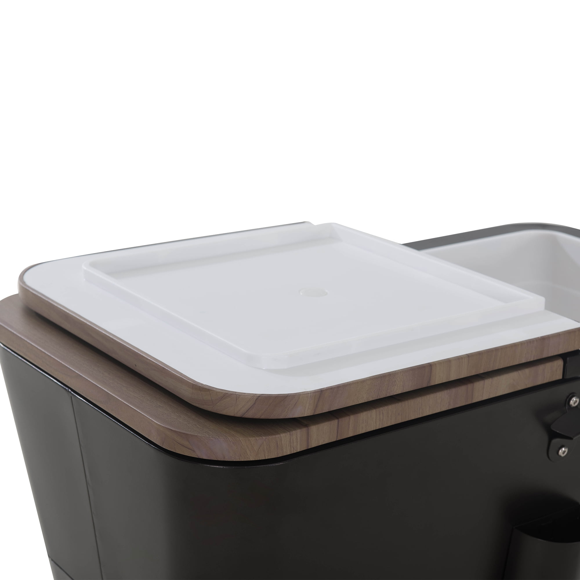 Convenient Design: This cooler has built-in a bottle opener and bottle cap catcher for keeping your party area nice and tidy, and a stainless-steel drain plug for easy cleaning. The concise recessed metal pull handles on the covers allow for easy access. Large Capacity: Spacious 80 quart/20-gallon fill capacity can hold up to 40 bottles, or 80 cans, and all your favorite fruits or beverages. Perfect for your outdoor gatherings and activities. Four Sturdy Wheels: All four wheels feature 360-degree rotation for easy transportation. Two-wheel brake system stably secures the cooler in place when needed. Item Dimensions: 34.25 in. L x 18.9 in. W x 34.06 in. H Item Weight: 46.09 lbs Made of rust-resistant steel with a natural-looking wood grain finish Caster locks on two wheels for security and safety 4 wheels let you easily move the cooler, even when fully stocked Spacious 80 quart/20-gallon capacity Integrated steel bottle cap catcher box Opener included for bottles Well insulated construction keeps contents cold for a long time Quality recessed metal pull handles for easy access Roomy supply shelf underneath for restock or other supplies Easily removable plug for comfortable, no-hassle draining Some assembly required