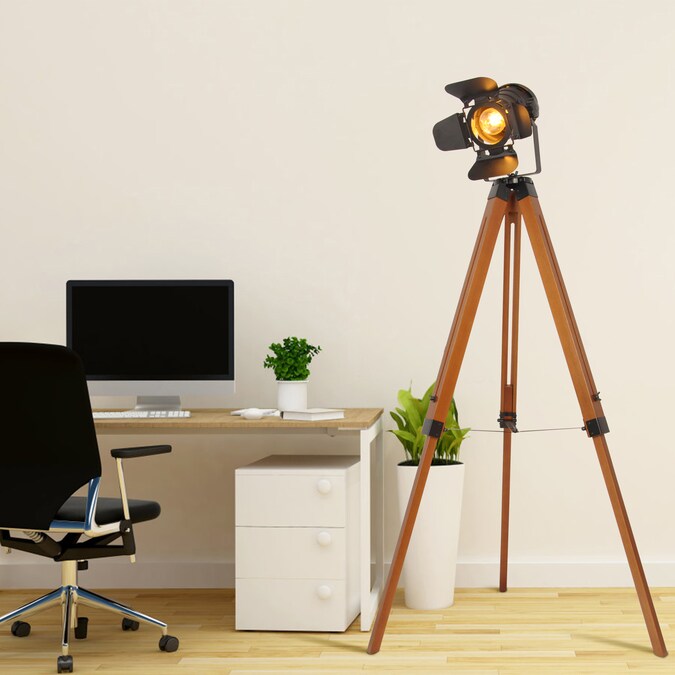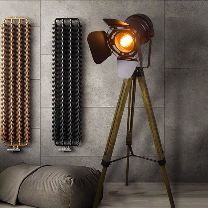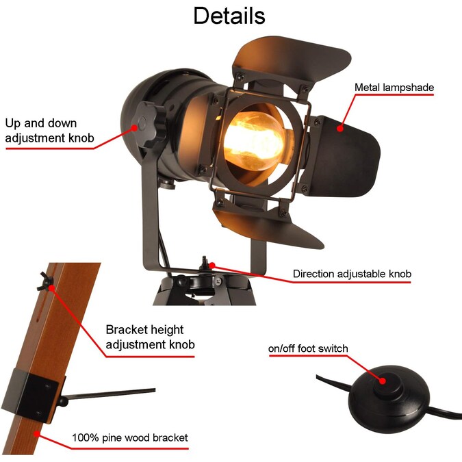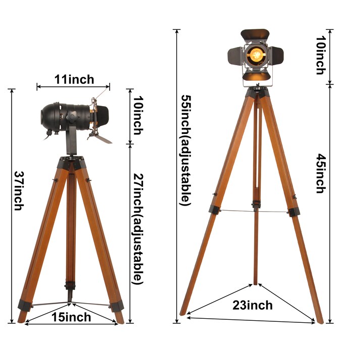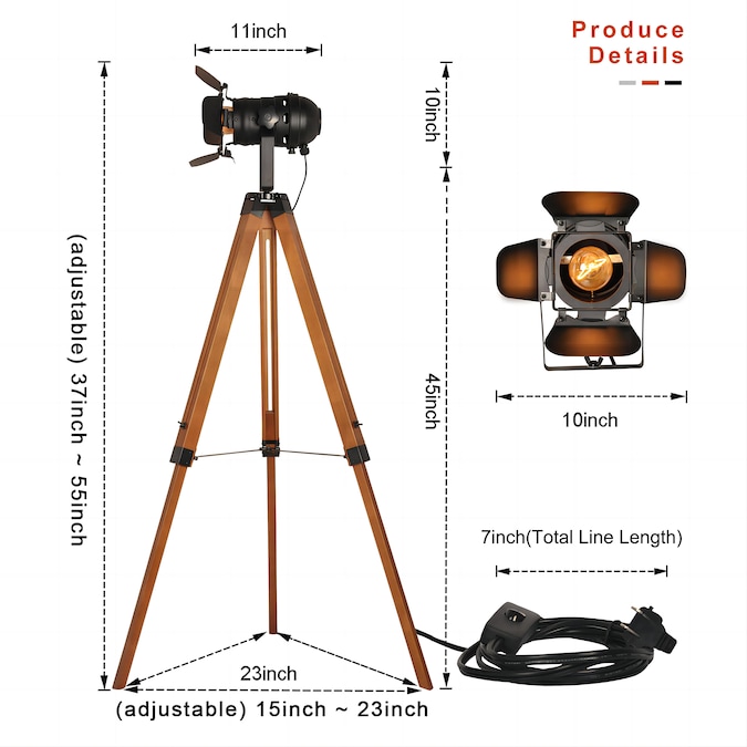 - Camera Tripod Floor Lamp Dimension – Material: Metal + Natural Wood, Length 370mm / 14.56”, Width 310mm / 12.2”, Height (adjustable): 110-137cm /43-53”, Weight: 3.9kg, Light source: E26 Edison bulb, Voltage:110-120 (V), In-line power on / off switch design, 2.8 meters long wire-controlled foot switch, can adapt to lighting requirements.