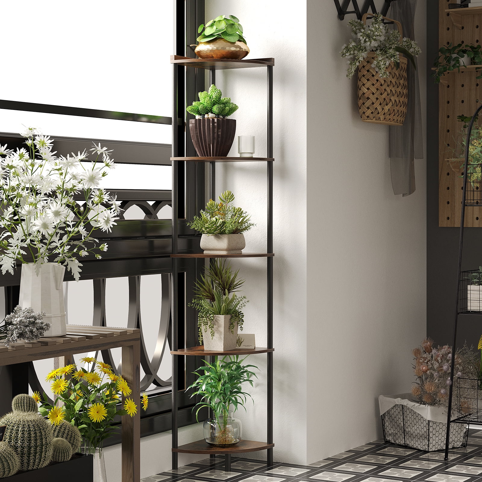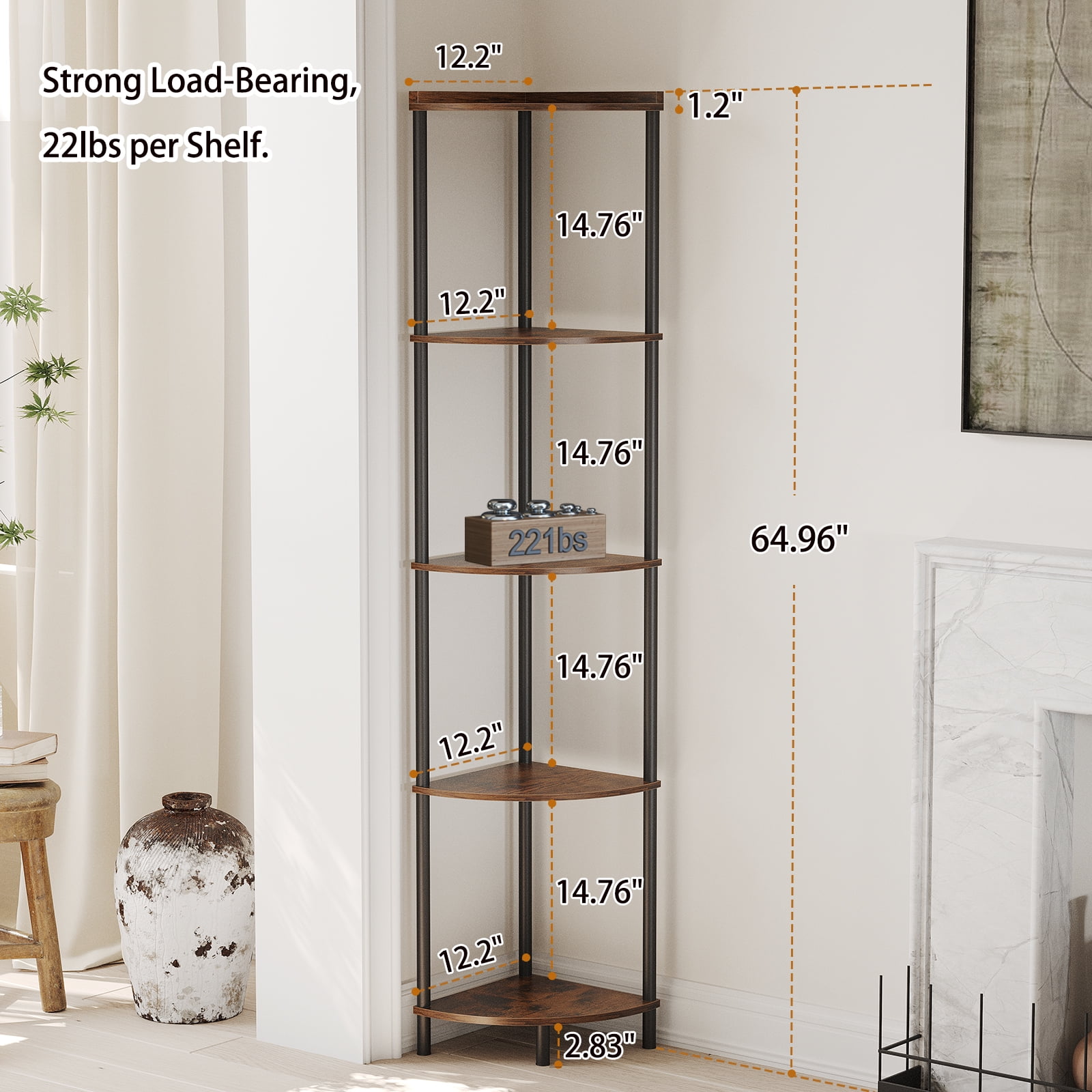 SUNMORY 5 Tier Industrial Corner Bookcase, Wood Composite Metal Brown, 2.2″ x 12.2″ x 64.9″ Multifunctional Corner Shelf: Versatile design allows use as a corner bookshelf, display shelf, storage shelf, or plant shelf in various spaces including living rooms, bedrooms, home offices, kitchens, hallways, balconies, and bathrooms. The 90° right-angle design maximizes unused corner space for functional storage 5-Tier Large Storage Capacity: Standing at 64.96 inches tall with a shelf radius of 12.2 inches and 14.76 inches of space between shelves, this tall shelf offers ample storage for books, photo frames, decorations, centerpieces, potted plants, and other household items Sturdy, Stable, Durable & Safe: Constructed from high-grade MDF board and a durable metal tube frame, each shelf supports up to 22 lbs. The four-leg design and included anti-tip kit secure the shelf to the wall, ensuring stability and safety Urban Industrial and Fashionable Design: The rustic brown and black color combination merges classical and modern styles, adding a touch of luxury. Unique wood grain finishes and metallic elements create an industrial feel, enhancing the decor of any room Easy to Assemble: Simple structure with detailed instructions included. The installation process is straightforward, taking approximately 5-10 minutes. Reminder: Ensure each post is tightened for overall stability