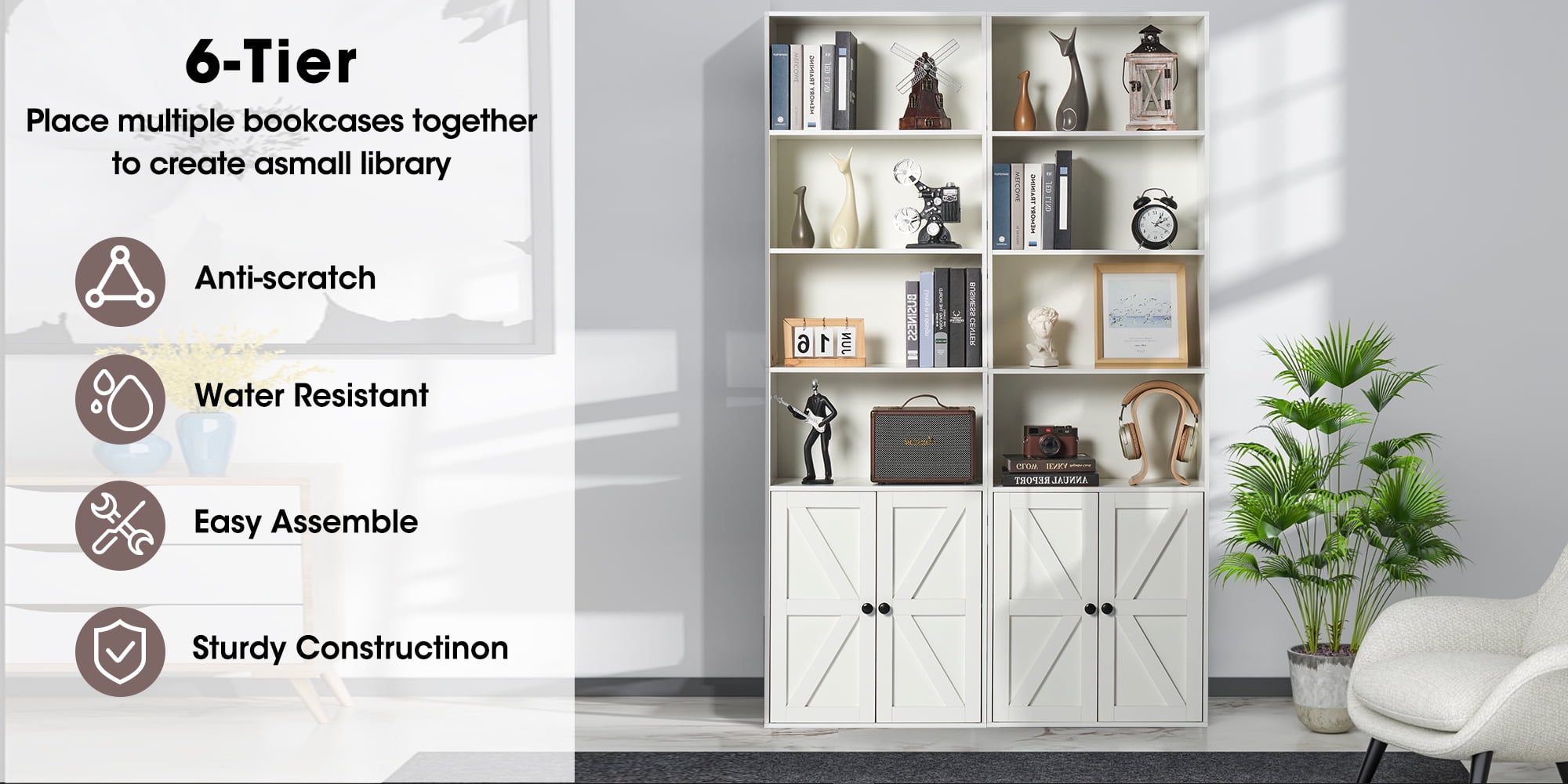 Sunmthink 6-tier Standard Bookcase with Storage and Two Barn Doors, White