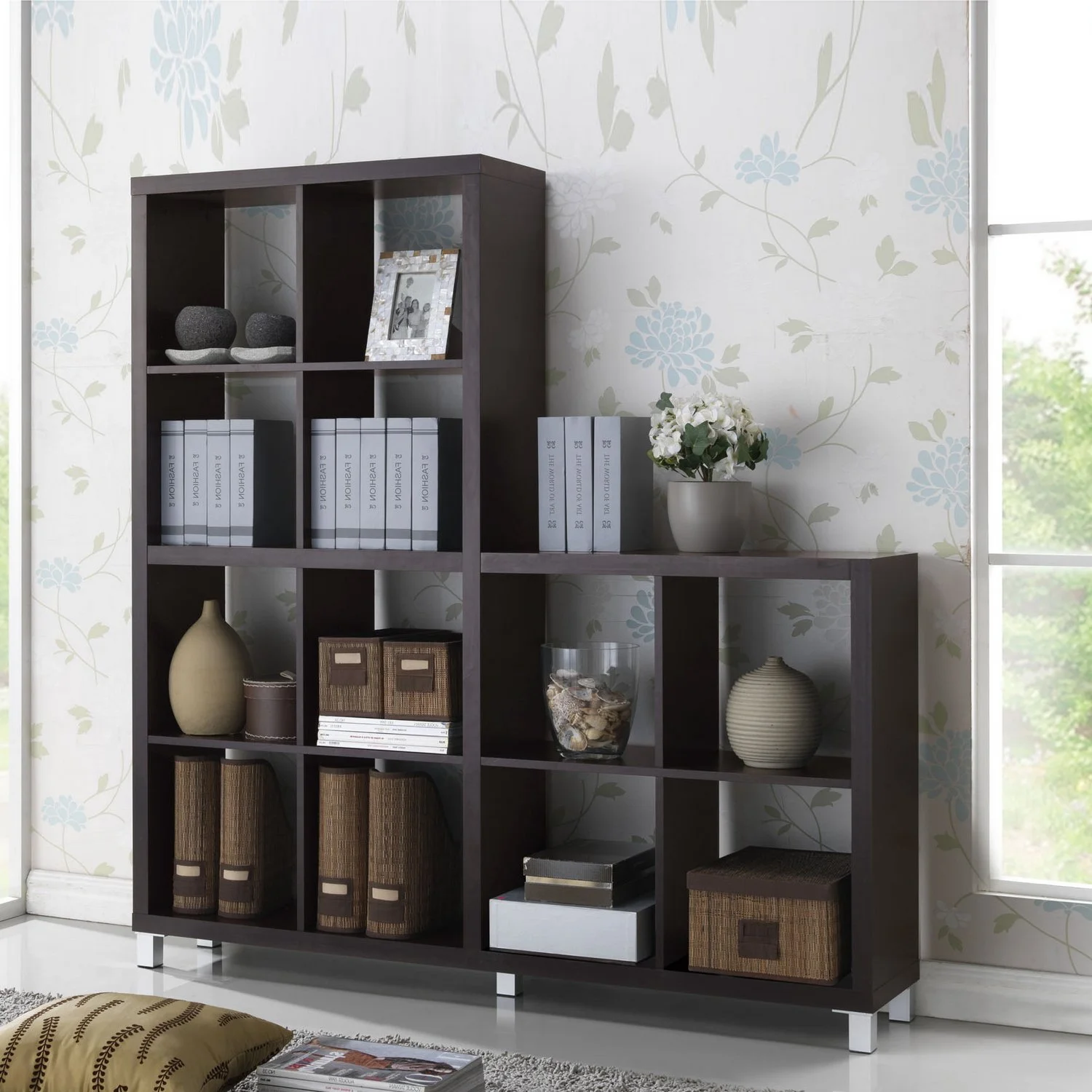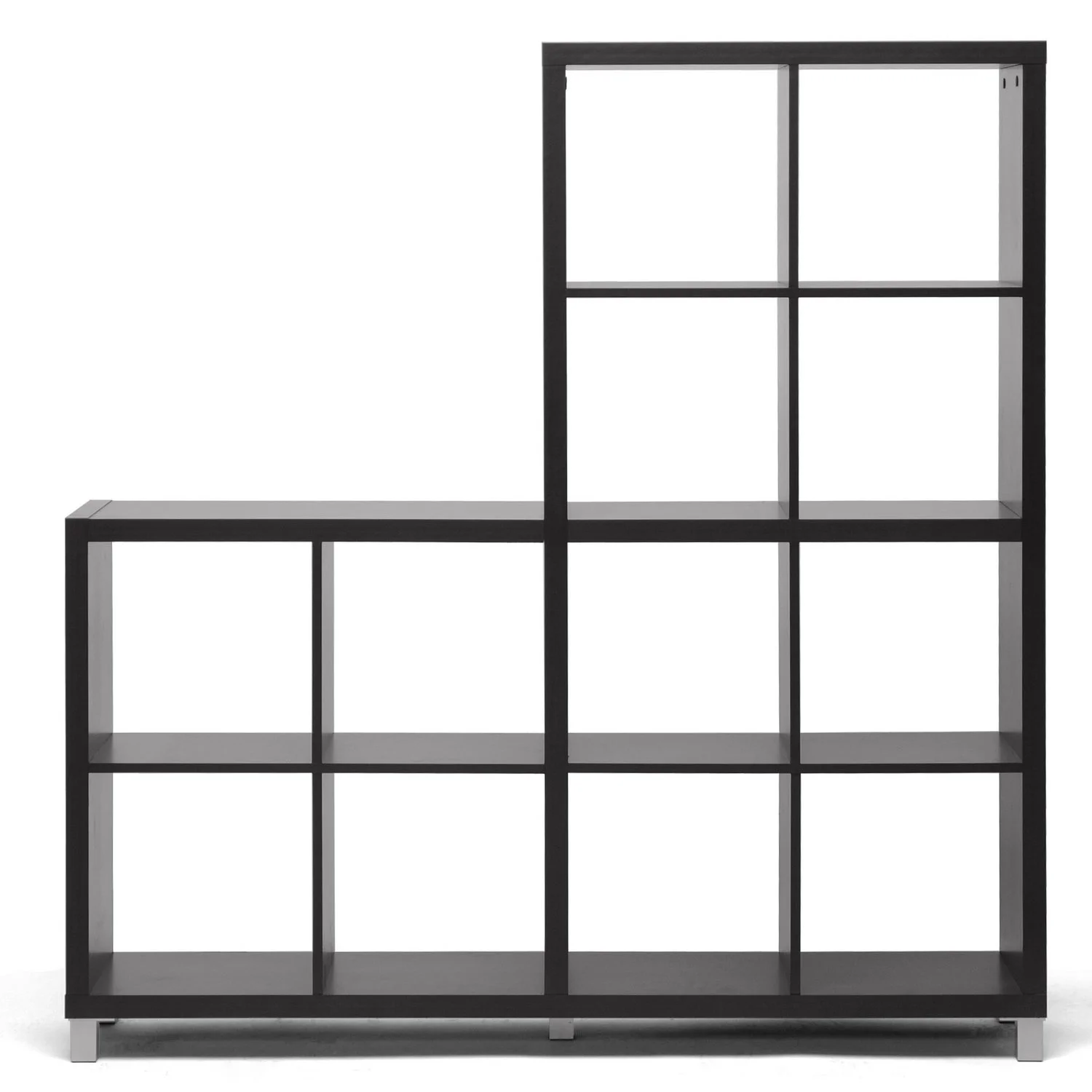 The Sunna Designer Shelving Unit is a 12 cube-based modern bookshelf made of dark brown faux wood grain paper veneer over a frame of engineered wood. Silver plastic legs with non-marking feet complete this Malaysian-made modern display unit. Assembly is required. To clean, wipe with a dry cloth. Features: Color: dark brown Shelf Dimension: 13.25″ H x 13.25″ W x 11.5″ D Made of engineered wood and faux wood grain paper veneer Modern style Silver plastic legs with non-marking feet Product Weight: 86lbs Specifications: Product Dimensions: 11.5″ H x 61″ W x 58.25″ D