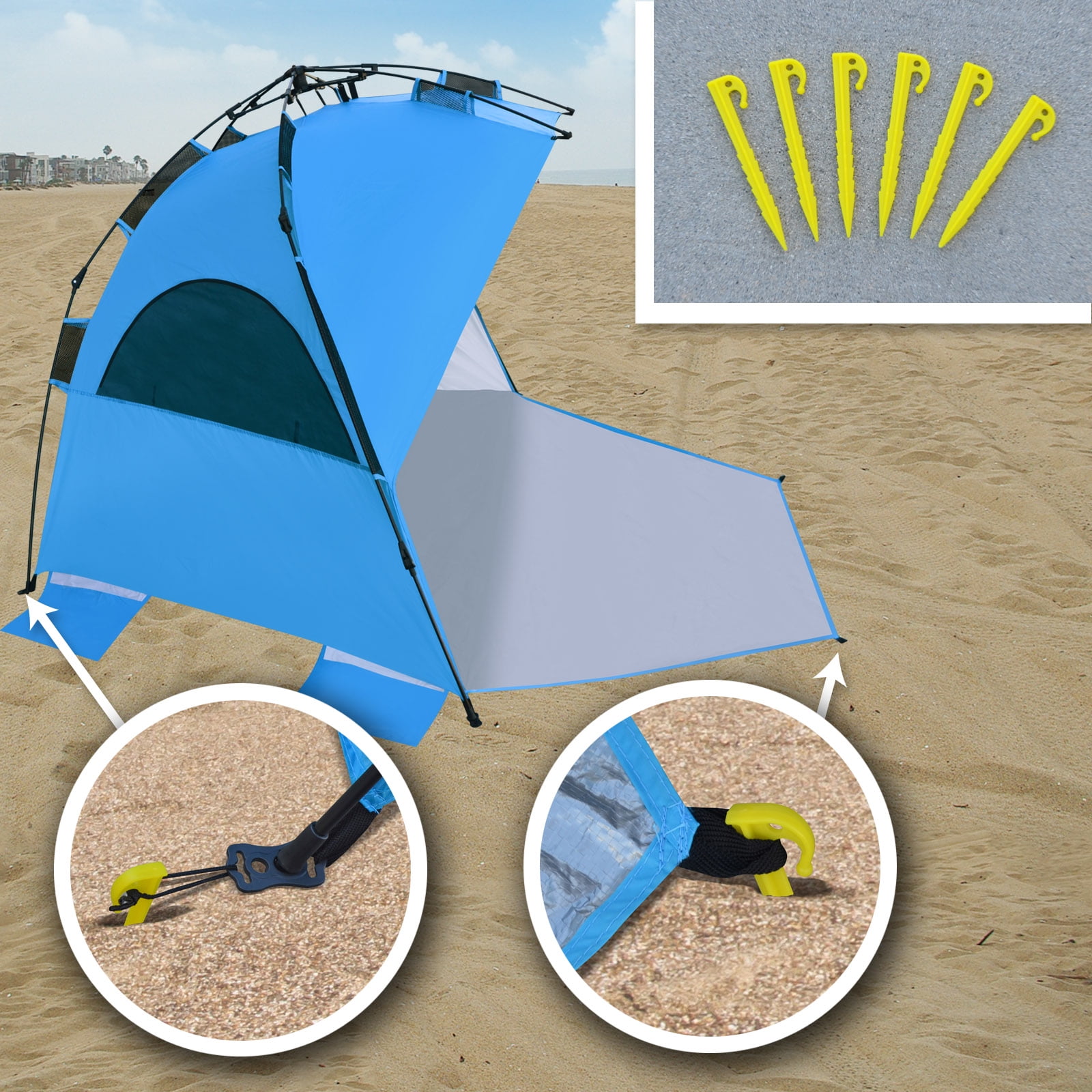 Size:94.5x 51.5x 51.5 inches(240x131x131cm); Fabric: 190T polyester taffeta silver coating/black B3 encrypted mesh (with zipper). Easy up and down: this pop up beach sun shelter can be incredibly easy to set up and take down in a minute by yourself alone. Lightweight, Automatic fiberglass frame makes this beach canopy for easy carrying. Coated material for extra UV protection. Package Includes: 1 x Camping Tent, 1 X Carry Bag, and 6 stakes