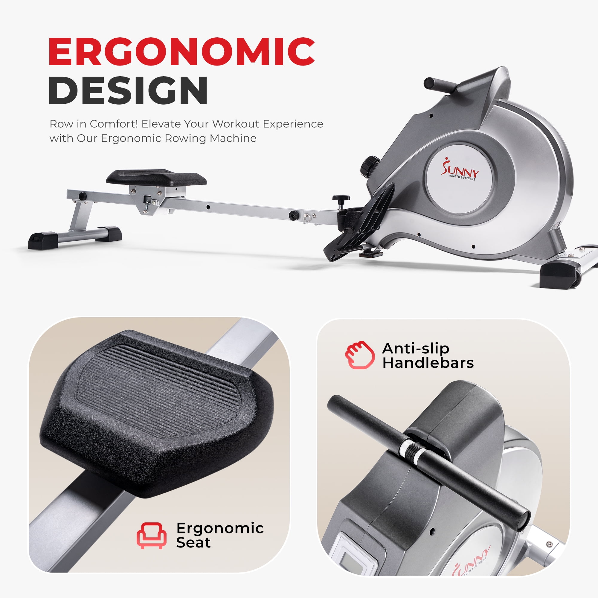 【FREE SUNNYFIT® 】 Take your workout to the next level, FREE App membership w every Sunny products. Explore 1,000+ trainer led workouts, 10,000+ virtual scenic tour simulation, access exclusive in-app social communities & leaderboards and more! 【TOTAL BODY WORKOUT】Full-body Workout with Extended Slide Rails. Engage & strengthen legs, glutes, core, back, arms & shoulders. Rowing activates multiple muscles, promoting balanced development & strength. Unlock your potential. 【EXTENDED SLIDE RAIL】At 48 inches in slide rail length, and 44 inches in inseam length, the SF-RW5515 can accommodate rowers up to 6 feet 8 inches tall. 【SUPREME COMFORT】Designed for effectiveness without compromising in comfort, its ergonomically crafted cushioned seat allows for extensive cardiovascular rowing workouts maximizing calories burned. 【CUSTOMIZABLE RESISTANCE】Achieve personalized intensity with our 8-level magnetic system. Easily adjust the knob for tailored difficulty, catering to all skill levels. Keep each workout impactful and challenging with this customizable feature. 【SPACE-EFFICIENT DESIGN】Optimize your space with our Rowing Machine. Its smart design lets you save floor space by folding the sturdy steel rail upright when not in use. Easily store it in tight spots like closets or corners, perfect for home gyms. 【SMOOTH & QUIET MAGNETIC RESISTANCE】Embrace the tranquility of our magnetic resistance system, offering silent and efficient workouts. Enjoy undisturbed exercise sessions, perfect for quiet environments, promoting wellbeing wherever you are. 【INTERACTIVE DIGITAL MONITOR】Stay motivated and track your progress with a user-friendly Digital Monitor with a clear screen that displays Time, Count, Calorie, Total Count, or Scan. Monitoring performance and allowing improvement with useful feedback. 【SAFETY ASSURANCE】Our Rowing Machine ensures stability and safety. Non-slip foot pedals with adjustable safety straps provide a secure grip. Anti-slip handlebars with soft foam grip offer comfort. Optimize performance and safety for intense workouts. 【PORTABILITY & STABILITY】Ensure stability on any surface with floor stabilizers and easily adjust for balance. Effortlessly move and store with convenient transportation wheels, no heavy lifting needed. Maximize fitness routine with added convenience. 【20+ YEARS OF EXCELLENCE】Sunny Health & Fitness, a U.S.-based company, offers top-quality equipment with a commitment to excellence. Our dedicated U.S. customer service team and certified trainers ensure a truly unmatched FIT FOR EVERYONE experience.