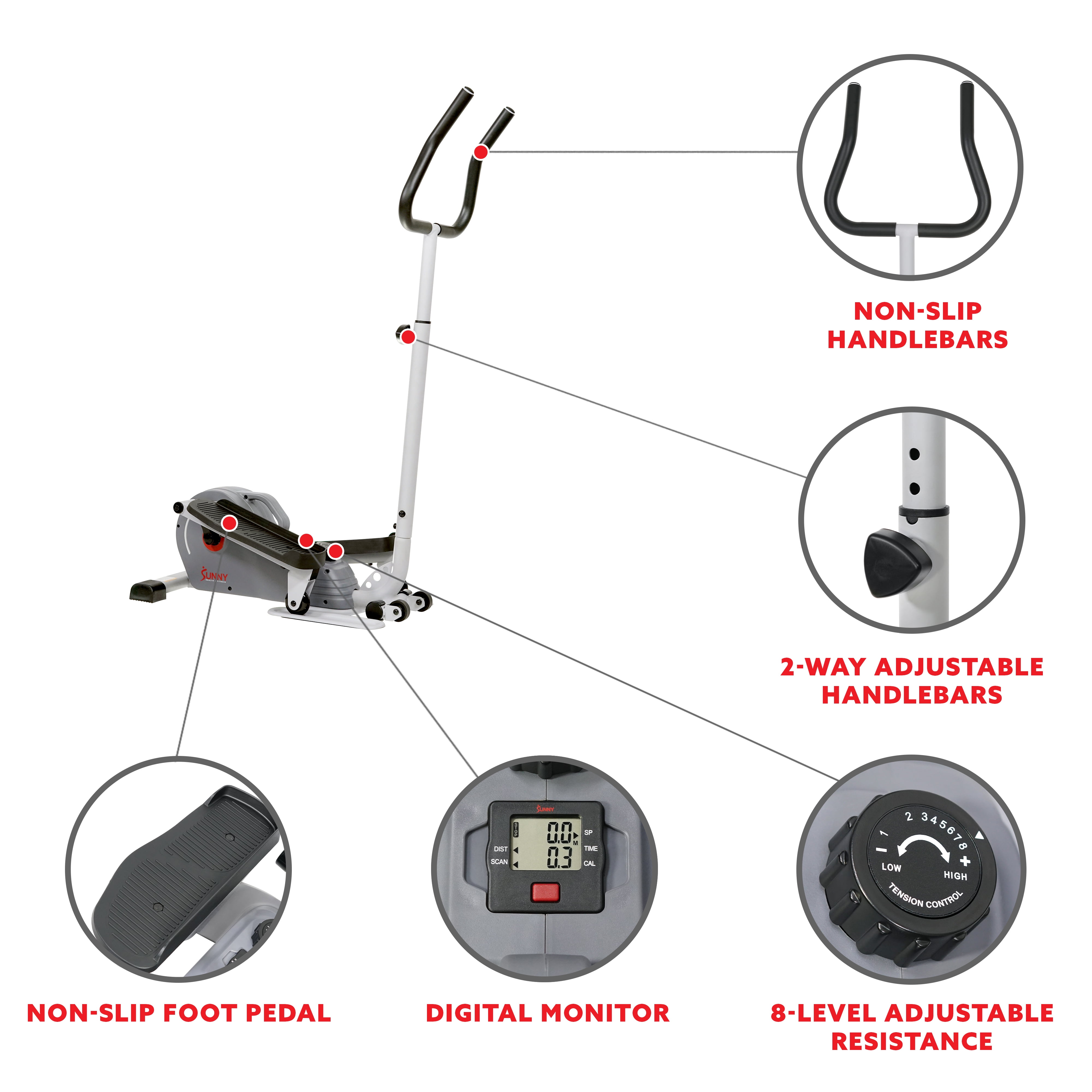 ADVANCED MONITOR: speed, time, distance, calories, and scan. BELT DRIVE: Smooth belt drive elliptical trainer produces a comfortable and quiet fitness experience. MAGNETIC RESISTANCE: 8 levels of magnetic resistance provides precise control and customization of your workouts. HANDLEBAR: The adjustable handlebar can suit users for all sizes and helps you to keep a steady grip and maintain balance. SPACE EFFICIENT: Combines the striding motion of an elliptical cross trainer with the small footprint of an exercise stepper machine. DURABLE FRAME: Engineered with sturdy materials and designed for the most intense elliptical workouts with a max weight capacity of 220 lbs. FLOOR STABILIZERS: Eliminate any wobbling and shakiness during your workouts by simply turning the floor stabilizers until level with your floor.