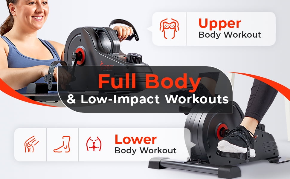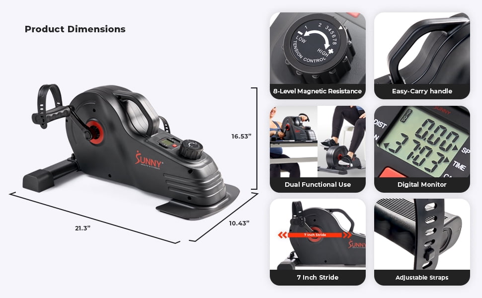 【VERSATILE EXERCISE】The under-desk pedal exerciser caters to office & remote workers, seniors, athletes, and people in rehabilitation. Its low-impact, smooth motion minimizes joint strain, providing a versatile option for various training purposes. 【CONNECTED FITNESS】 Connect to your favorite Bluetooth device & enjoy FREE SunnyFit® App membership. Explore 1,000+ trainer led workouts, 10,000+ virtual scenic tour simulation, access exclusive in-app social communities & leaderboards and more! 【UNDISTURBED EXPERIENCE】Experience the 8 levels of magnetic resistance and a belt drive mechanism, designed for minimal friction and noise disturbance. Enjoy quiet and smooth operation, making your workouts both efficient and serene. 【DUAL FUNCTION】Offering dual function for both arm and leg exercise, this equipment targets different training zones for comprehensive lower and upper body workouts. It’s ideal for fitness, rehabilitation, cardiovascular health, and muscle toning. 【JOINT FRIENDLY】Designed for low-impact exercise, this equipment minimizes stress on knees, ankles, and hips. The 3.3 lb flywheel supports two-way direction, enhancing the versatility and effectiveness of your workouts. 【HASSLE-FREE ASSEMBLY】Say goodbye to complicated setups with our straightforward instructions, including a user manual, adjustment guide, and video tutorial. Sunny customer service is ready to assist! Focusing on your fitness goals right-away! 【TRACK YOUR PROGRESS】Monitor your time, speed, distance, and calories with the built-in digital display. It is also compatible with Sunny HR200 heart-rate monitor (not included), elevating your training progress to the next intensity level! 【IT FITS!】Portable designed with 21.3*16.5*10.4″ & just 19.1LB, this exercise equipment features an easy-carry handle, adjustable foot strap, and anti-slip pedals, making it versatile for placement in home & workout space while using & storage. 【Solid Build & Warranty】Crafted from premium alloy steel and durable plastic, it delivers reliable daily performance. It comes with a 1-year Manufacturer Warranty from Sunny Health & Fitness for peace of mind. 【20+ YEARS OF EXCELLENCE】Sunny Health & Fitness, a U.S.-based company, offers top-quality equipment with a commitment to excellence. Our dedicated U.S. customer service team and certified trainers ensure a truly unmatched FIT FOR EVERYONE experience.
