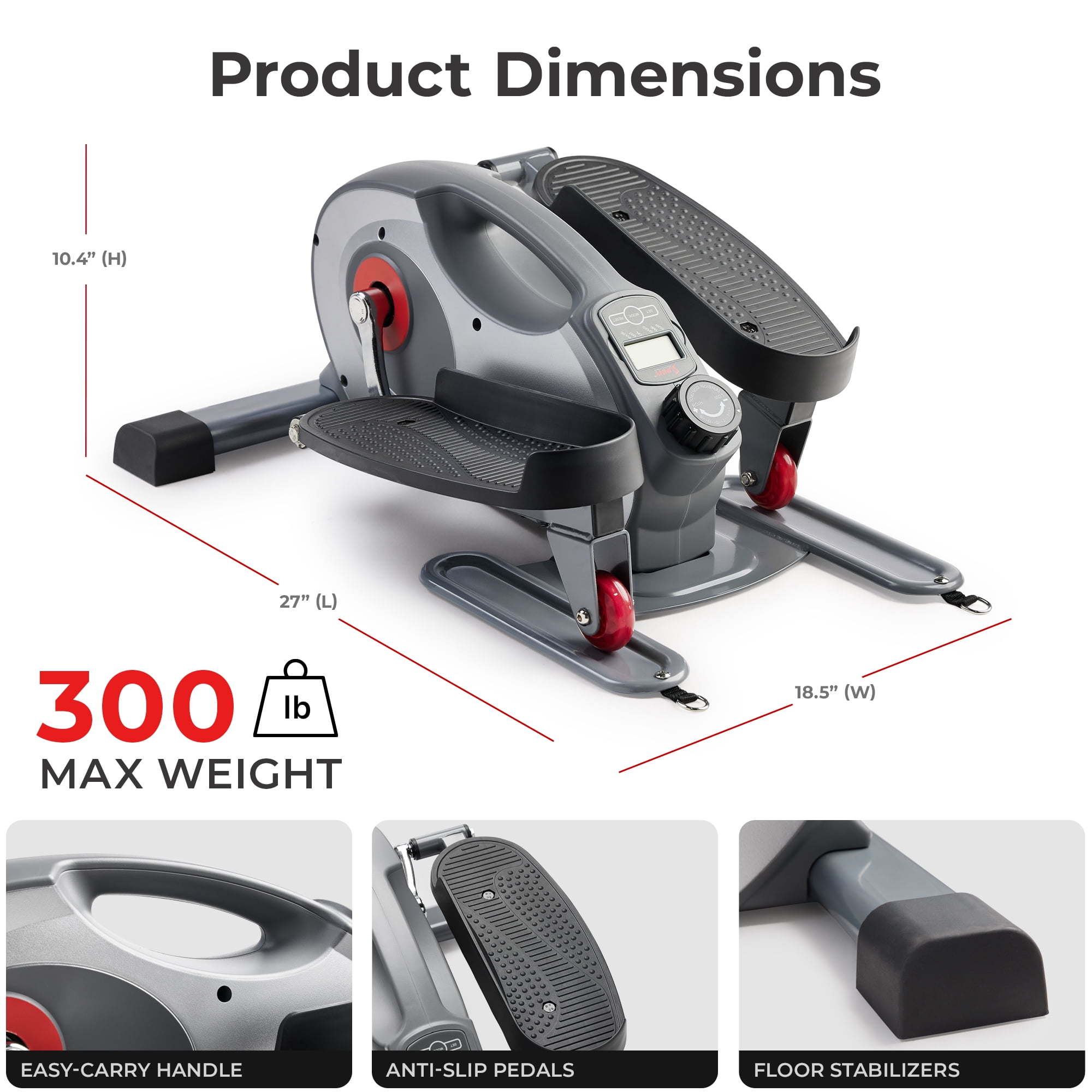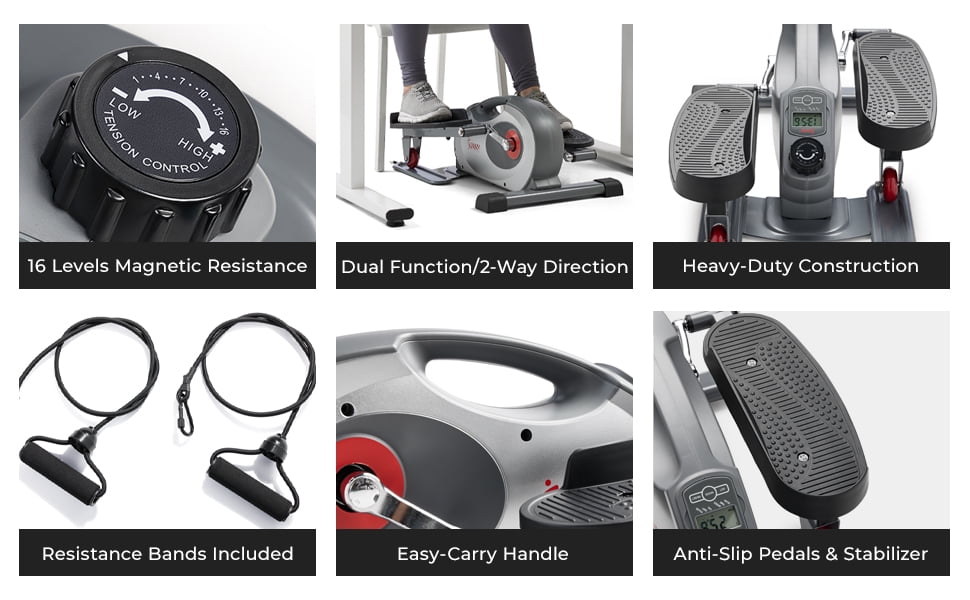 Enjoy a low-impact, full-body workout that minimizes stress on joints, promoting healthy levels of calorie burn, cardiovascular health, and muscle toning. Connect to the free SunnyFit app via Bluetooth to access over 1,000 free trainer-guided workouts, track your progress, set fitness goals, and compete with the community. Versatile design allows for both sitting and standing exercises, making it ideal for office workers, seniors, and those in rehabilitation. Crafted from heavy-duty, industrial-grade steel with a 300 lb weight capacity, offering unmatched durability and stability for all users. Experience a quiet and smooth workout with 16 levels of magnetic resistance and a belt drive mechanism. The ergonomic design and comfortable, anti-slip pedals provide a secure and effective workout experience. Monitor your time, speed, distance, and calories burned with the integrated digital display to stay informed about your progress. Compact and portable design with an easy-carry handle, removable resistance bands, and anti-slip pedals, making it perfect for use and storage in any space. Straightforward assembly with clear instructions, a user manual, and a video tutorial, supported by Sunny’s responsive customer service. Backed by over 20 years of excellence, Sunny Health & Fitness delivers top-quality equipment and a superior fitness experience for all.