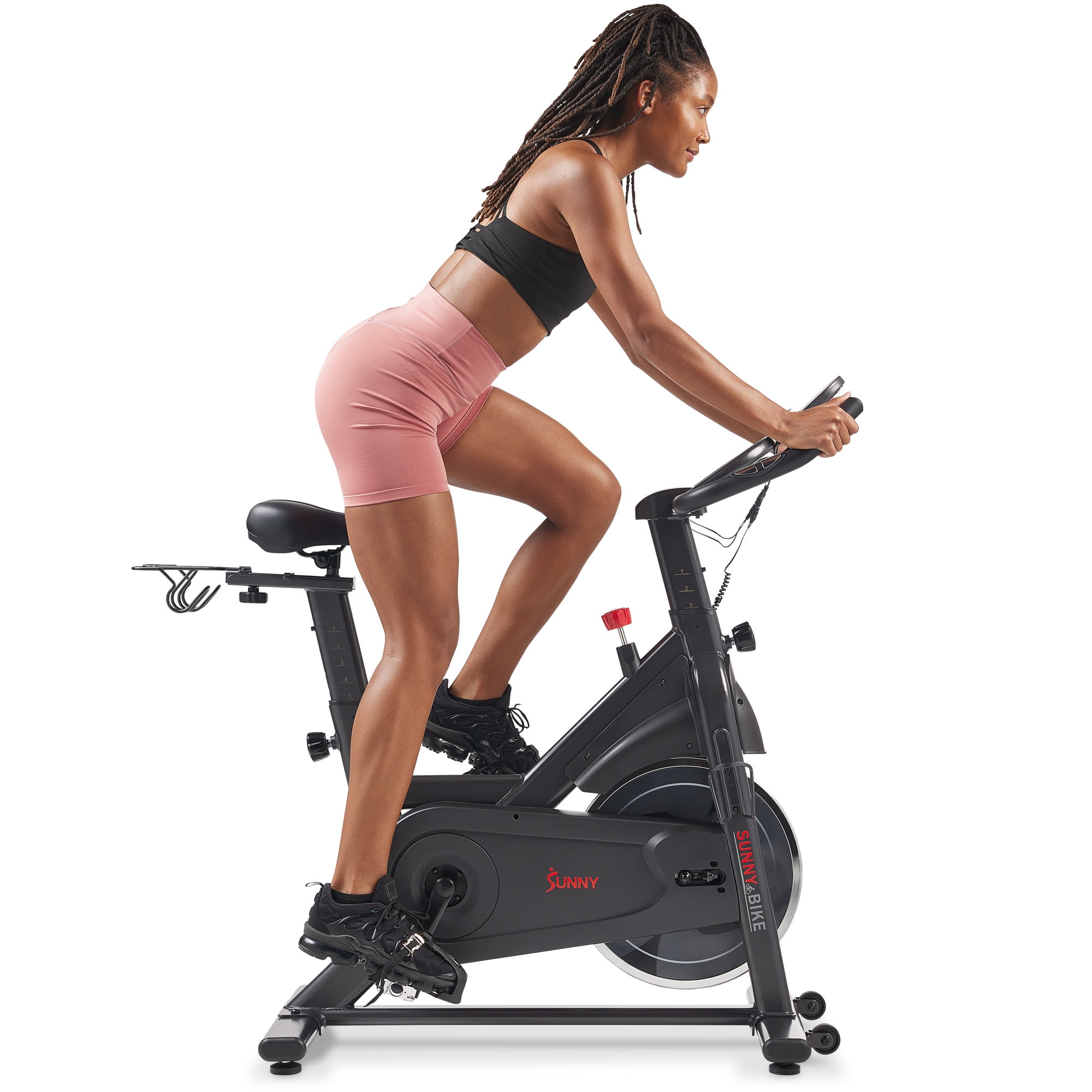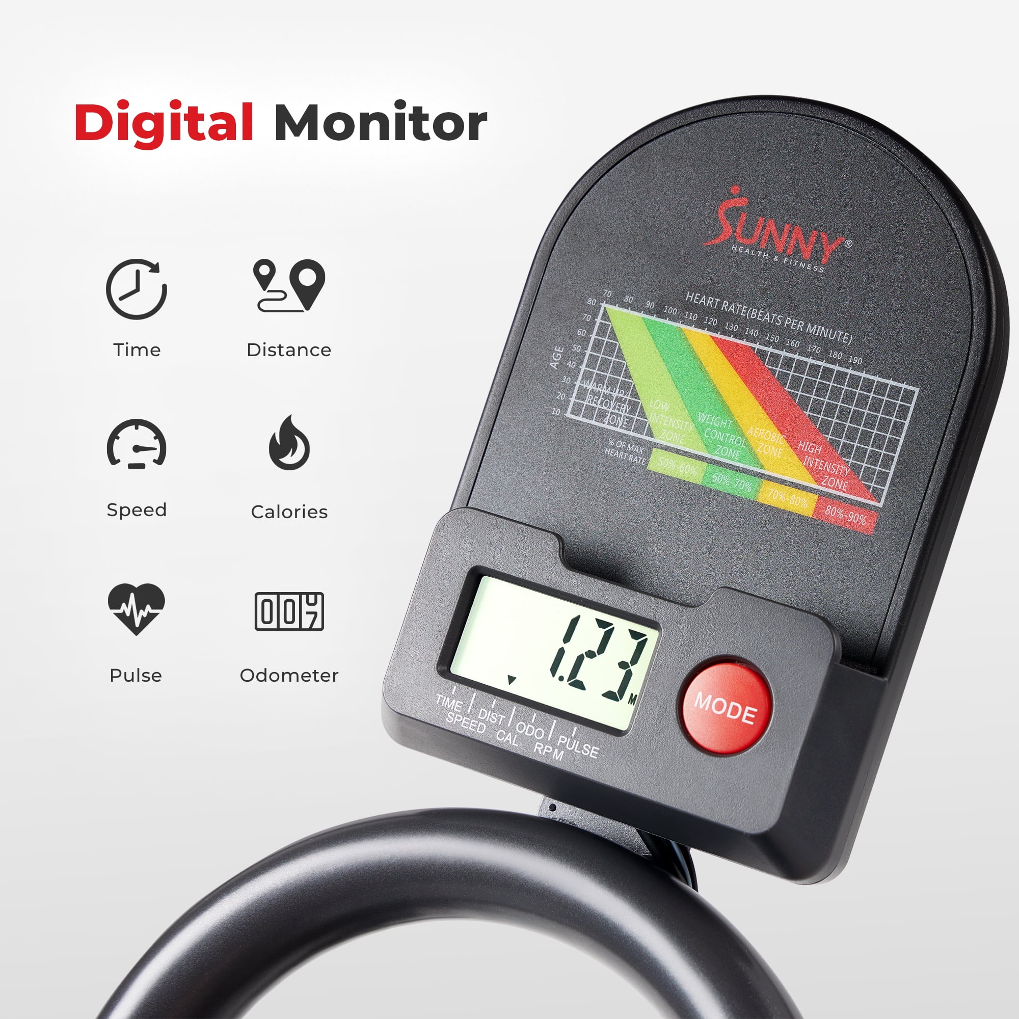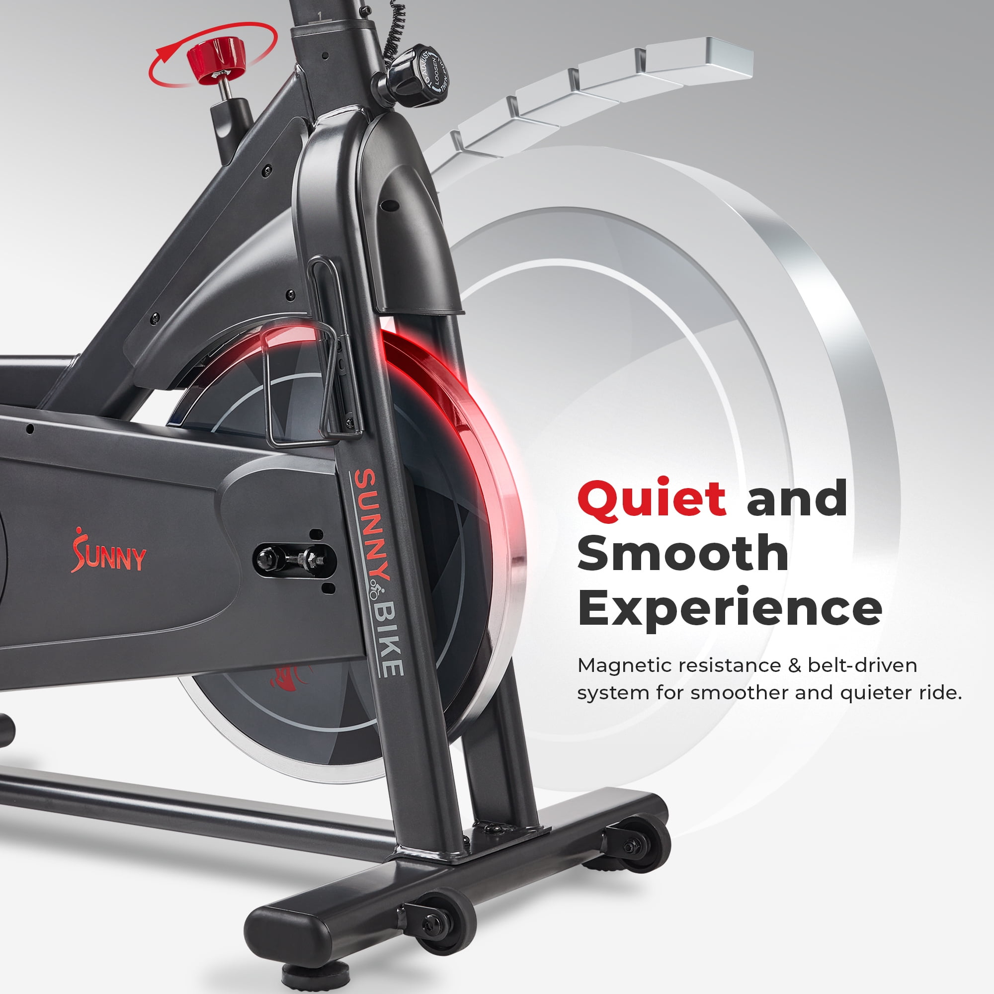CONNECTED FITNESS: With Bluetooth connectivity, the free SunnyFit app allows you to access 1000+ free trainer guided workouts and hundreds of other fitness programs. Track your progress, set fitness goals, access personalized workout plans, 10,000+ virtual scenic tour simulation and compete with other community members to get to the top of the leader board. Have all the workouts of your choice right at your fingertips, while also feeling supported as a member of this likeminded community. WHISPER-QUIET PERFORMANCE Enjoy frictionless magnetic resistance for precise fitness level adjustments. Belt-driven with a 22 LB flywheel, it offers smooth pedaling and customizable challenges. LOW-IMPACT CARDIO The perfect bike for fitness pros seeking home workouts. It provides core-targeting, low-impact cardio exercise. Its ergonomic handlebars with contoured padding ensure comfort for intense sessions. DURABLE CONSTRUCTIONA robust steel frame, this exercise bike can endure intense workouts and support up to 300 LB Its sturdy, durable design ensures stability for various body types, promoting inclusive fitness. ADJUSTABLE SEAT & HANDLEBARS Enjoy a tailored ride with the bike’s 4-way adjustable seat and 2-way adjustable handlebars. They cater to all body types and allow full customization for a personalized, comfortable cycling journey. EASY-TO-READ DIGITAL MONITOR Easily monitor your workout with the digital display showing time, speed, distance, calories, RPM, and pulse. Stay motivated and track your fitness journey effortlessly. CONVENIENT HOLDERS This bike features an integrated dumbbell holder and a sturdy bottle holder for strength training and hydration. Alongside a tablet holder, it combines essentials for a seamless fitness routine. Sunny Health & Fitness Commitment A top fitness brand for 20+ years, offers superior products and a dedication to excellence. Count on our committed customer service and trainers for the best fitness experience.