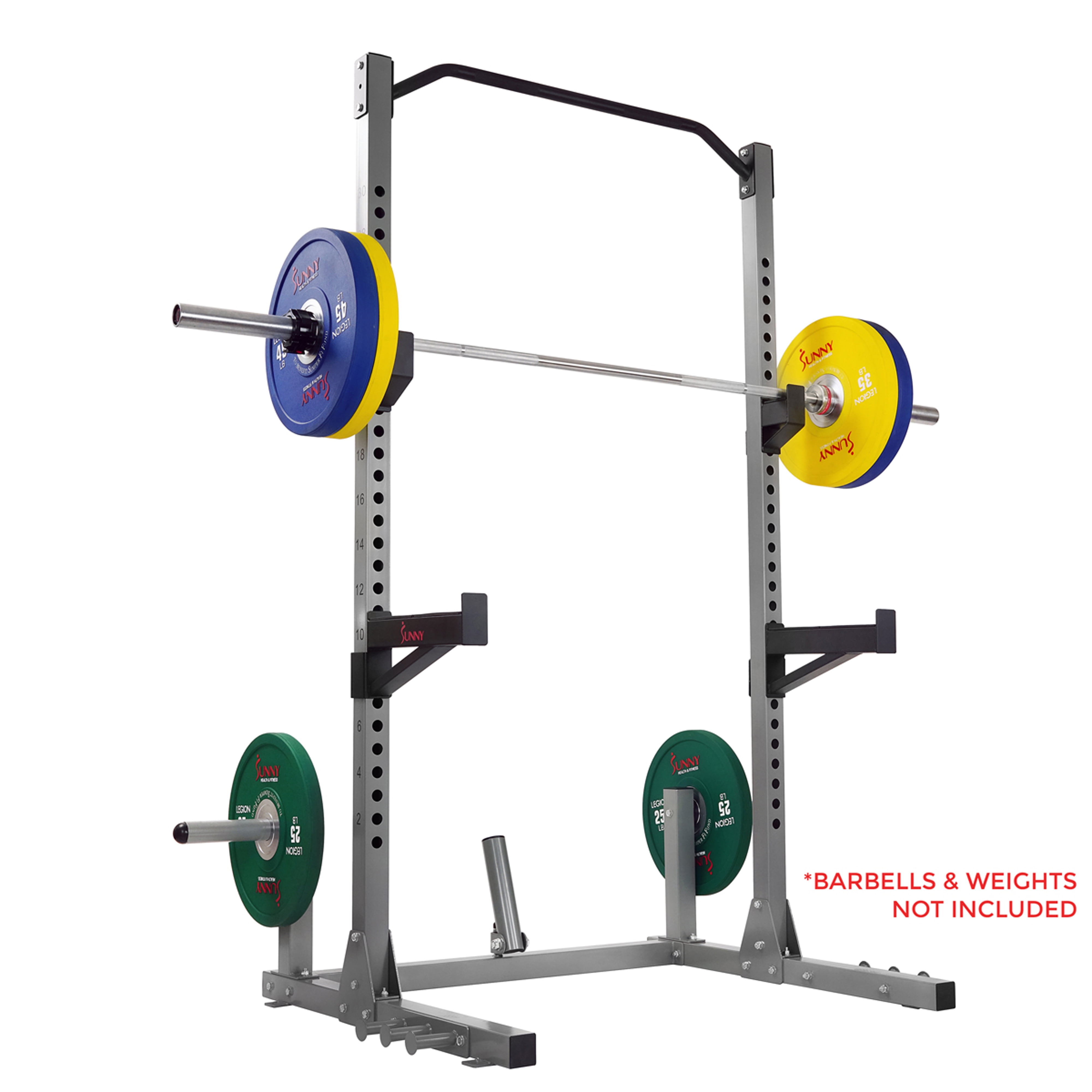 Take your home gym to the next level with the Sunny Health & Fitness BH6802 Power Rack. The full functional power rack is designed with a small footprint in mind to tackle the big workouts of the day. Combine the Sunny Health and Fitness bars and bumper plates and perform workouts to target and strengthen muscles across your body. The powder-coating, durability, and utility are designed seamlessly into the power rack to fully support weight and power lifting workouts. The compact gym rack lets you work out right in the comfort of your own home or garage. The result: A fully loaded power rack with features such as the included 360° swivel built-in landmine post, raised height pull up bar, exercise band attachment points, durable J-hook and Spotter arms, as well as more than 30 adjustment points to fit people of all sizes. The squat rack is built with ample room to provide easy side-to-side movement. Now you can perform squats, curls, shrugs, pull ups, pushups, and more. Your takeaway: A well-designed and small footprint rack that will help you build the Rome that is your body. We all know Rome wasn’t built in a day. Your body won’t be either but the Sunny Power Rack will help you get there one day at a time. Whether you are an experienced powerlifter, bodybuilder, or someone just starting out on their strength training journey, this power rack can keep up. Unleash your inner beast with the SF-BH6802 Power Rack by Sunny Health and Fitness. Hardware peg hole diameter: 1 in.