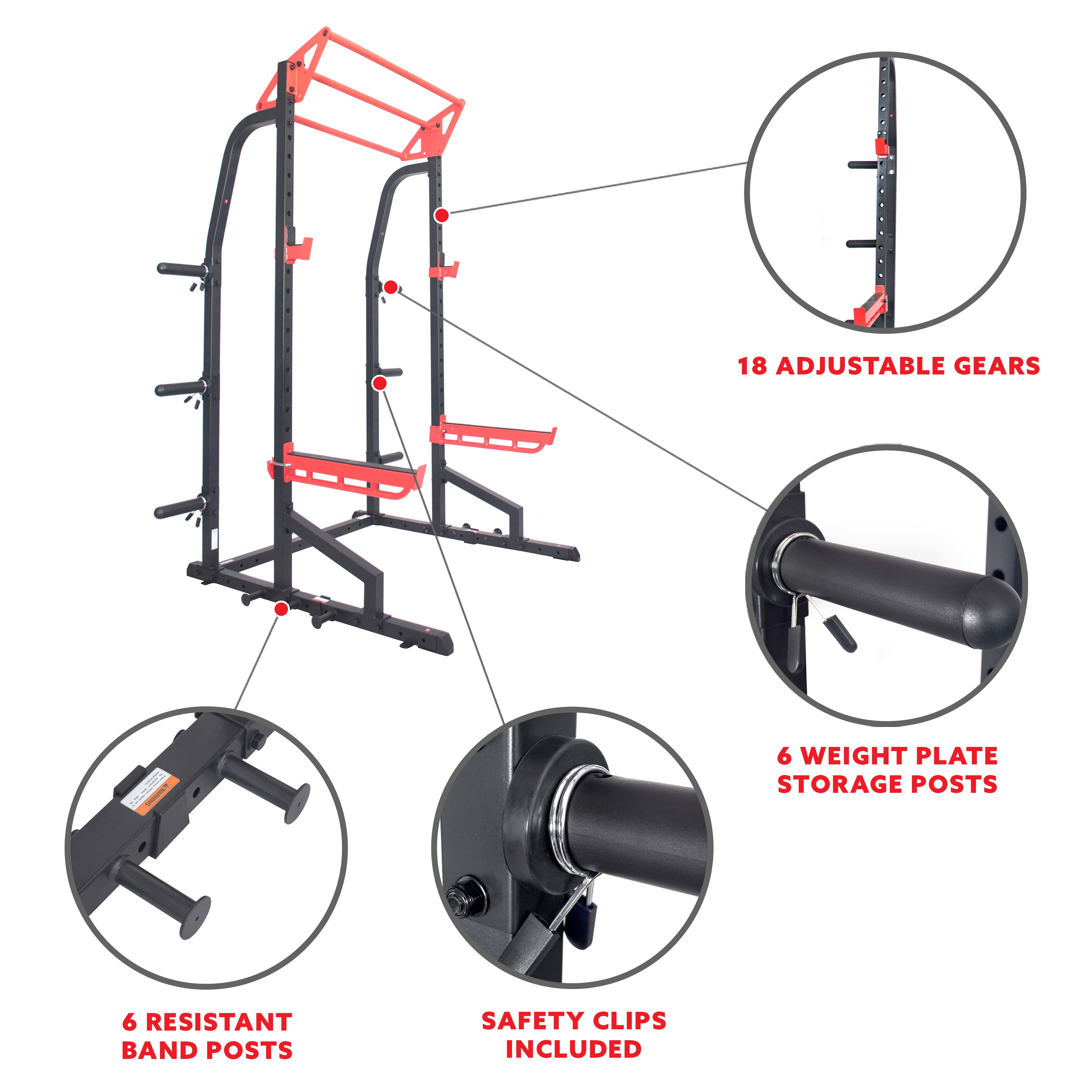 HALF TON CAPACITY: Look no further for the ultimate in high capacity Power Racks; with a 1000 LB max weight capacity, you could make serious gains and push pass your limits. LAT PULL DOWN ATTACHMENT: The separately sold Sunny Health & Fitness Lat Pull Down Attachment increases the types and variations to your workouts. Strengthening different muscles and switching up your routine. HIGH PERFORMANCE QUALITY: Built for the most toughest and demanding of workouts. 2” x 2” high quality steel pipe construction makes this one of the most durable strength cages around. STABILITY AND STORAGE: 6 separate weight plate storage along the rear of the power rack helps to add stability to the overall structure. SAFETY AND PERFORMANCE: Adjustable J-hooks and spotter arms with 18 settings give you a peace of mind as you focus on your strength training. RESISTANCE TRAINING: Attach resistance bands to the pegs located near the bottom of the SF-XF9933 Half Rack Power Cage to add additional resistance training to your strength exercises. ADJUSTABLE PULL UP BAR: The pull up bars could be adjusted with settings to suit your height or type of workout. COMPATIBLE WITH: SF-BH620037, SF-BH620038, SF-BH6920, SF-BH6921, SF-BH622045, SF-BH6996, SF-XF9927, SF-XFA001, SF-XFA002, SF-XFA003, SF-XFA004, SF-XFA005, SF-XFA006, SF-XFA007, SF-XFA008, and SF-XFA009
