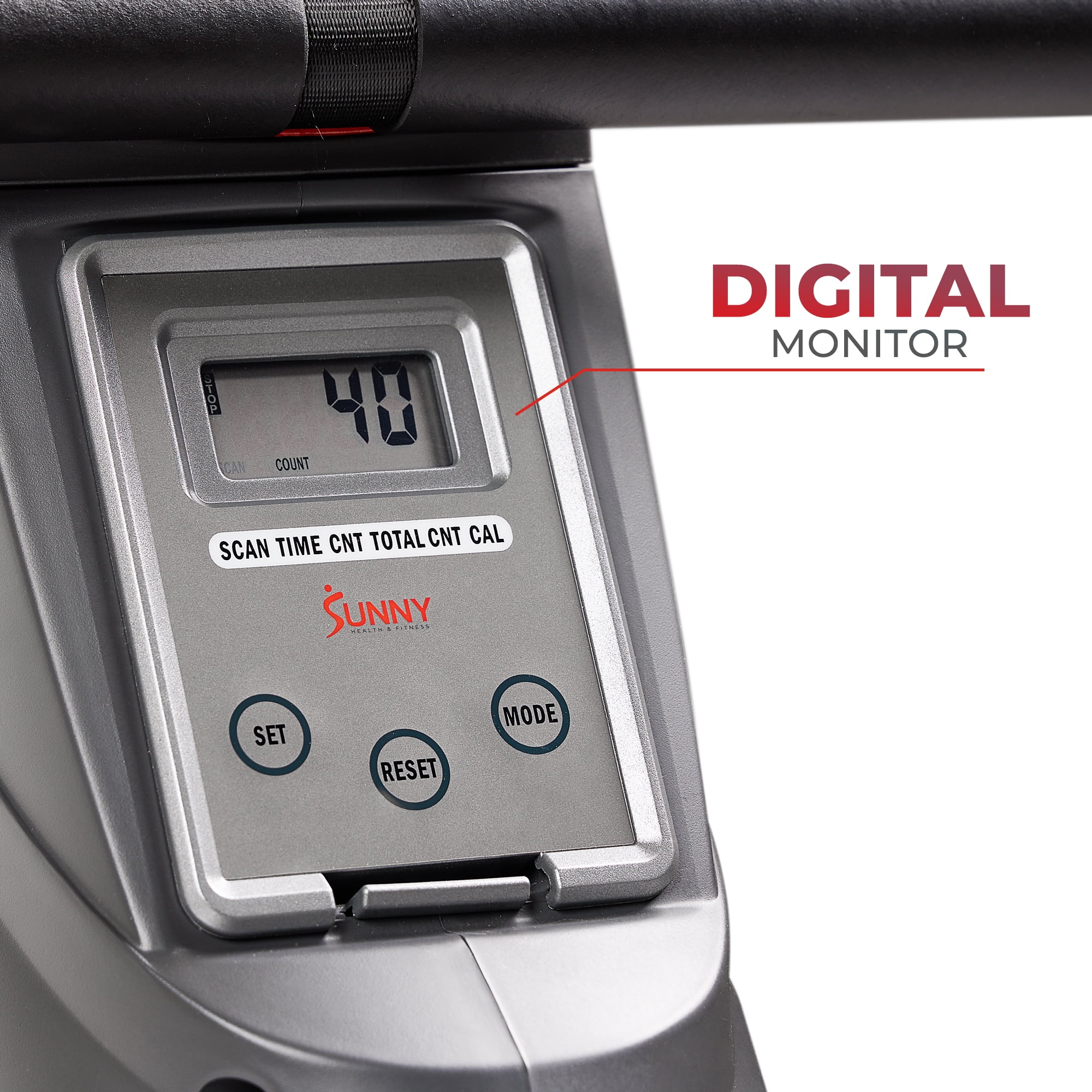 CONNECTED FITNESS: With Bluetooth connectivity, the free SunnyFit app allows you to access 1000+ free trainer guided workouts and hundreds of other fitness programs. Track your progress, set fitness goals, access personalized workout plans, 10,000+ virtual scenic tour simulation and compete with other community members to get to the top of the leader board. Have all the workouts of your choice right at your fingertips, while also feeling supported as a member of this likeminded community. 【UPPER BODY ROWS】 Isolate and target your upper body muscle groups by using the floor plates for different standing row positions. 【16 LEVELS OF RESISTANCE】 16 levels of adjustable magnetic resistance provide versatility and customization for rowers of all levels. 【SMOOTH & DURABLE】 The rowing mechanism features a distinctive Volute Spring System for seamless rebounds and rows. Designed to accommodate a max user weight of 285 LB, the rower also offers a cushioned molded seat for added comfort during workouts. 【FOLDABLE SLIDE RAIL】 Foldable design allows for more convenience and easy storage. 【DIGITAL MONITOR】 Display Time, Count, Total Count, Calories, and Scan. Stay focused on your fitness goals and exercise metrics. 【DEVICE & BOTTLE HOLDER】 Keep your engagement high by using the holder tray for your mobile device during workouts. Stay hydrated between sessions to ensure you can keep rowing and push through the distance effectively. 【Sunny Health & Fitness Commitment】 A top fitness brand for 20+ years, offers superior products and a dedication to excellence. Count on our committed customer service and trainers for the best fitness experience