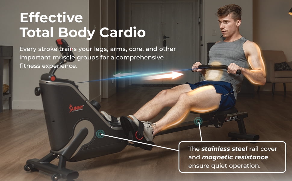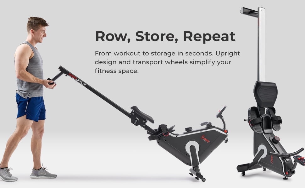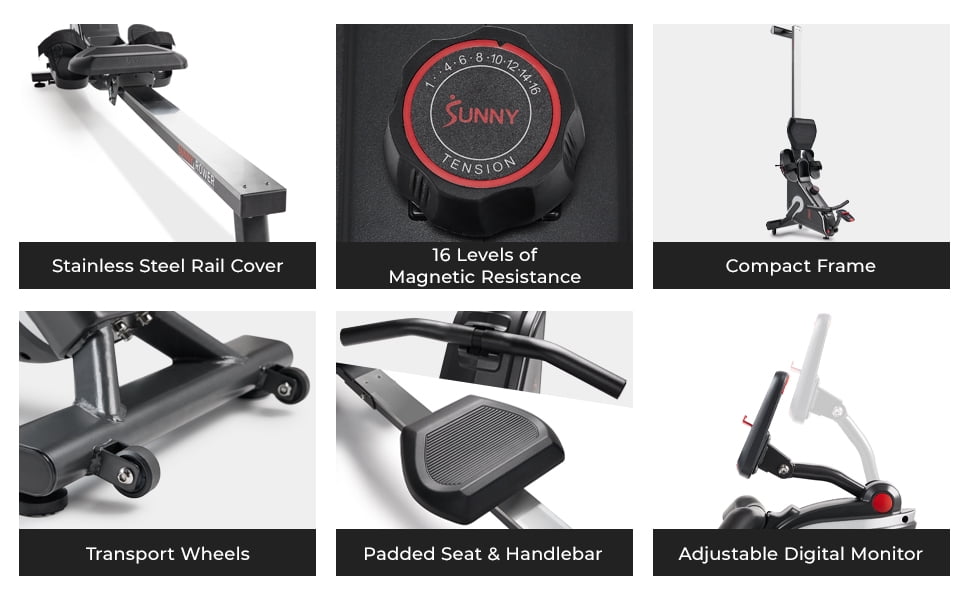 Compact and sleek design fits effortlessly into your lifestyle and can be stored upright to save space. 16 levels of whisper-quiet magnetic resistance accommodate users of different fitness levels, providing a smooth and comfortable rowing experience. Supports up to 300 lb user weight, making it suitable for a wide range of users. Cushy padded seat and ergonomically curved handlebar ensure ultimate comfort during your workout. Adaptable semi-pivoting pedals allow for perfect form and flexibility, reducing wrist strain. Easy-to-read monitor can track your heart rate when paired with the optional HR200 heart rate monitor, streamlining your fitness metrics. Portable and easy to move design with built-in transportation wheels allows you to quickly tuck it away when not in use. Dual magnetic sensor provides precise tracking of time, count, distance, total count, calories, SPM, T/500m, and pulse. Compatibility with the SunnyFit app unlocks access to over 1,000 trainer-led workouts and 10,000+ scenic virtual tours, helping you achieve your fitness goals. Simple assembly with user manual, adjustment guide, and video tutorial ensures a hassle-free setup process. Backed by Sunny Health & Fitness’s 20+ years of expertise in the fitness industry and dedicated customer support, you can trust the quality and reliability of this product.