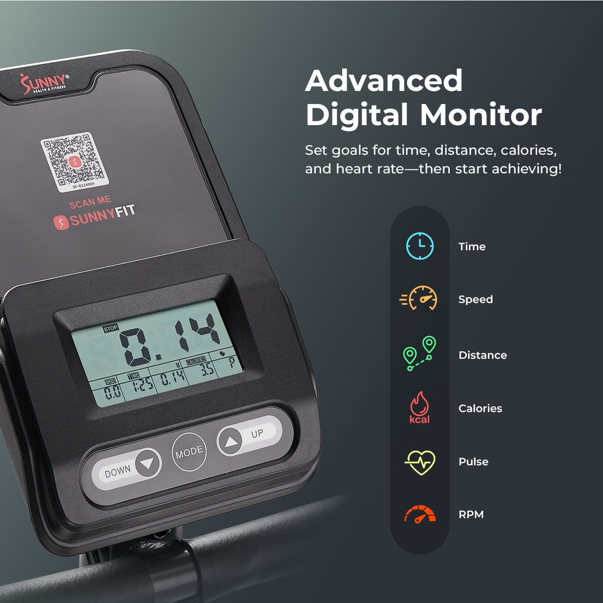 SMART FITNESS: Ride along with Sunny Health & Fitness expert trainers on the Sunny Health & Fitness SunnyFit® APP. Connect your preferred mobile device through Bluetooth and view your performance metrics in real-time. SUNNYFIT® APP: The all-new SunnyFit® APP takes your Sunny workouts to the next level! View your live metrics displayed in real-time as you tour the world with real location maps. Get the results you want with customized workout plans. Explore 500+ workout videos that fit your schedule and goals. Compare your results on the exercise bike leaderboard, share your fitness experiences, get workout tips, and much more! LARGE FLYWHEEL: The internal 9 LB flywheel can generate more inertia than similar bikes in its class. This provides a smoother ride as it builds momentum for those intense stationary bike workouts. EXTRA LARGE SEAT: Measuring over 3 inches thick, the extra-large, padded seat provides unparalleled comfort and support for an indoor exercise bike. MAGNETIC RESISTANCE: Contactless resistance using internal magnets offers a much smoother and streamlined ride compared with felt, leather, or other types of contact resistance mechanisms. DEVICE HOLDER: Control your in-workout entertainment and learning experiences with the built-in tablet mount. Play your favorite movies or follow your favorite Sunny exercise workout videos. ADJUSTABILITY: Adjust the 4-way adjustable seat to find a position that works for you. Adjust the ground stabilizers to ensure the bike is even on in-home surfaces. HEART RATE SENSOR: Monitor your cardiovascular performance with the built-in pulse-sensing grips so you can actively check your workout progress, displayed on the digital monitor. BOTTLE HOLDER: Stay hydrated to be ready to exercise for extended training sessions. Ride along with Sunny Health & Fitness expert trainers on the Sunny Health & Fitness SunnyFit® APP. Connect your preferred mobile device through Bluetooth and view your performance metrics in real-time. With Bluetooth connectivity, the free SunnyFit app allows you to access 1000+ free trainer guided workouts and hundreds of other fitness programs. Track your progress, set fitness goals, access personalized workout plans, 10,000+ virtual scenic tour simulation and compete with other community members to get to the top of the leader board. The internal 9 LB flywheel can generate more inertia than similar bikes in its class. This provides a smoother ride as it builds momentum for those intense stationary bike workouts. Measuring over 3 inches thick, the extra-large, padded seat provides unparalleled comfort and support for an indoor exercise bike. Contactless resistance using internal magnets offers a much smoother and streamlined ride compared with felt, leather, or other types of contact resistance mechanisms. Control your in-workout entertainment and learning experiences with the built-in tablet mount. Play your favorite movies or follow your favorite Sunny exercise workout videos. Adjust the 4-way adjustable seat to find a position that works for you. Adjust the ground stabilizers to ensure the bike is even on in-home surfaces. Monitor your cardiovascular performance with the built-in pulse-sensing grips so you can actively check your workout progress, displayed on the digital monitor. Stay hydrated to be ready to exercise for extended training sessions.